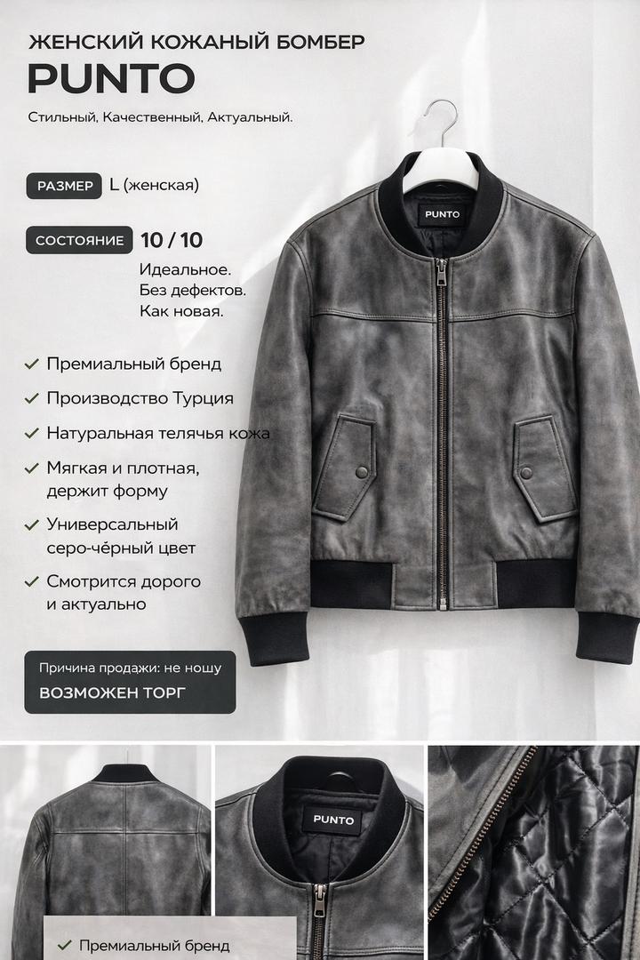 Продам кожаный бомбер Punto,раз.L. Премиальный бренд. Кожа мягкая телячья. Утепленный бомбер, можно носить до поздней осени. Производство Турция. Состояние и качество отличное, мало носила совсем. Продам срочно в связи с переездом. Артикул: 581200