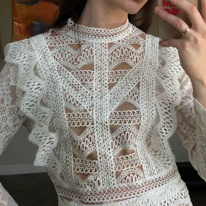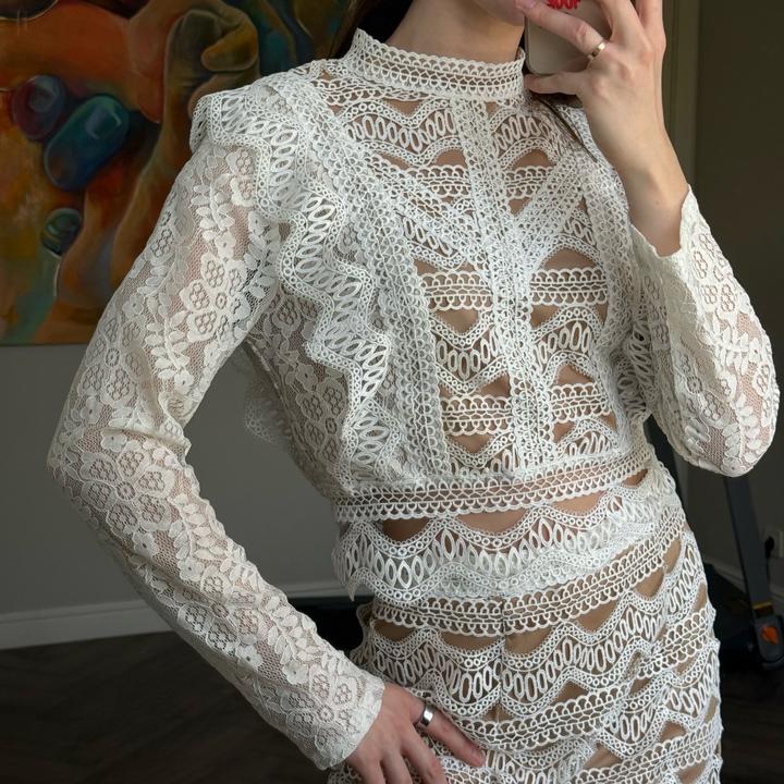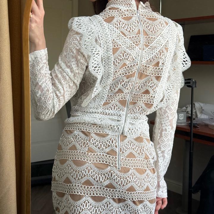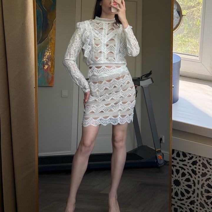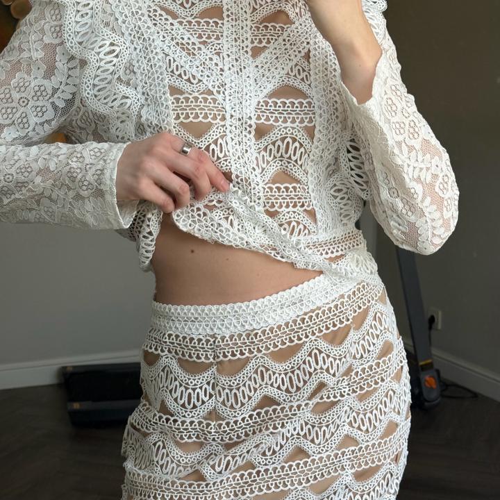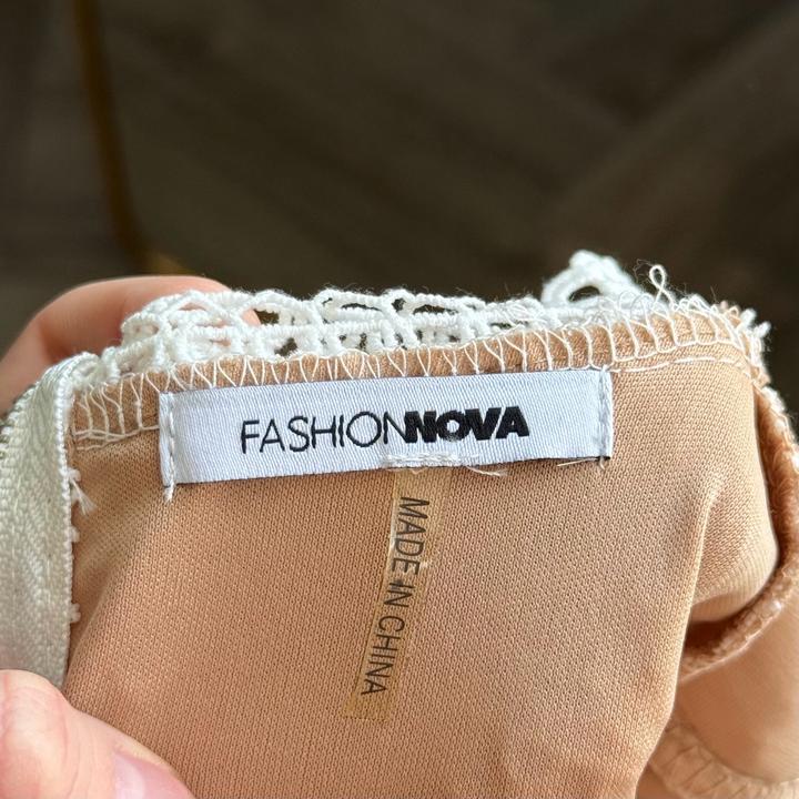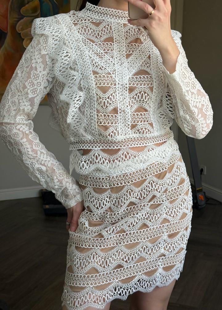 Бело-бежевый костюм FashionNOVA подойдет на 42-44, юбка и кофточка сзади на замке, одевался 1-2 раза, не более. В отличном состоянии. Артикул: 581407