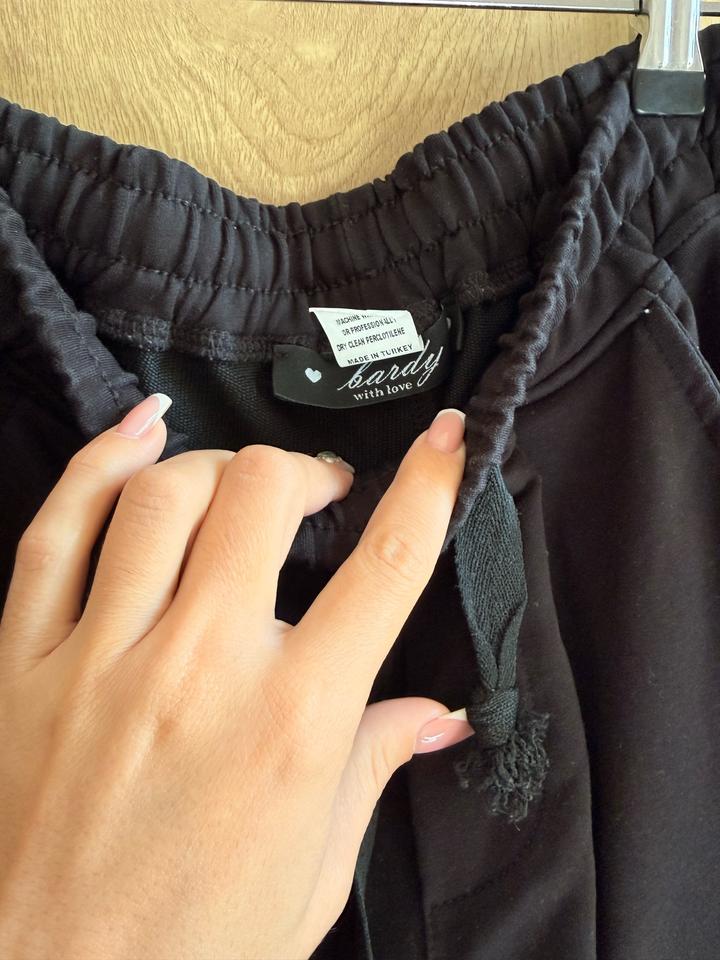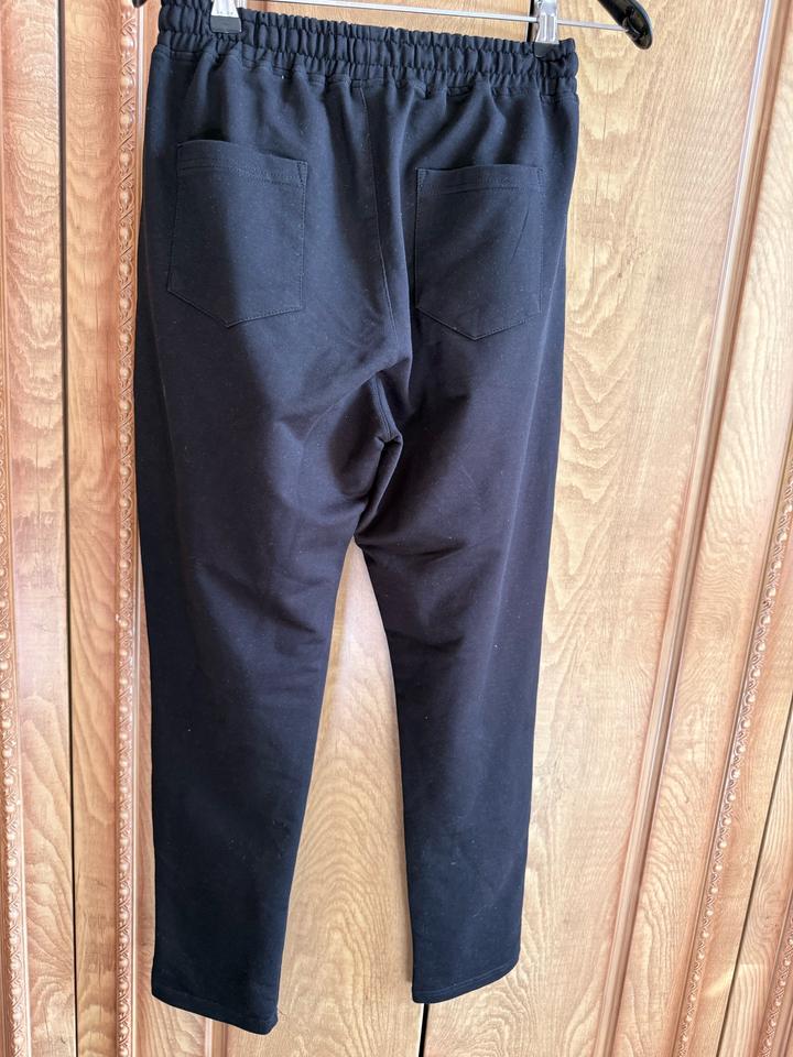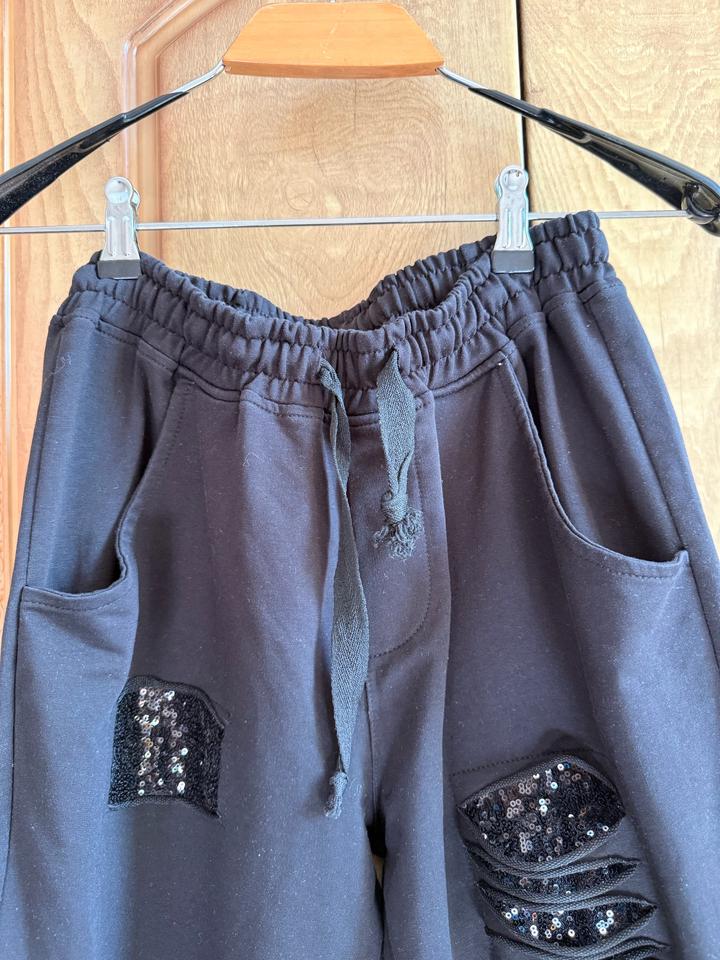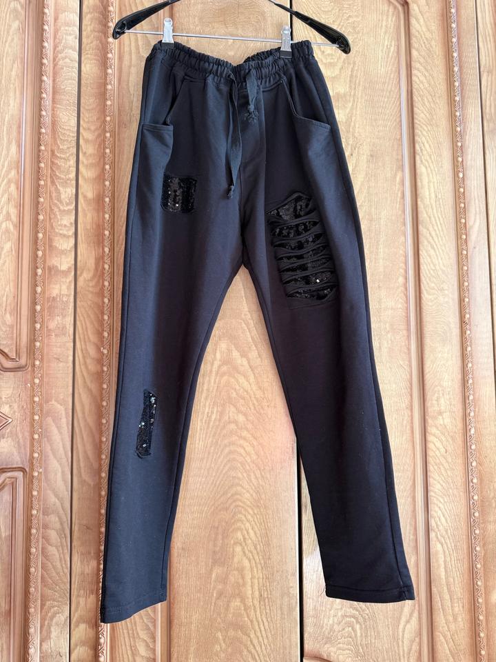 Стильные чёрные брюки с акцентным декором и пайетками. Лёгкая ткань, не плотные — комфортны в носке. Свободная посадка, резинка на талии со шнурком. Покупались в Турции, ни разу не надевались — состояние новое. Отличный вариант для повседневного образа с характером. Размер M. Артикул: 581475