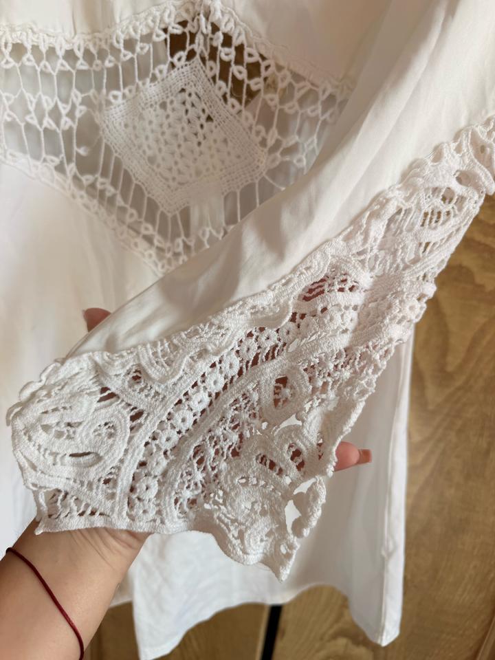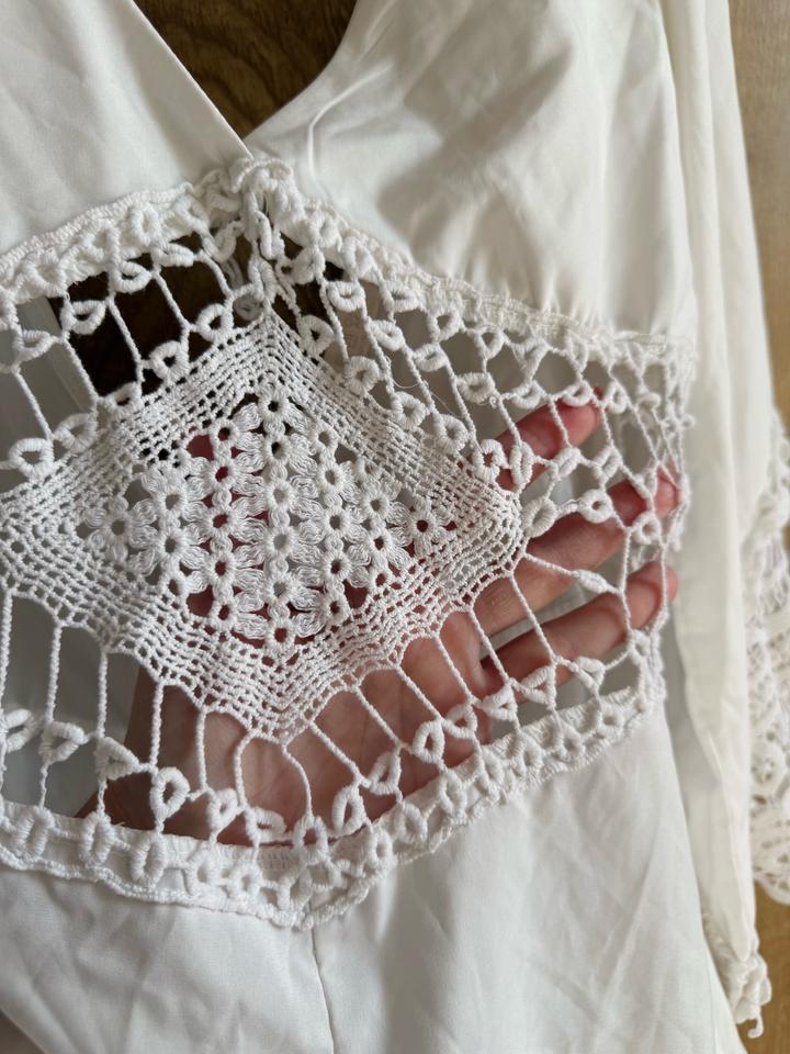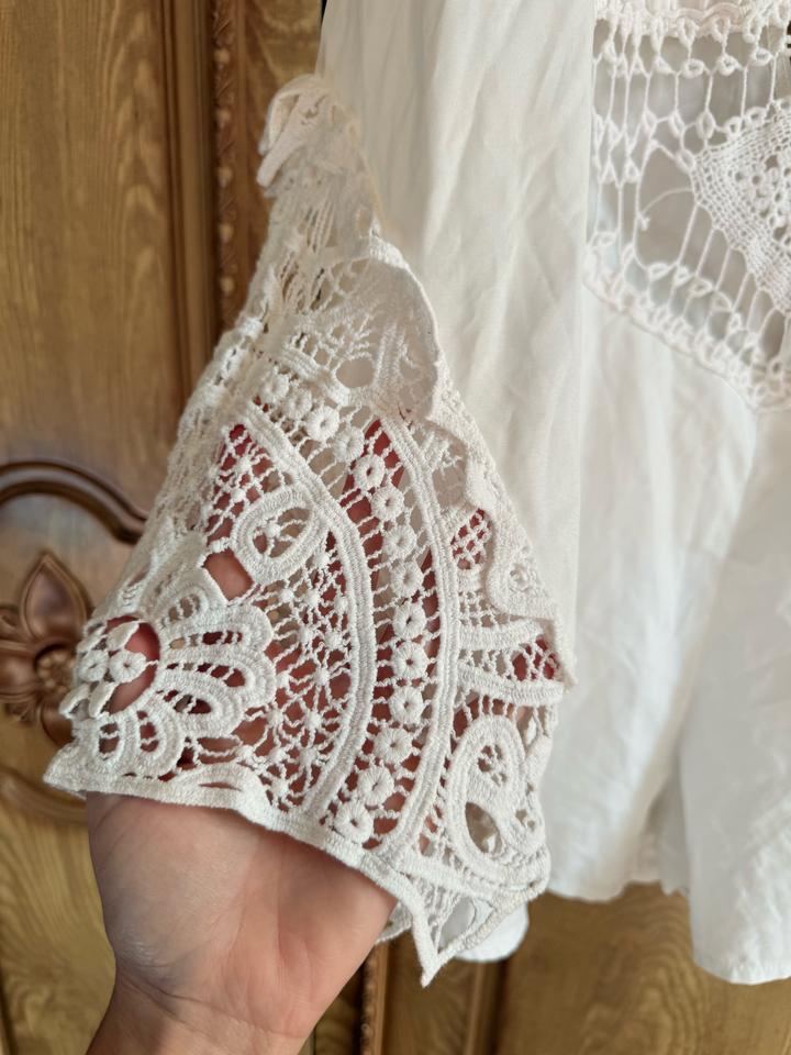 Очень редкая и визуально дорогая вещь. Смотрится как дизайнерский бохо-комбинезон с эффектом платья — тот самый вариант, когда спрашивают: «Где ты это взяла?» ✔ красивое декольте + открытая спина ✔ вставки из кружева ручной работы (очень дорогой вид) ✔ рукава с ажурной отделкой ✔ лёгкая струящаяся ткань ✔ выглядит как платье, но внутри шорты — супер удобно Идеален: — для фотосессий — на отпуск / море — на мероприятие, где хочется выделиться Размер: S–M Состояние: хорошее Артикул: 581560