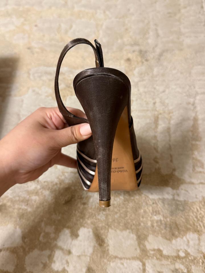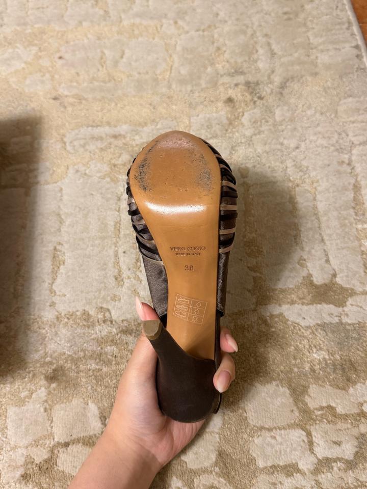 Итальянские каблуки с открытым носом Vero Cuoio Размер 38 Каблук 9-10 см В хорошем состоянии, единственное на каблуке с внутренней стороны немного разошлась ткань. Но дырок, потертостей, царапин нет Артикул: 581818