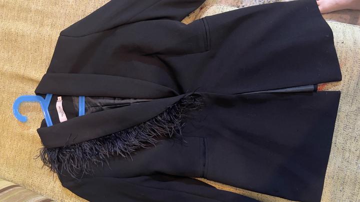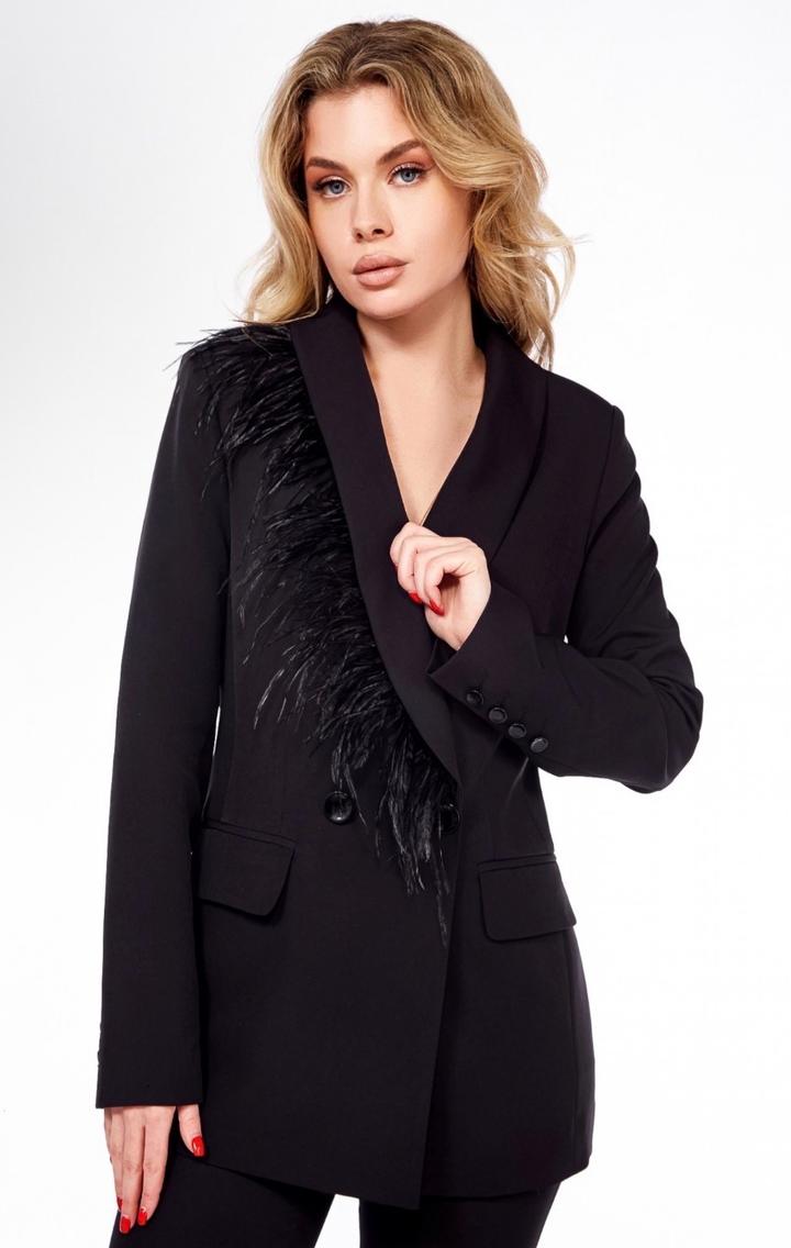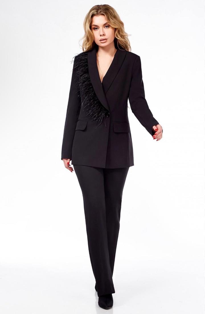 Черный комплект, на пиджаке страусиные перья, размер 42. Брюки прямые на рост 165-168 см идеально Артикул: 581941