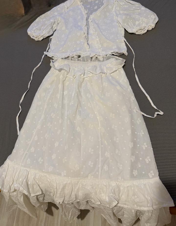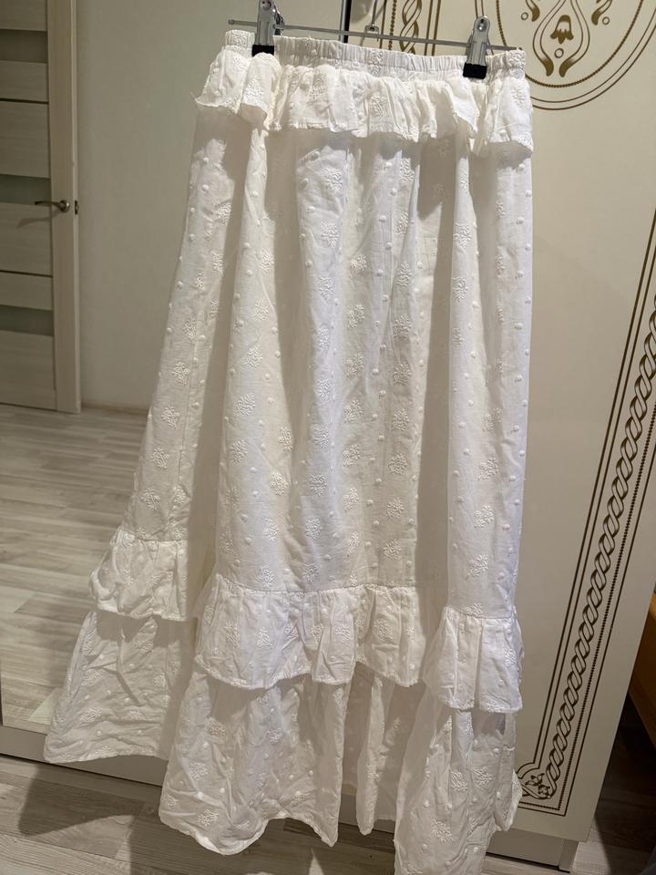 Продаю комплект из юбки и кофты в белом цвете, размер S. Юбка-солнце длинная, не просвечивает. Кофта с коротким рукавами и завязками на талии. Очень красивый и нежный образ для лета!!!Носила 3-4 раза. В хорошем состоянии. Артикул: 582018