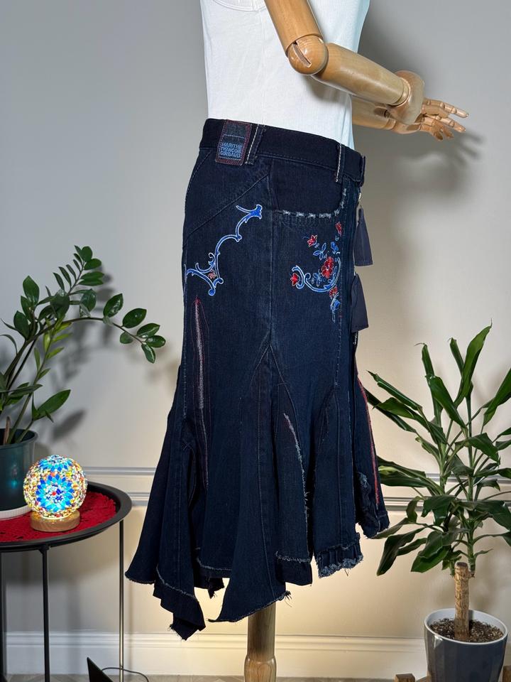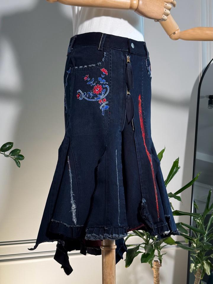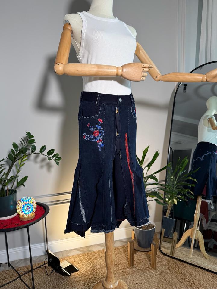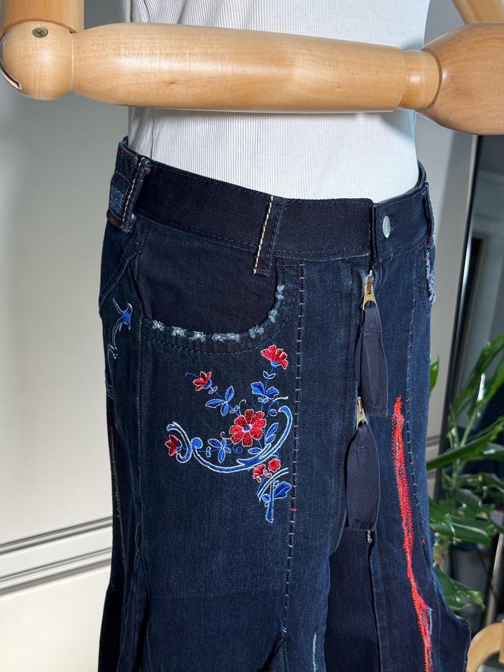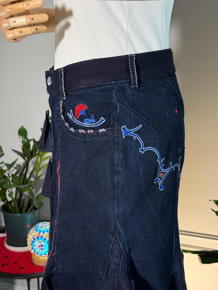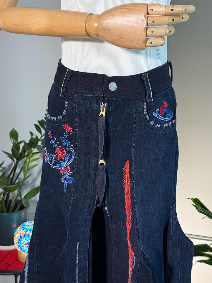 • Размер: XS-S (длина ~63 см, ширина по талии 38 см, ширина по бёдрам 44 см) • Состав: 100% хлопок • Состояние: 10 из 10 • Комментарий: Джинсовая юбка-русалка в стиле Y2K от французских дизайнеров и супругов Марите Башеллери и Франсуа Жирбо 🧜♀️ Фасон юбки-русалки длины миди - красиво облегает бёдра, резко расширяется к низу, имеет ассиметричный подол. Впереди застегивается на молнию, посадка высокая. Декорирована вышивкой в цветочных мотивах, сзади вышиты имена дизайнеров бренда. Артикул: 582262