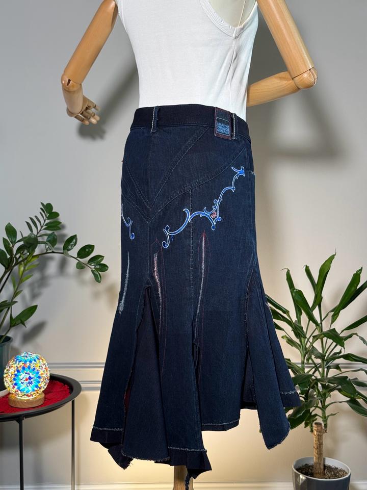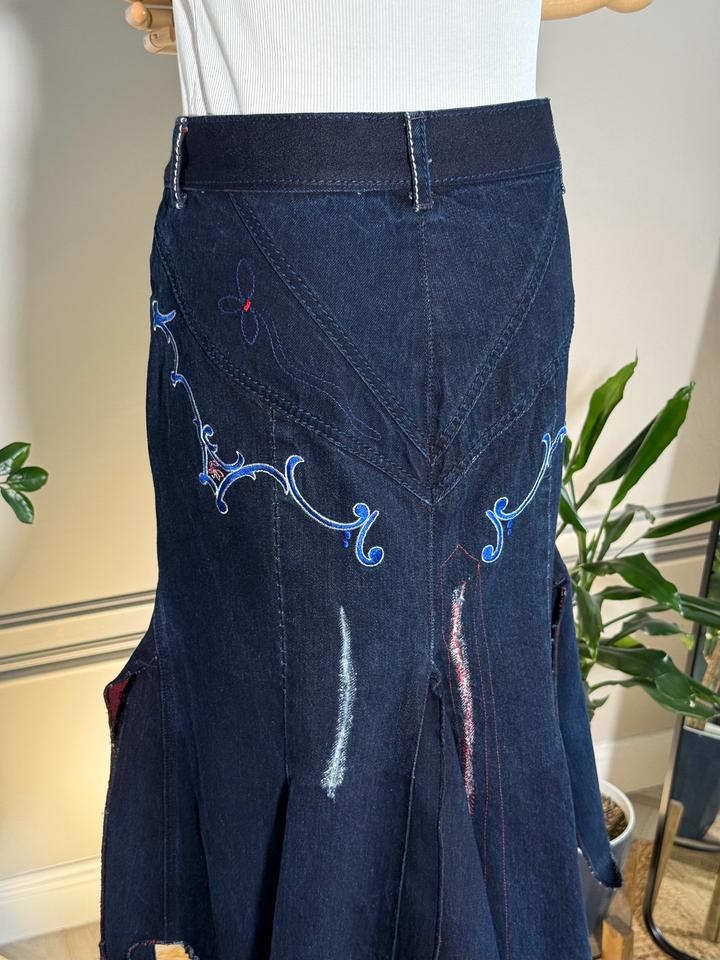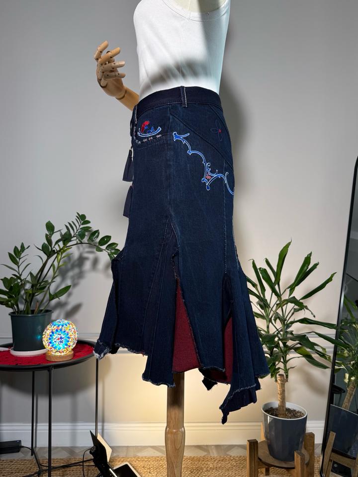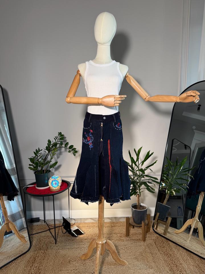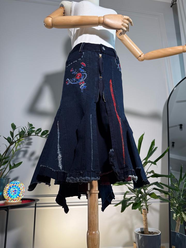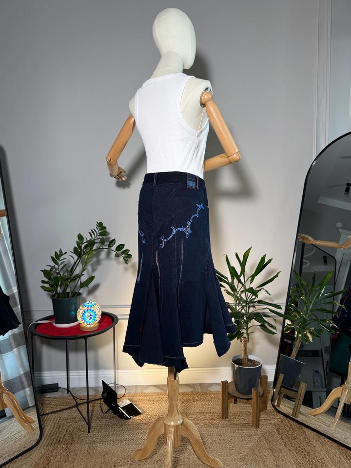 • Размер: XS-S (длина ~63 см, ширина по талии 38 см, ширина по бёдрам 44 см) • Состав: 100% хлопок • Состояние: 10 из 10 • Комментарий: Джинсовая юбка-русалка в стиле Y2K от французских дизайнеров и супругов Марите Башеллери и Франсуа Жирбо 🧜♀️ Фасон юбки-русалки длины миди - красиво облегает бёдра, резко расширяется к низу, имеет ассиметричный подол. Впереди застегивается на молнию, посадка высокая. Декорирована вышивкой в цветочных мотивах, сзади вышиты имена дизайнеров бренда. Артикул: 582262