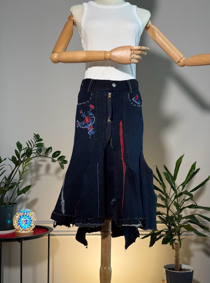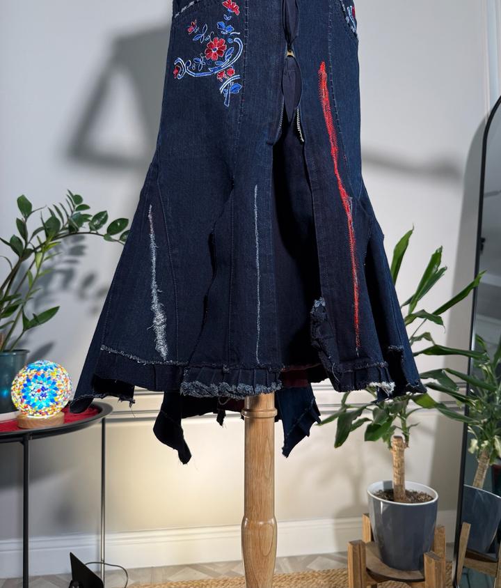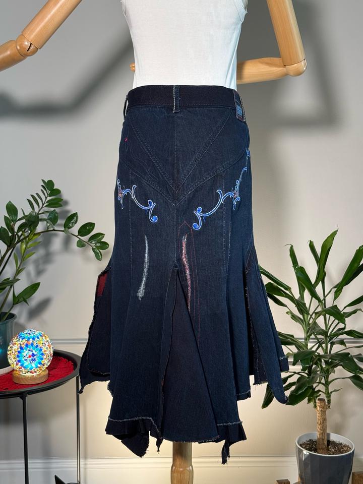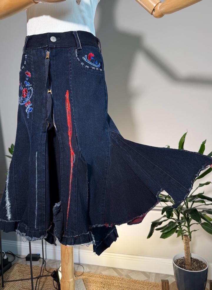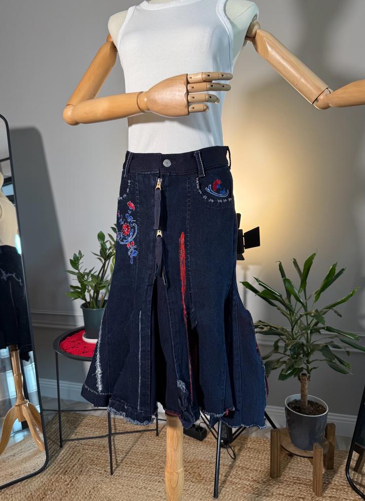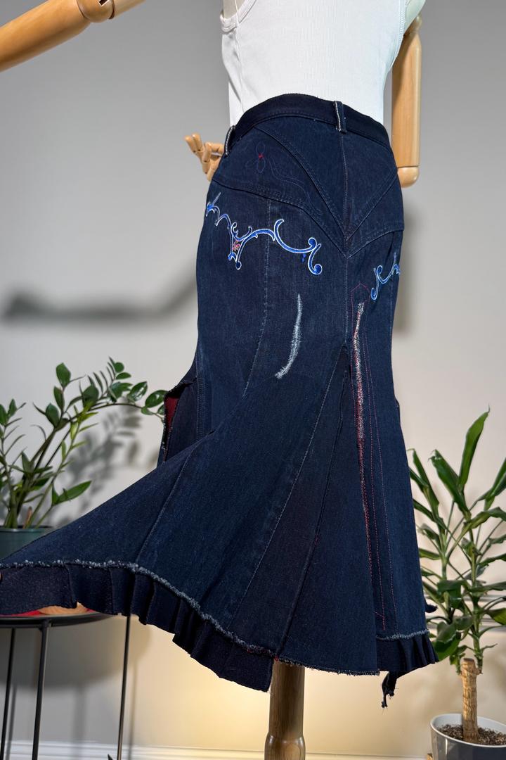 • Размер: XS-S (длина ~63 см, ширина по талии 38 см, ширина по бёдрам 44 см) • Состав: 100% хлопок • Состояние: 10 из 10 • Комментарий: Джинсовая юбка-русалка в стиле Y2K от французских дизайнеров и супругов Марите Башеллери и Франсуа Жирбо 🧜♀️ Фасон юбки-русалки длины миди - красиво облегает бёдра, резко расширяется к низу, имеет ассиметричный подол. Впереди застегивается на молнию, посадка высокая. Декорирована вышивкой в цветочных мотивах, сзади вышиты имена дизайнеров бренда. Артикул: 582262