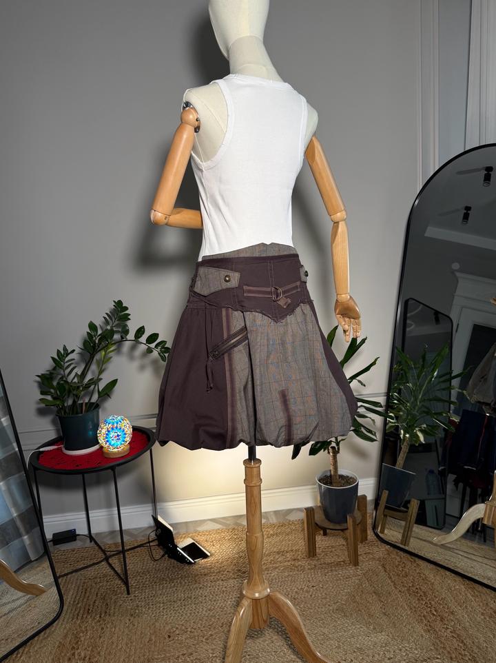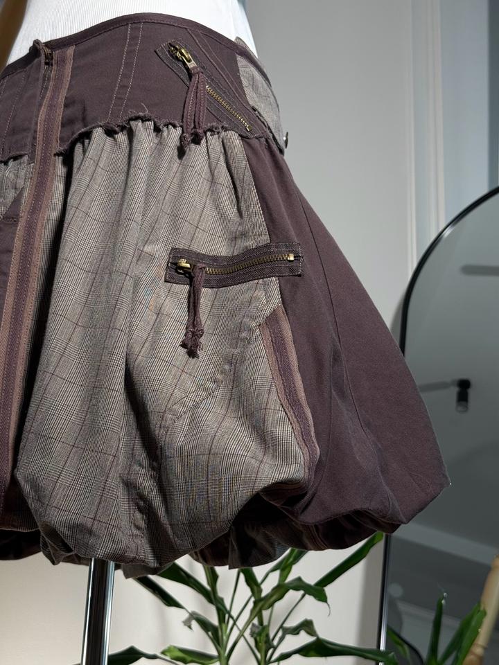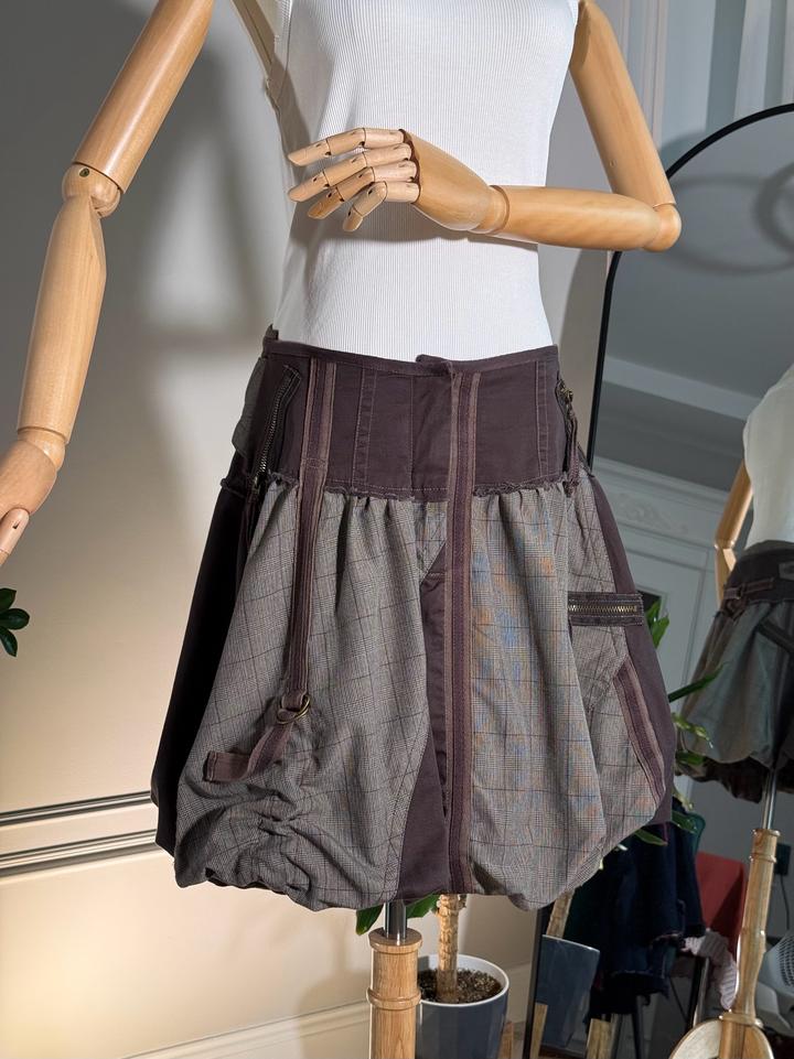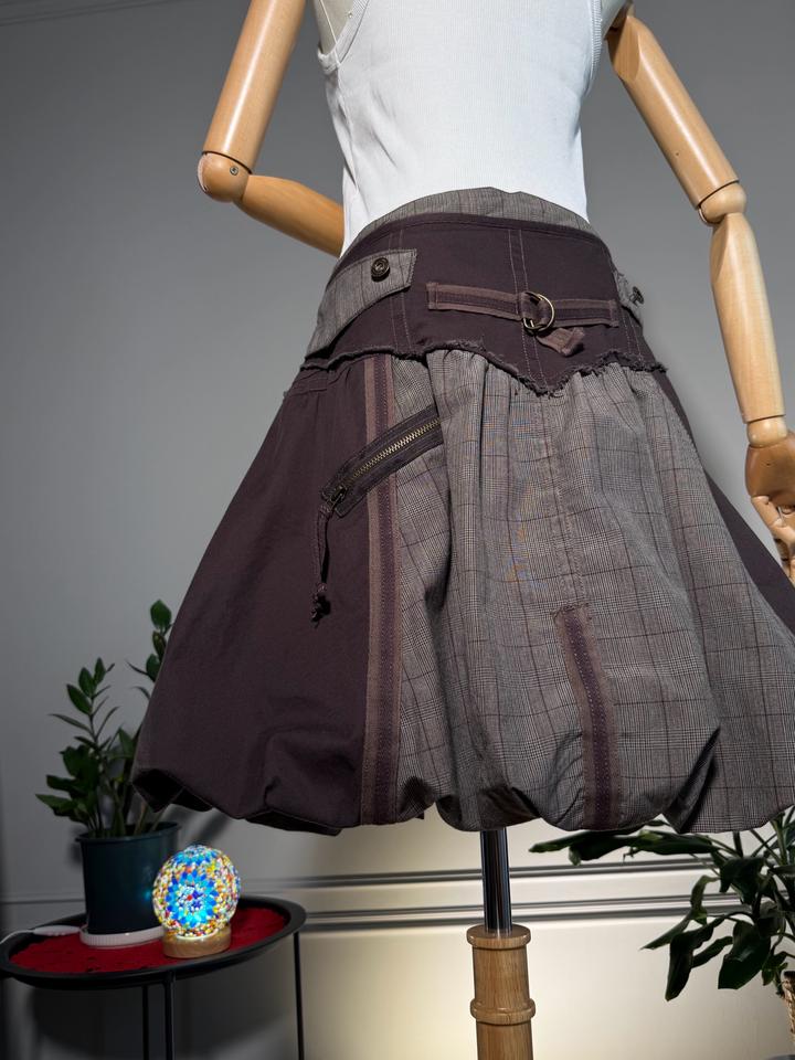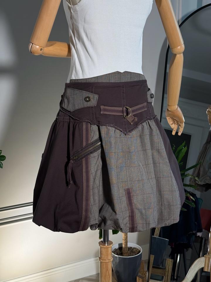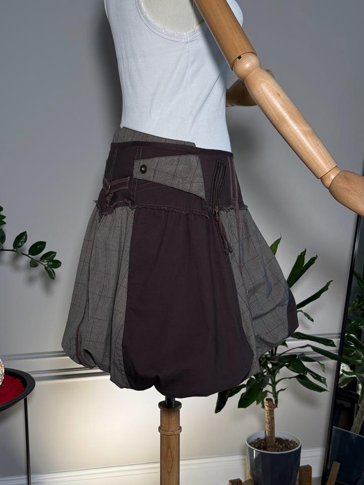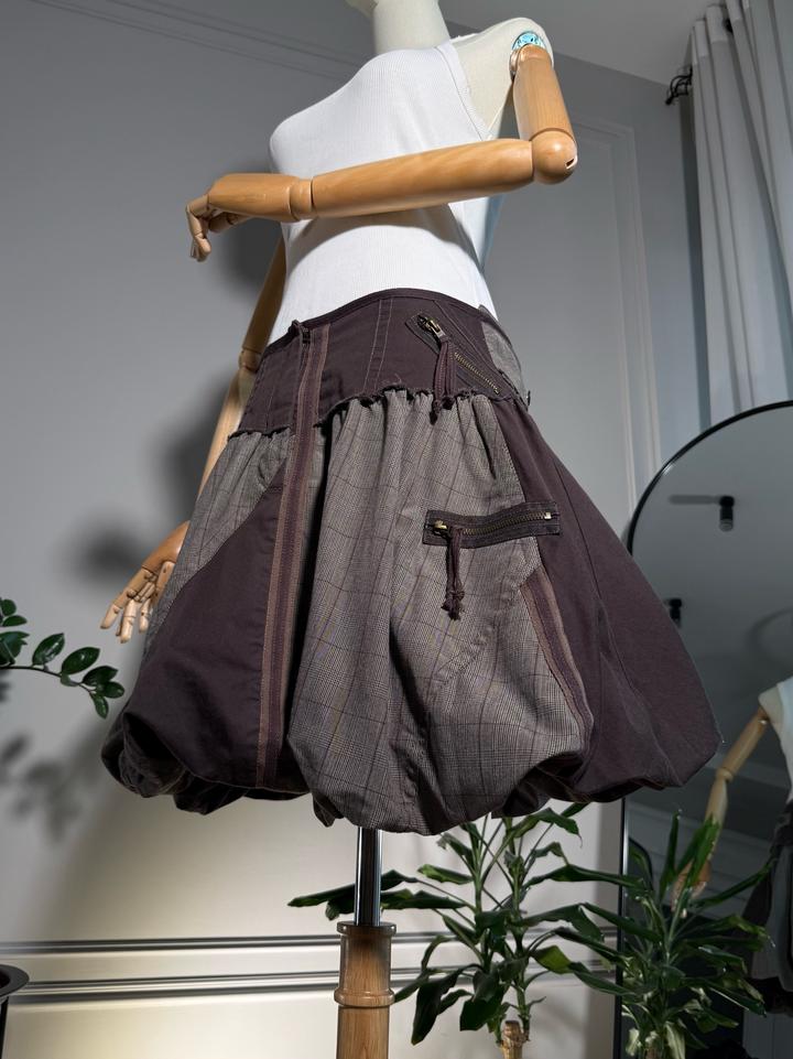 Размер: M-L (длина 45 см, ширина по талии 40 см, ширина по бёдрам 63 см) Состав: 100% хлопок Авангардная дизайнерская юбка-фонарик в стиле Y2K от французского бренда Xanaka. Фасон A-силуэта, подол с нестандартным асимметричным и деконструированным кроем. Выполнена из комбинации коричневой однотонной и клетчатой тканей. Декорирована сборками, замочками и необработанными краями. Артикул: 582280