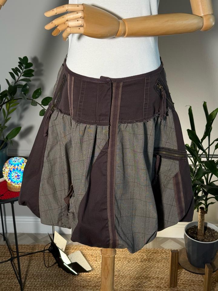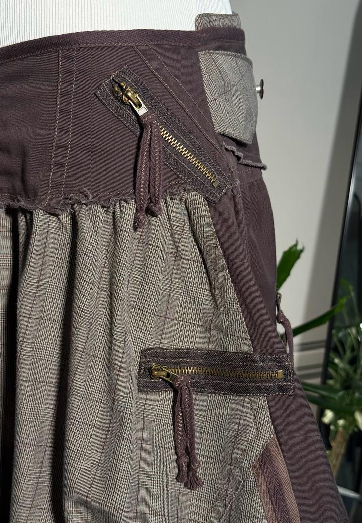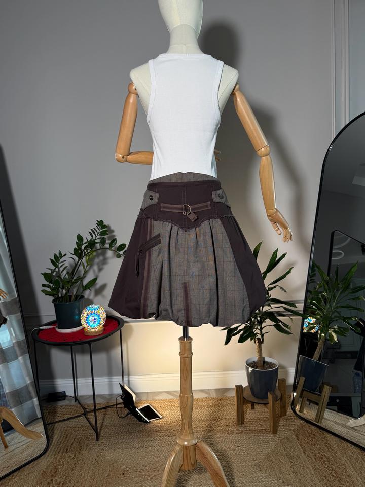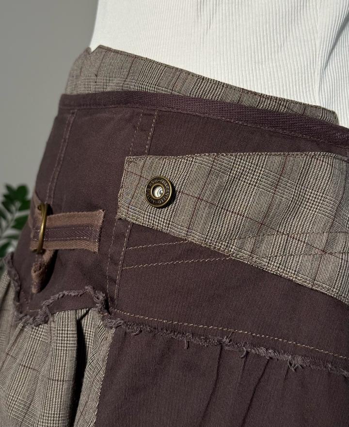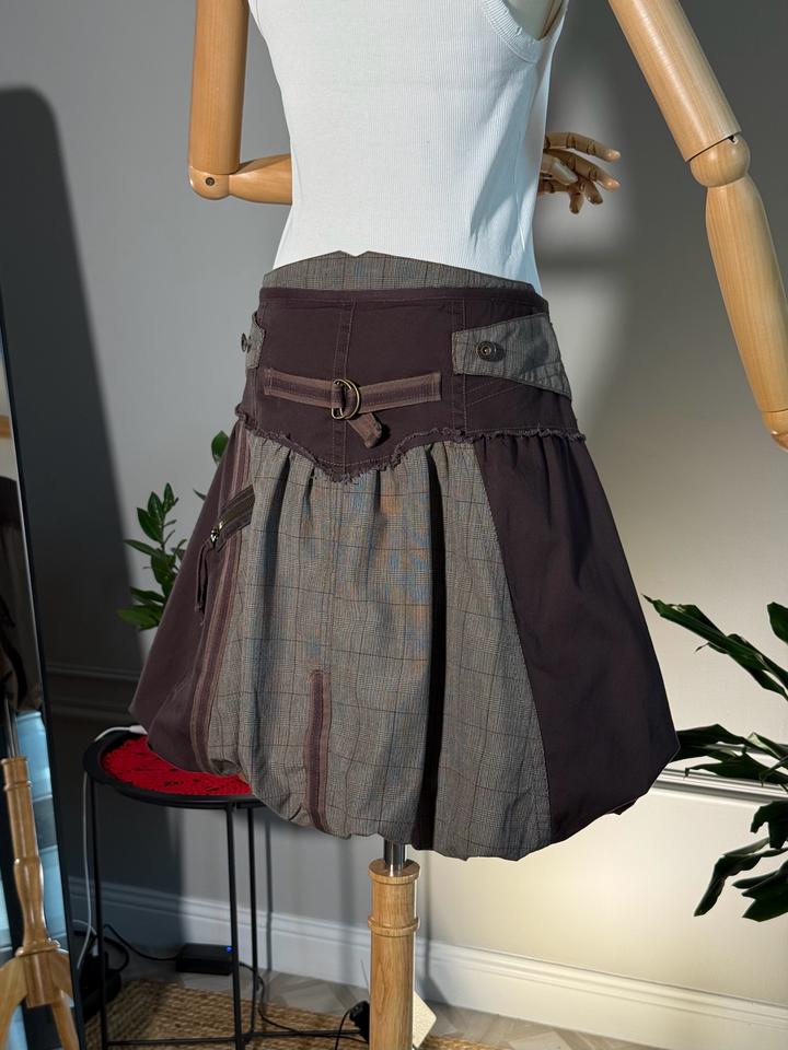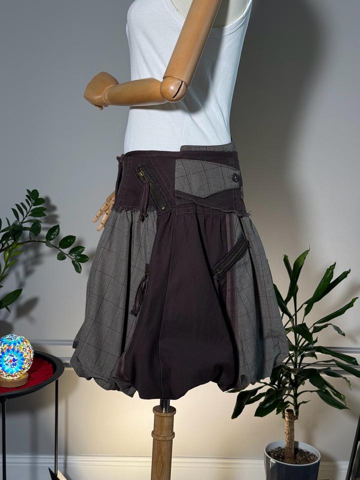 Размер: M-L (длина 45 см, ширина по талии 40 см, ширина по бёдрам 63 см) Состав: 100% хлопок Авангардная дизайнерская юбка-фонарик в стиле Y2K от французского бренда Xanaka. Фасон A-силуэта, подол с нестандартным асимметричным и деконструированным кроем. Выполнена из комбинации коричневой однотонной и клетчатой тканей. Декорирована сборками, замочками и необработанными краями. Артикул: 582280