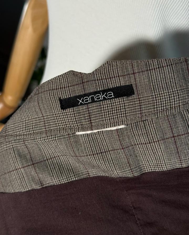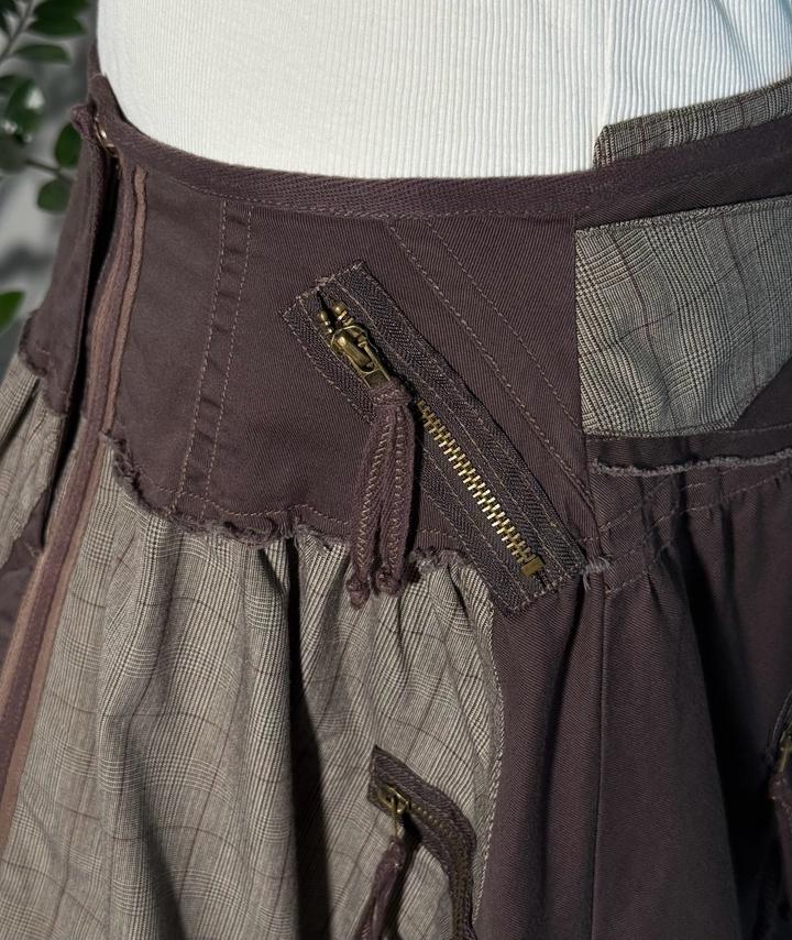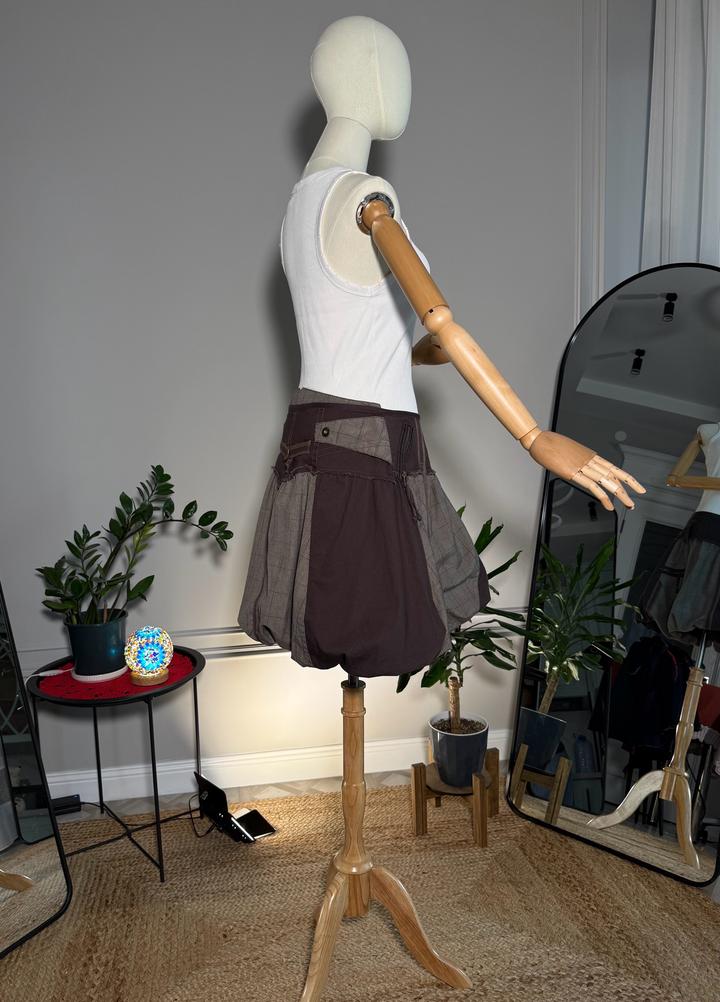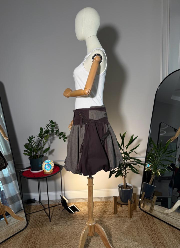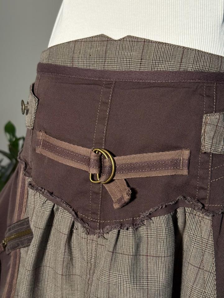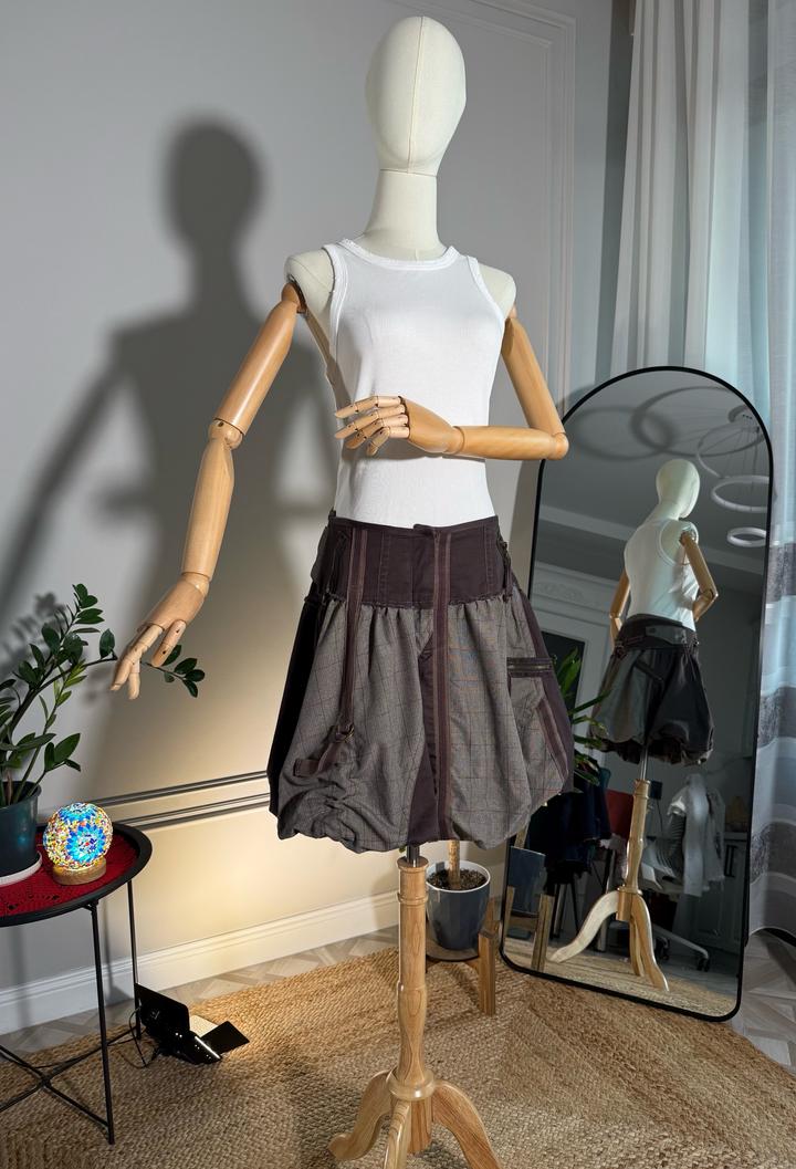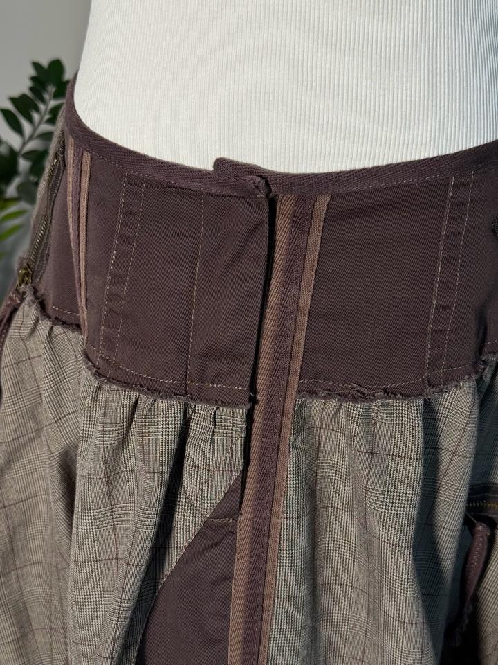 Размер: M-L (длина 45 см, ширина по талии 40 см, ширина по бёдрам 63 см) Состав: 100% хлопок Авангардная дизайнерская юбка-фонарик в стиле Y2K от французского бренда Xanaka. Фасон A-силуэта, подол с нестандартным асимметричным и деконструированным кроем. Выполнена из комбинации коричневой однотонной и клетчатой тканей. Декорирована сборками, замочками и необработанными краями. Артикул: 582280