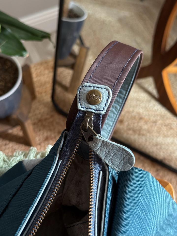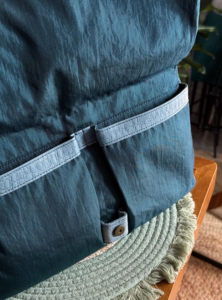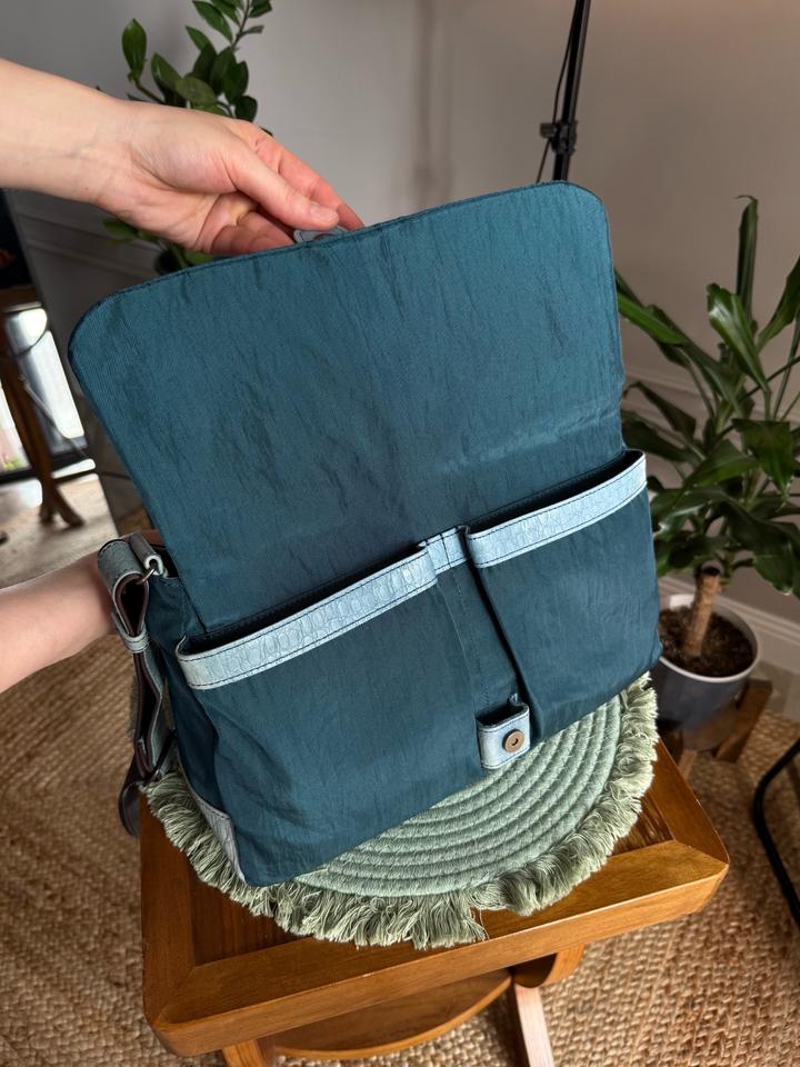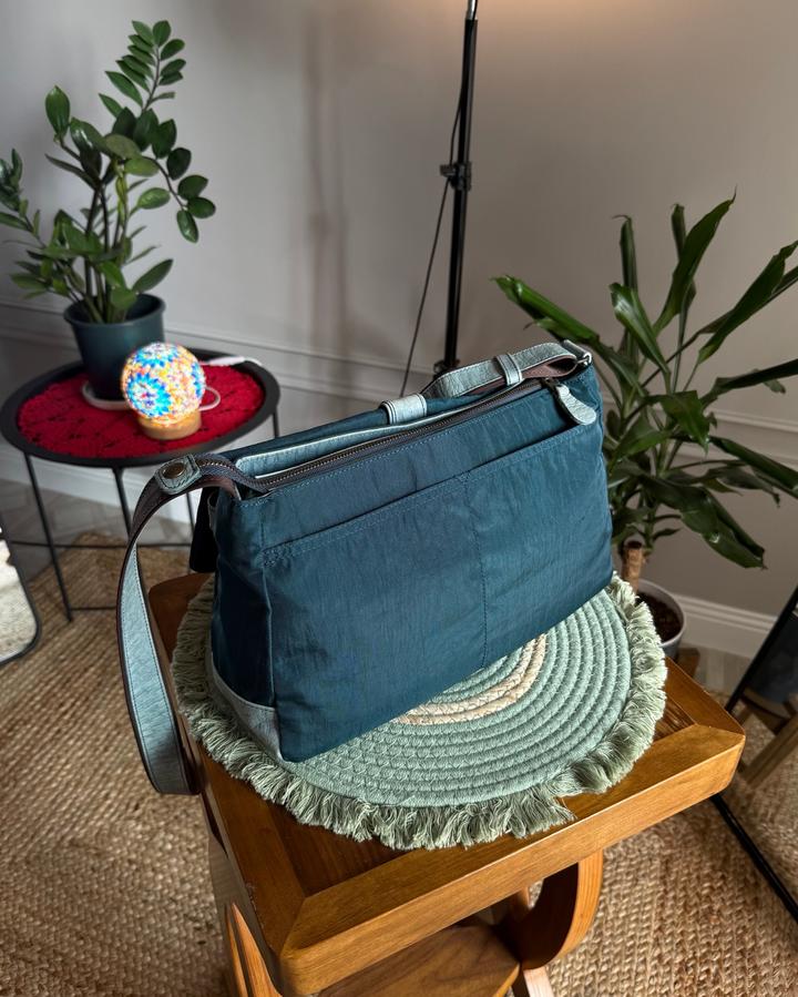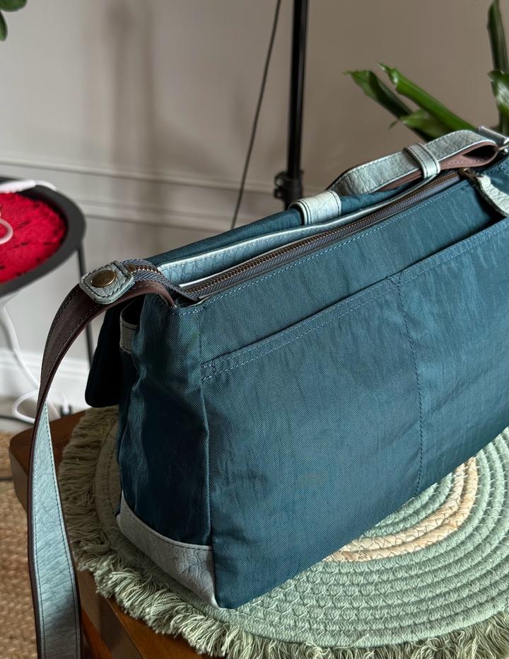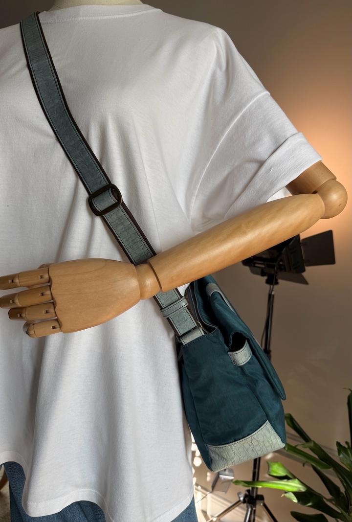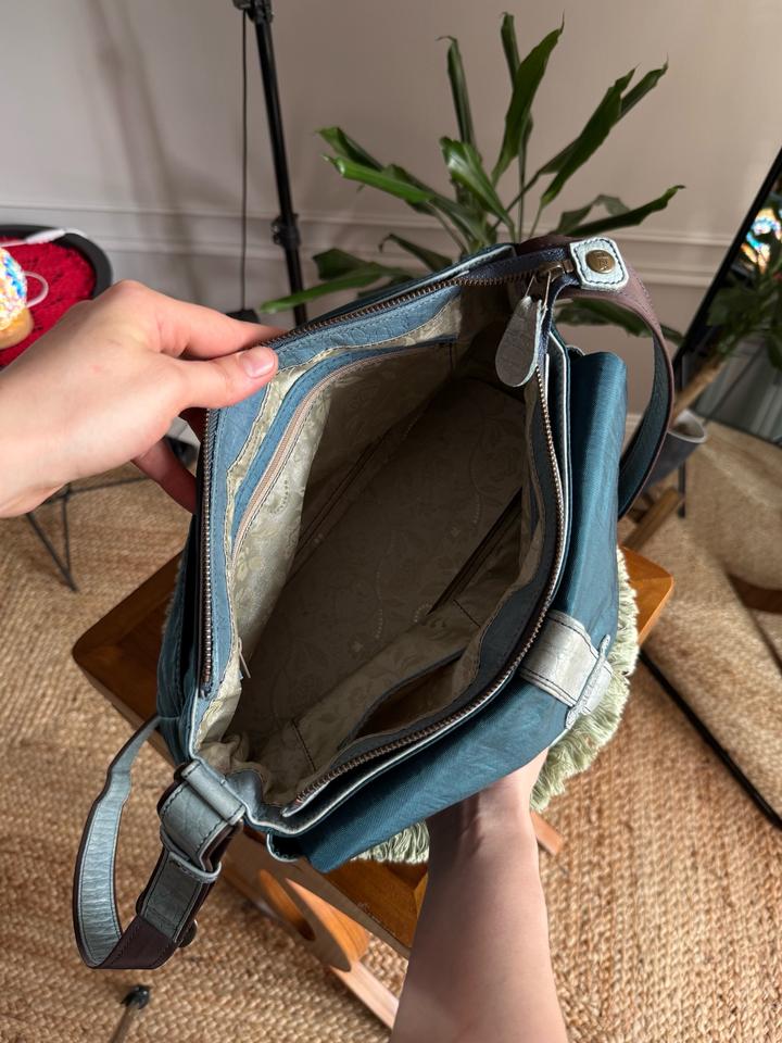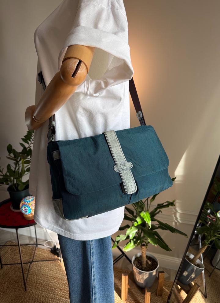 • Размер: 32 см х 20 см х 10 см • Состав: верх 100% нейлон, вставки 100% натуральная кожа • Комментарий: Стильная сумка бирюзового оттенка с кожаными вставками с тиснением под змею. Материал верха красиво переливается на свету, кожаные вставки имеют винтажный цветовой эффект. Сумка имеет прямоугольную форму с широким дном. Внутри 2 больших отделения + маленькие кармашки для мелочей, снаружи 4 плоских глубоких кармана. Бронзовая фурнитура, в центре брендированный лого. Длинный ремешок. Артикул: 582310