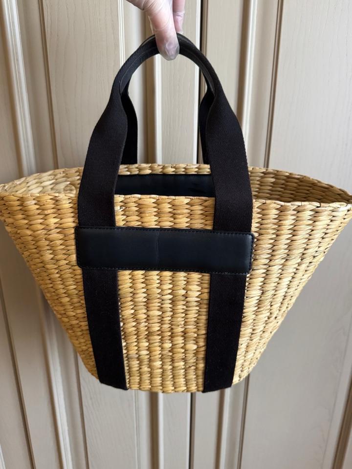 Плетёная сумка-тоут от бренда Massimo Dutti. Модель выполнена в стиле традиционной корзины («capazo») и дополнена современными деталями из черной кожи и текстиля.Основа сумки изготовлена из натуральной соломки. Ручки и декоративные вставки выполнены из текстиля и натуральной воловьей кожи. Артикул: 582435