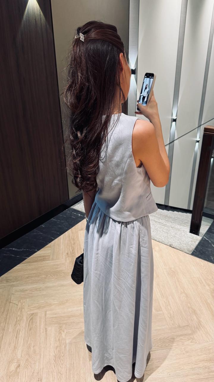 Смотрится дорого и утончённо, идеально подчёркивает фигуру и создаёт аккуратный силуэт. ✔️ Длина миди ✔️ Верх в стиле жилета с пуговицами ✔️ Приталенный силуэт + свободная юбка ✔️ Лёгкая, струящаяся ткань ✔️ Идеально на мероприятия, ужин, фотосессии Артикул: 582709