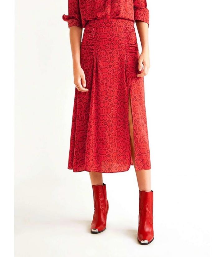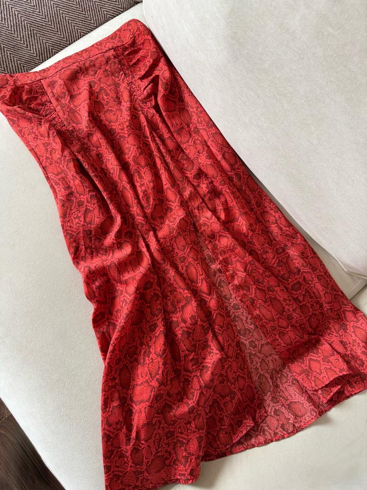 Надевала пару раз Состояние как новое Трендовый змеиный принт в терракотово- красном оттенке А-силует Длина миди Разрез спереди эффектно открывает ногу Сзади потойная молния Артикул: 582863