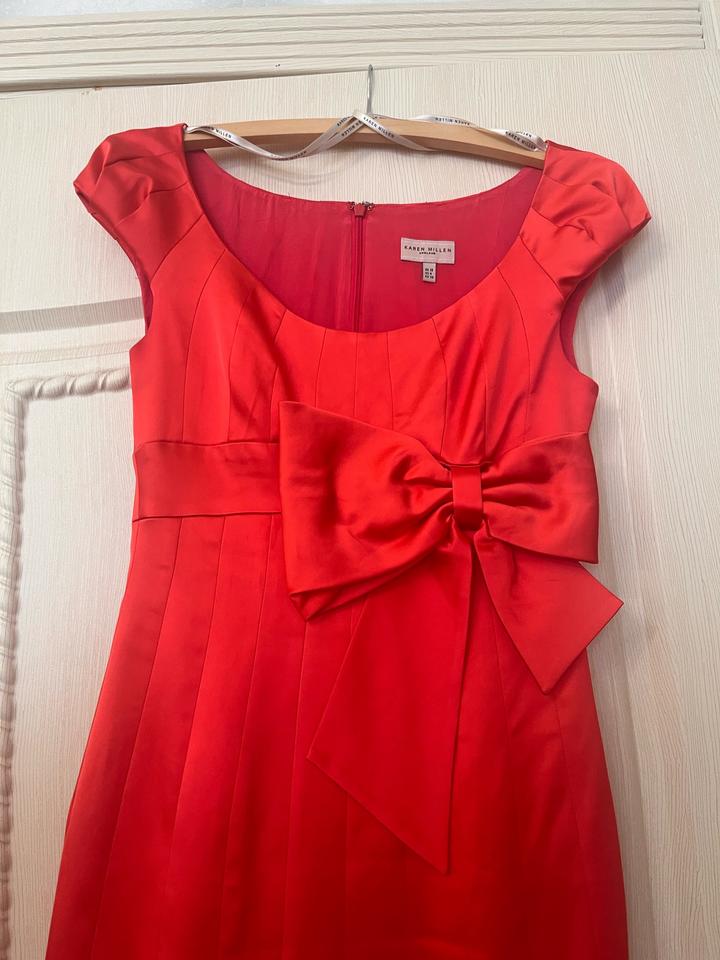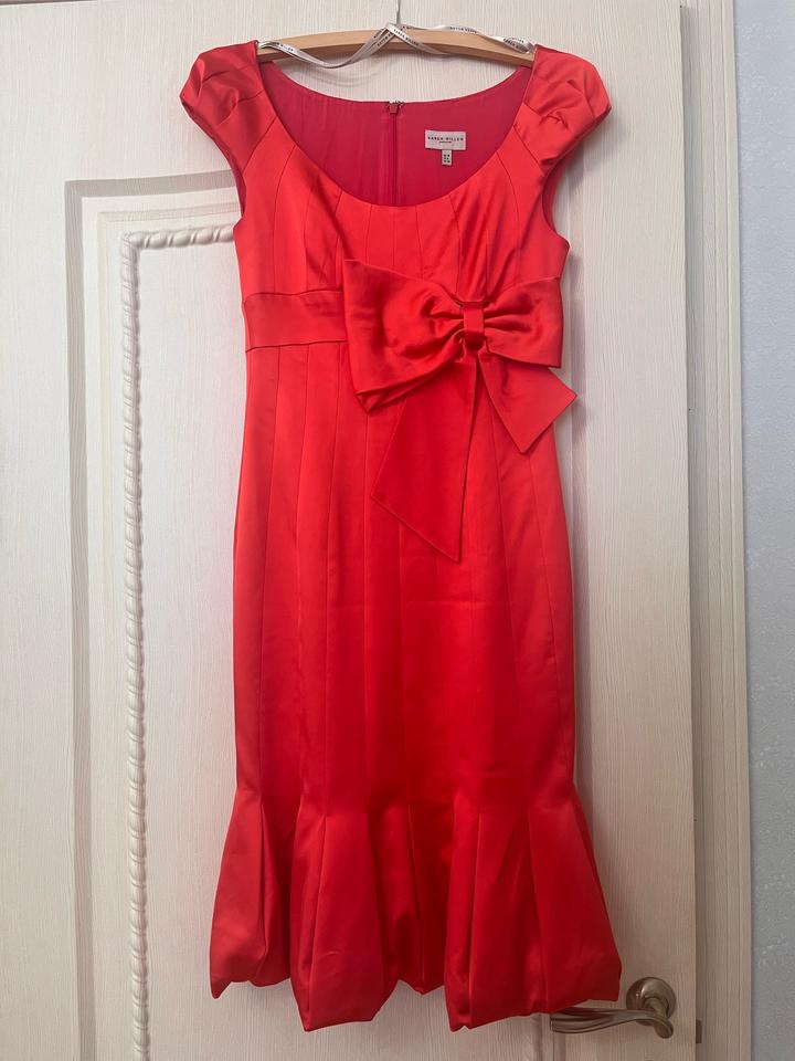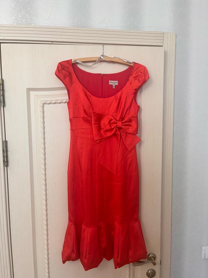 Атласное платье ярко красного цвета с декоративным бантом, на замке сзади. Длина на рост 168 чуть прикрывает колено Артикул: 583049
