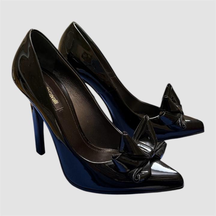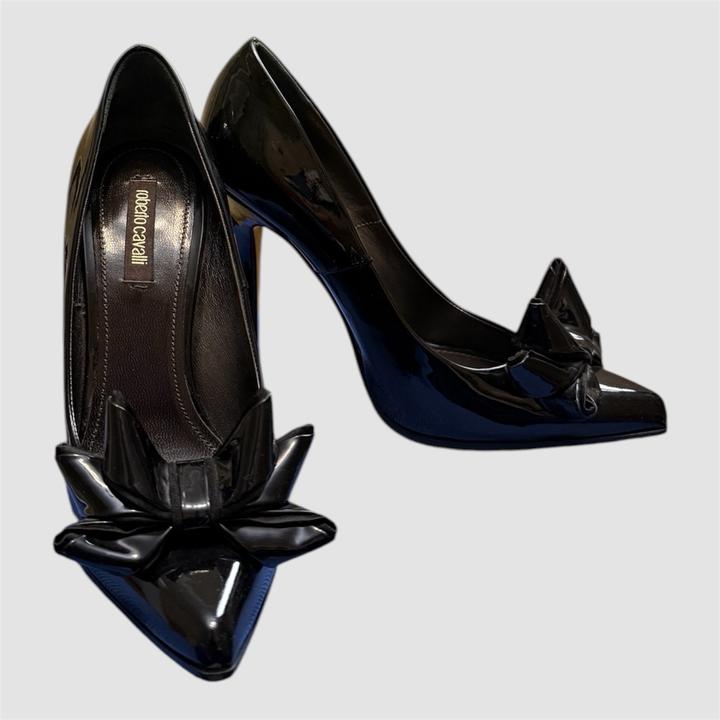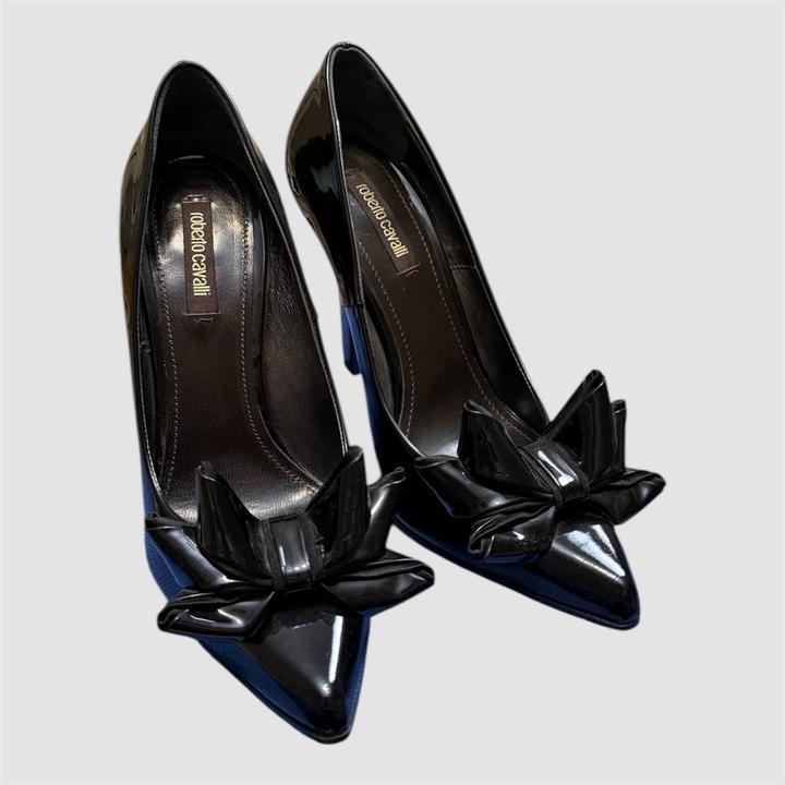 Классические черные лакированные туфли-лодочки от итальянского бренда Roberto Cavalli. Модель отличается острым мысом и эффектным многослойным бантом, который придает обуви дерзкий и одновременно элегантный вид. Новые, без коробки Артикул: 583130
