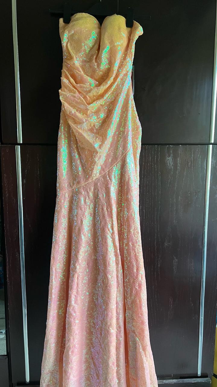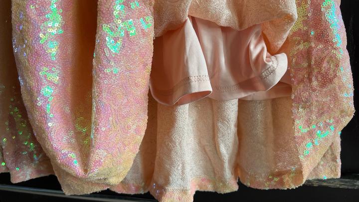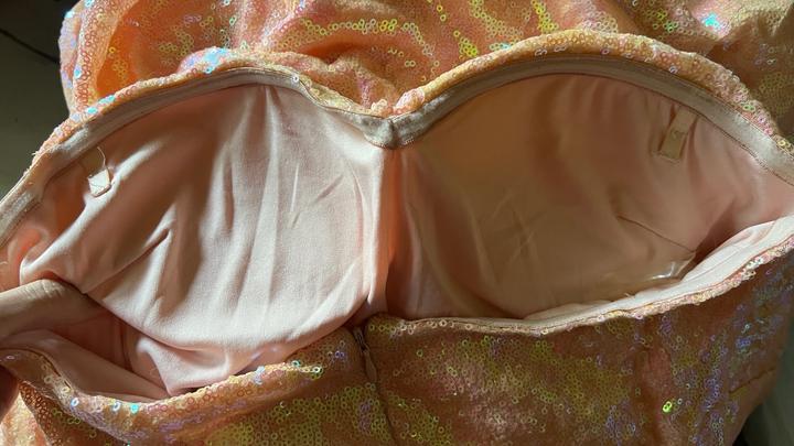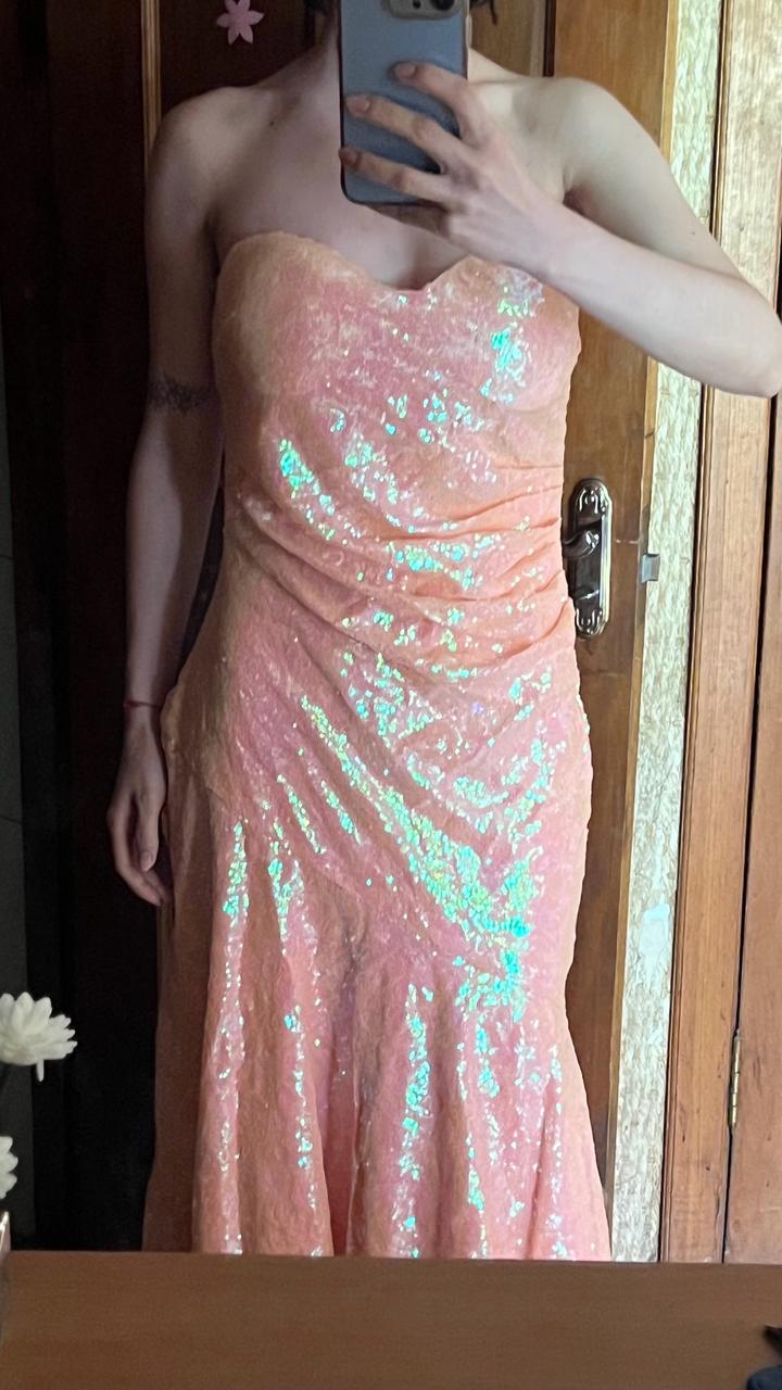 Платье нежно розового оттенка, полностью вышито пайетками Есть подклад Длинное (либо нужно подшивать, либо высокие каблуки) На мой рост 162 см - волочется по полу Желательно 170+ Размер предположительно M Артикул: 583175