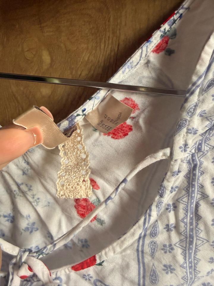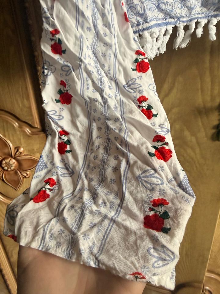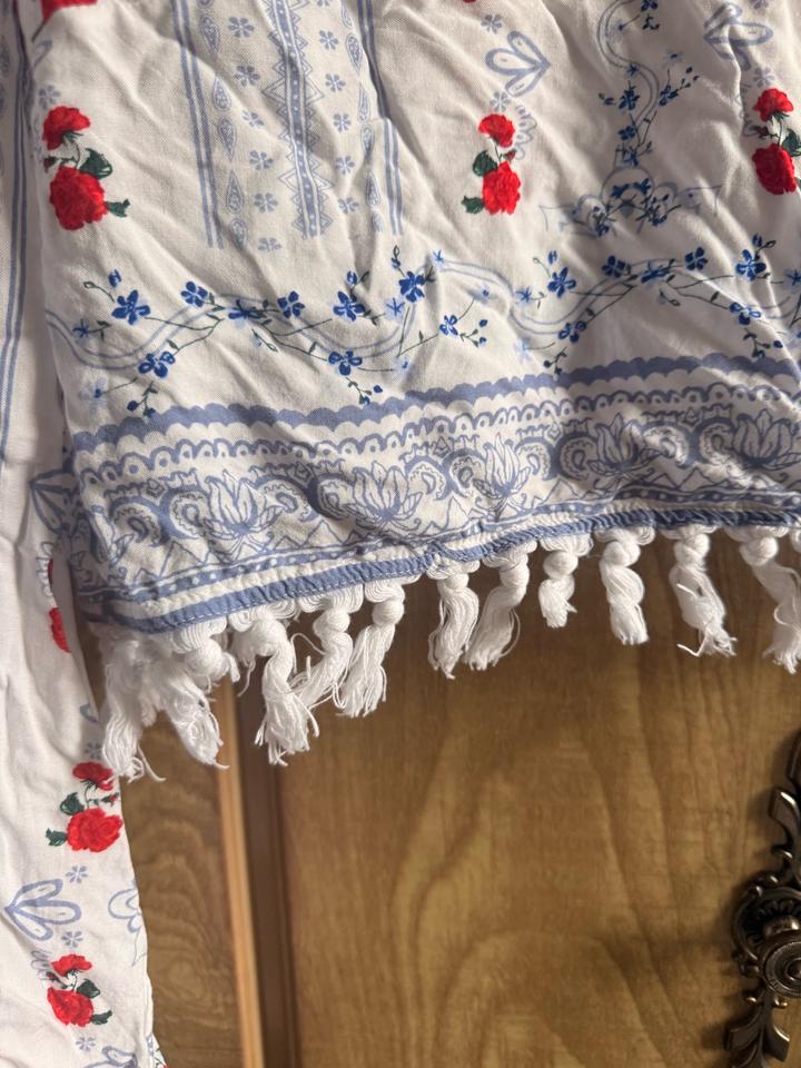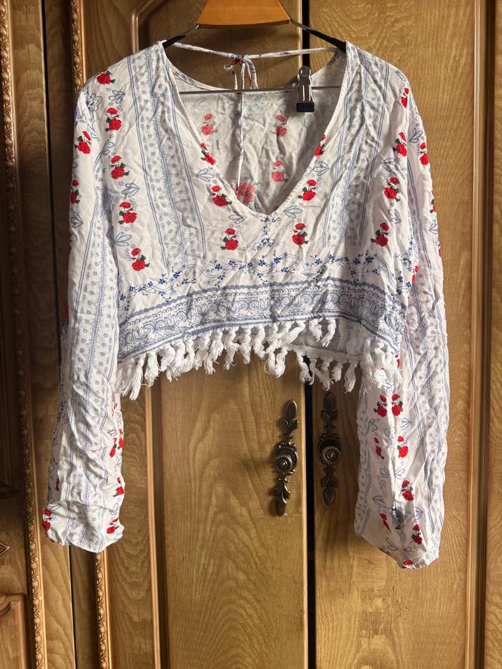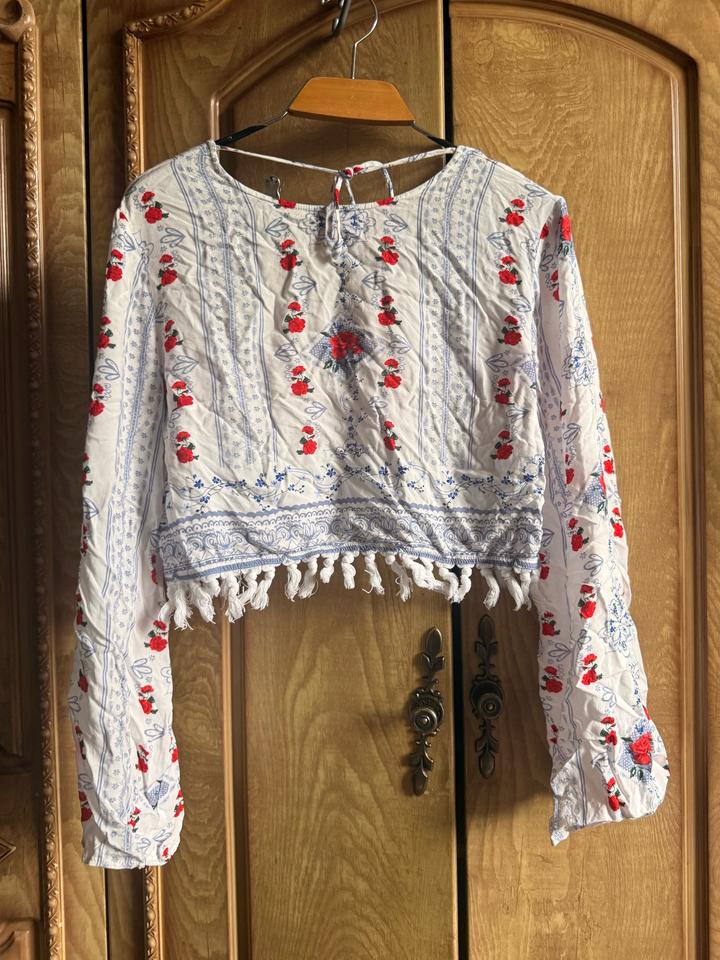 Укороченная блуза с длинным рукавом в стиле славянской росписи — напоминает русские/украинские мотивы. Детали: — V-вырез — длинные рукава с лёгким объёмом — принт с красными цветами и голубыми узорами — декоративные кисточки по низу — завязка на спине Лёгкая ткань, комфортная в носке — отлично подойдёт на тёплый сезон. Артикул: 583400
