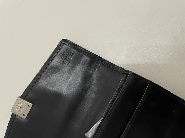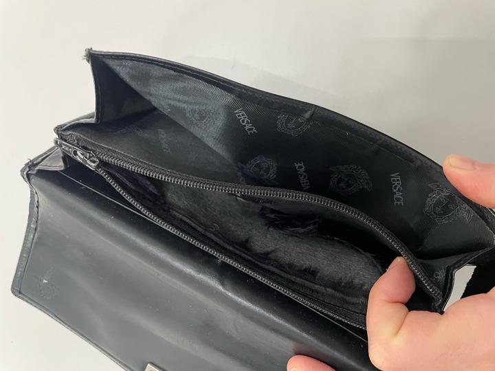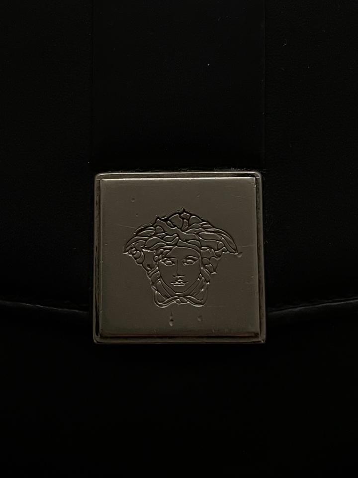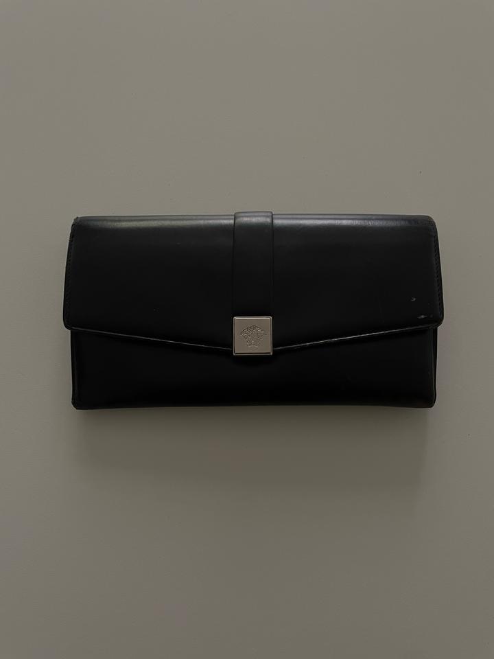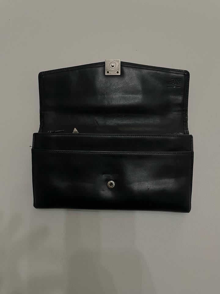 Кошелёк от Versace из чёрной кожи, приобретён в винтажном магазине в Милане. С внутренней стороны есть небольшой дефект, поэтому цену снизила. В целом кошелёк выглядит дорого и стильно. Торг неуместен. Артикул: 583442