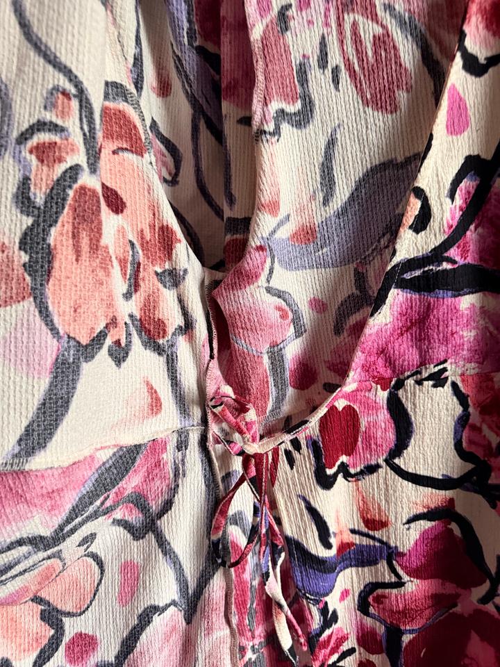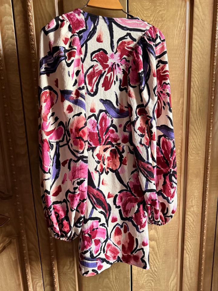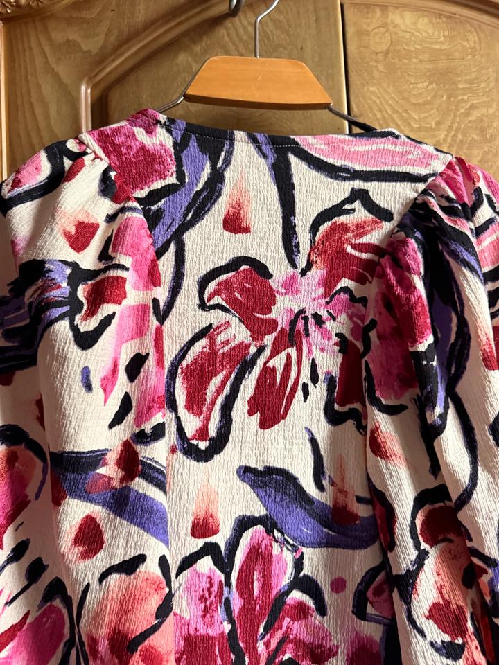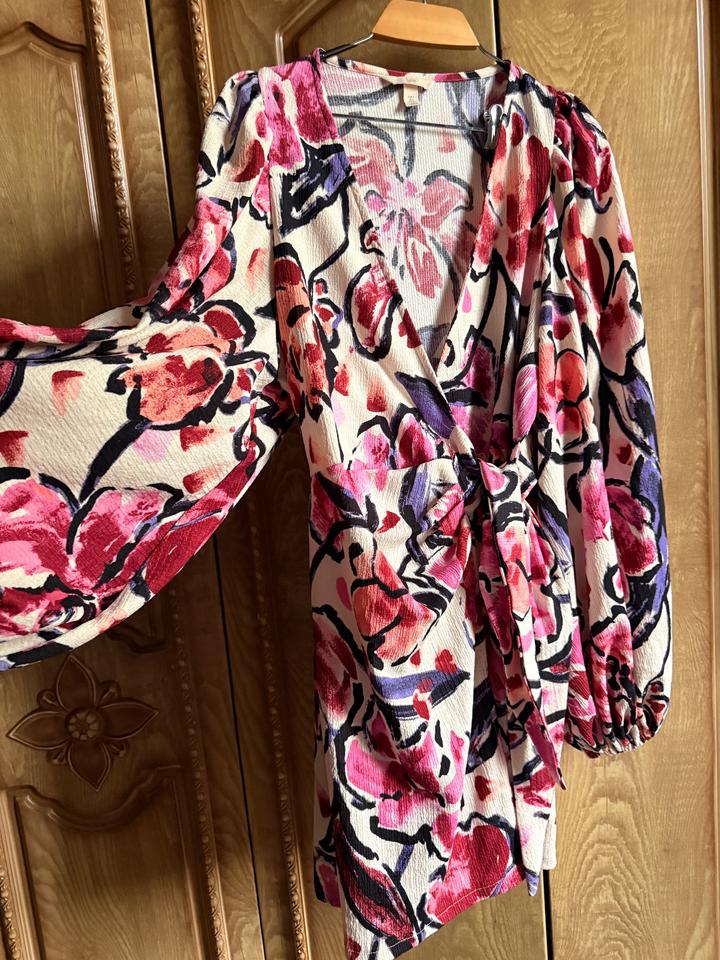 Платье на запах, подчёркивает талию за счёт пояса. Лёгкая фактурная ткань, не плотная, но не просвечивает. Яркий цветочный принт. Рукава широкие, объёмные, создают эффектный силуэт. Длина мини, мягко ложится по фигуре. Удобная и женственная модель на каждый день или выход. Бренд H&M. Артикул: 583516