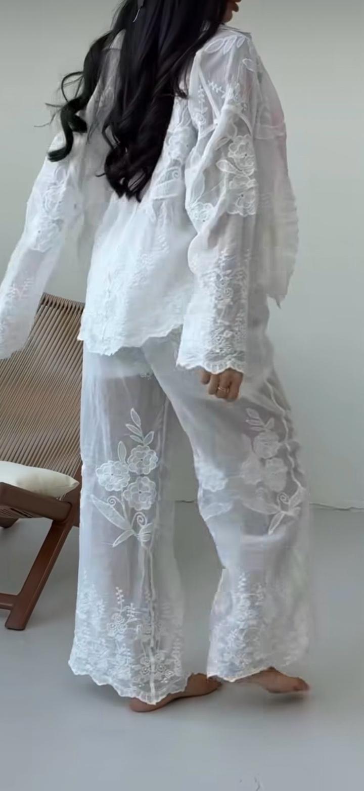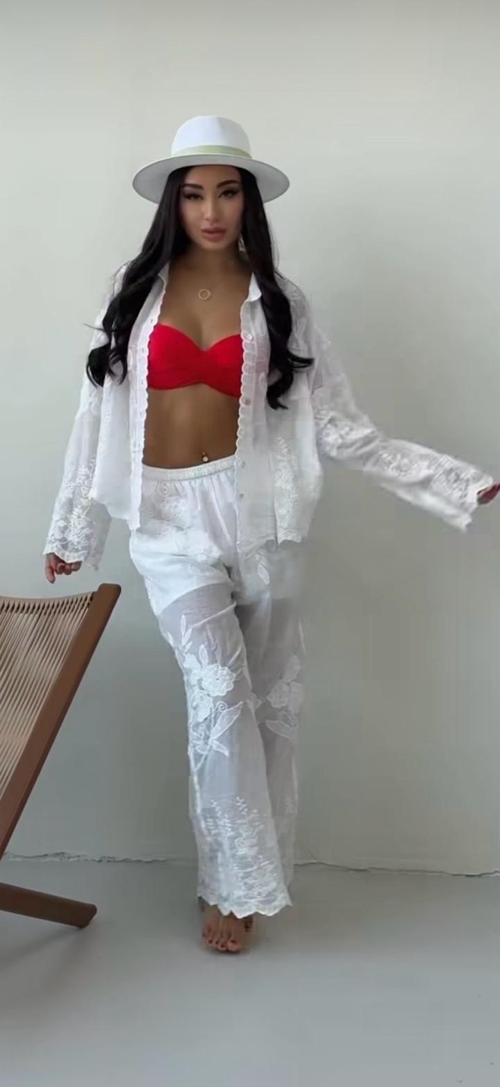 Красивый комплект из хлопка с вышивкой . Белоснежный цвет . Брюки имеет вшитые мини- шорты бельевого типа . В носке не был , была предварительная стирка после покупки. Подойдет на хs-s-m Артикул: 583527