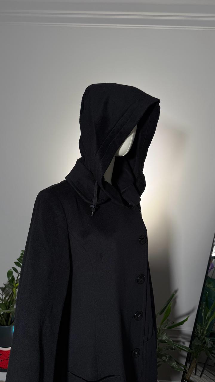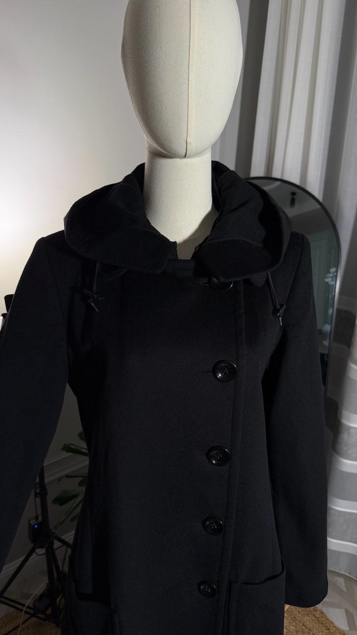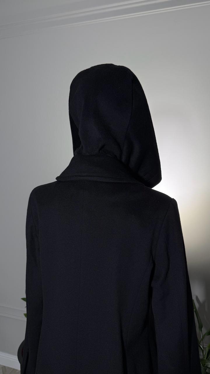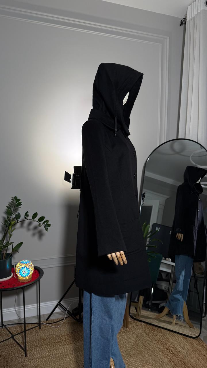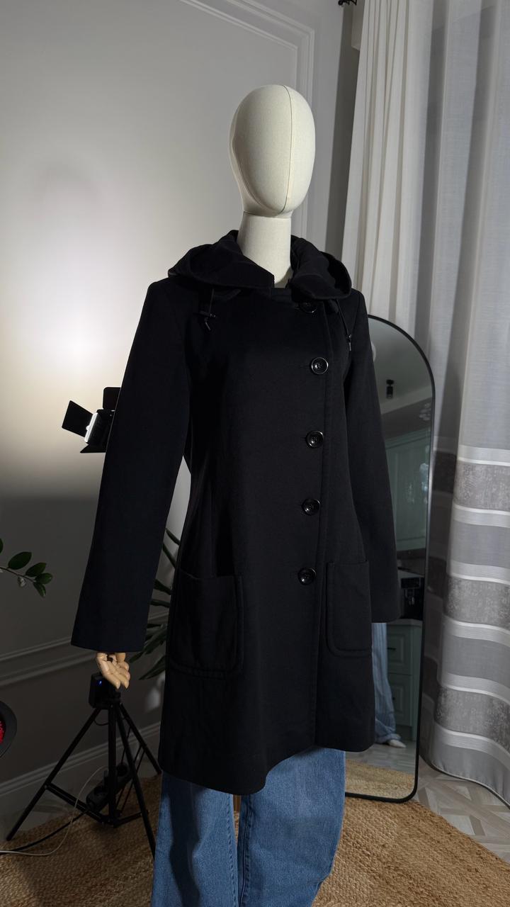Размер: M-L (по бирке) Шикарное пальто с капюшоном из шерсти лана от французского бренда Cop.Copine 🖤 Модель Dray Manteau. Пальто однобортное, чёрного цвета, с большими пуговицами и брендовой серебристой вышивкой на левом рукаве. Силуэт прямой, слегка приталенный. Капюшон затягивается на шнурок и отстегивается, под ним классический воротник. Внутри красивая хлопковая подкладка. Артикул: 583675