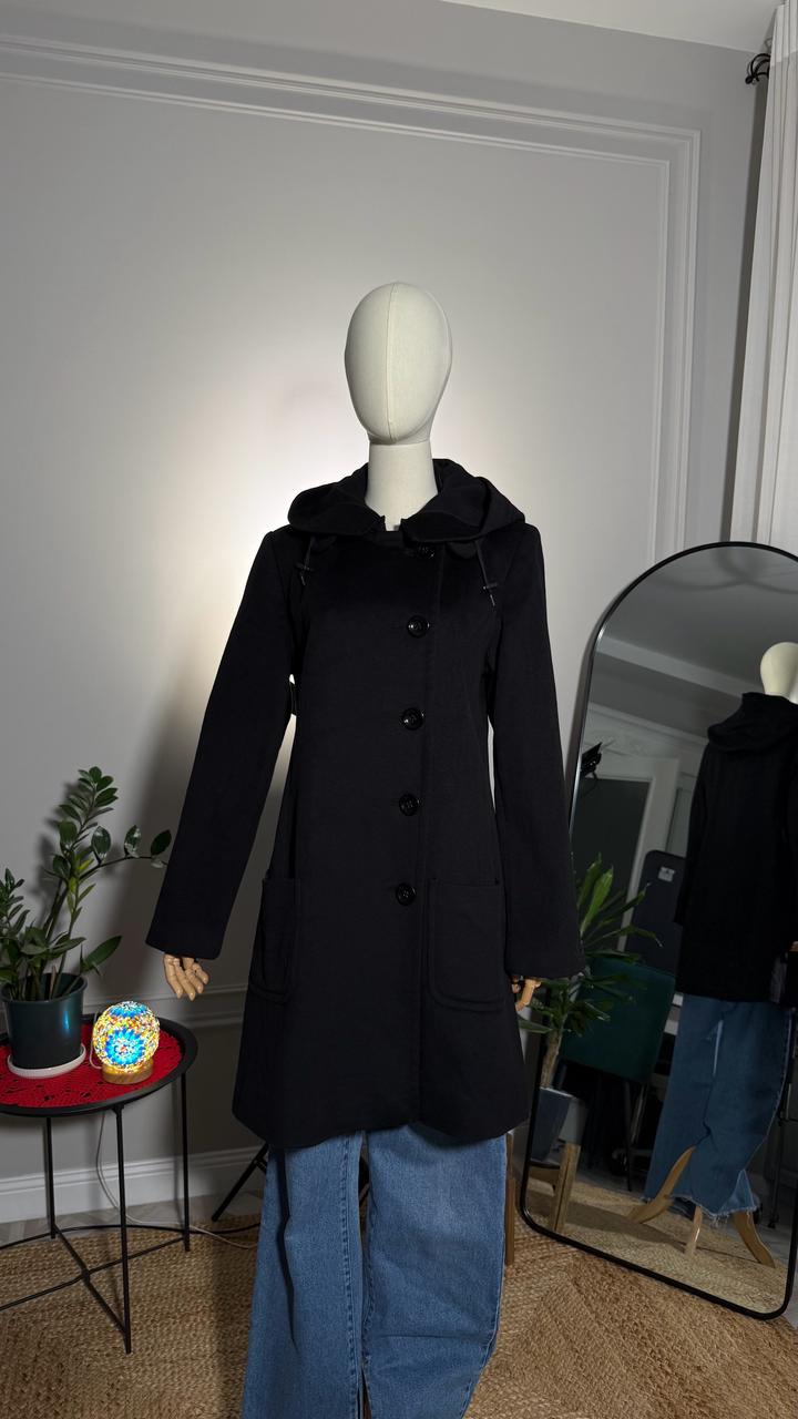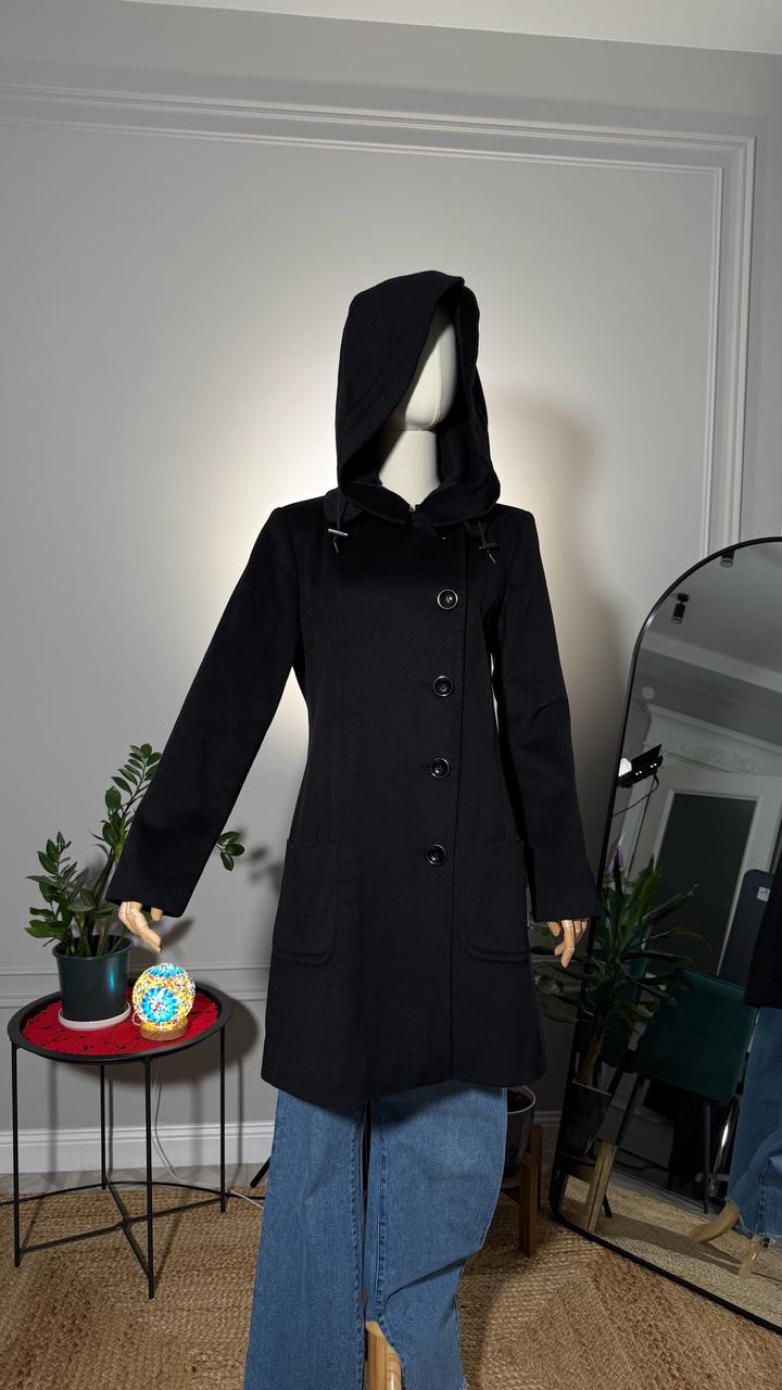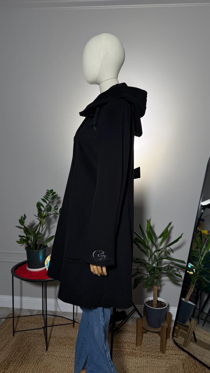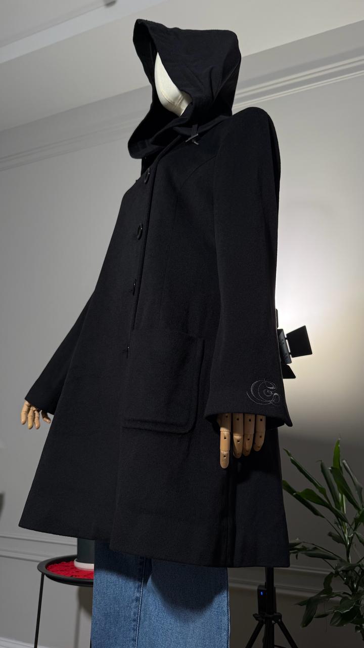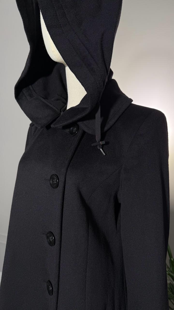 Размер: M-L (по бирке) Шикарное пальто с капюшоном из шерсти лана от французского бренда Cop.Copine 🖤 Модель Dray Manteau. Пальто однобортное, чёрного цвета, с большими пуговицами и брендовой серебристой вышивкой на левом рукаве. Силуэт прямой, слегка приталенный. Капюшон затягивается на шнурок и отстегивается, под ним классический воротник. Внутри красивая хлопковая подкладка. Артикул: 583675