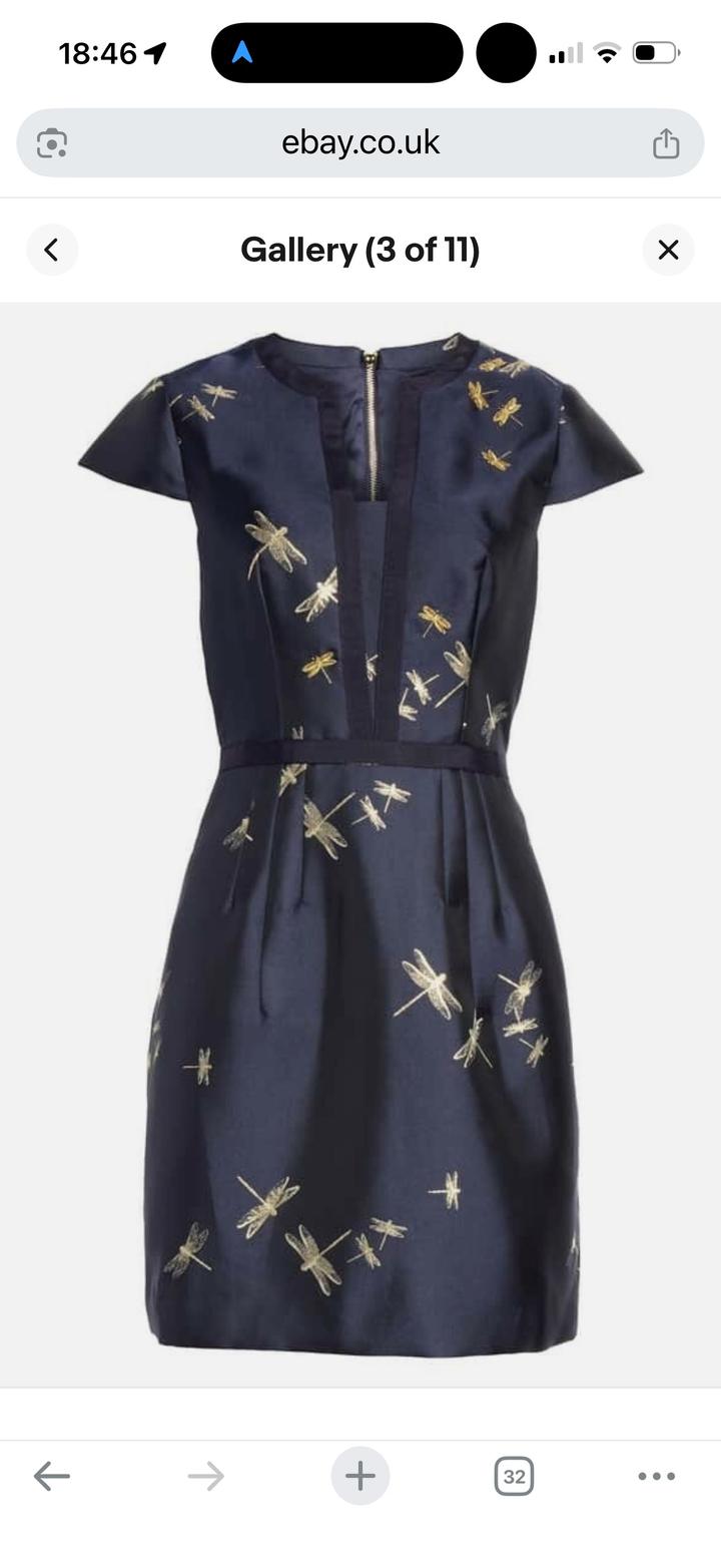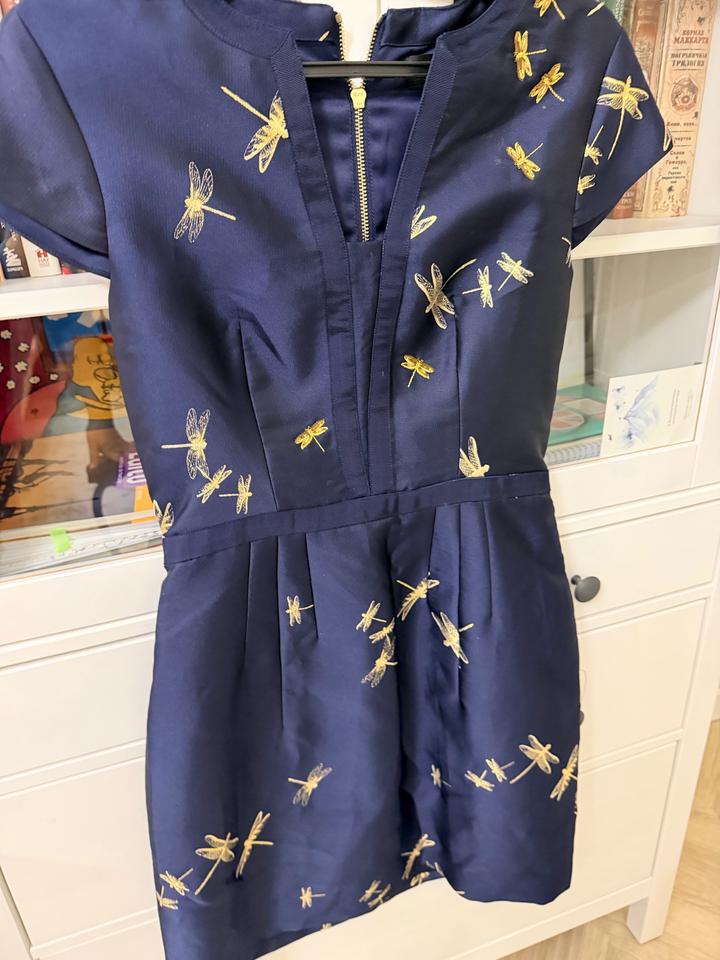 Коктейльное платье, в темно синем цвете, с принтом злодлтиствх стрикоз. Покупала в Дубаи. Надела на два мероприятия. Состояние отличное Артикул: 583692
