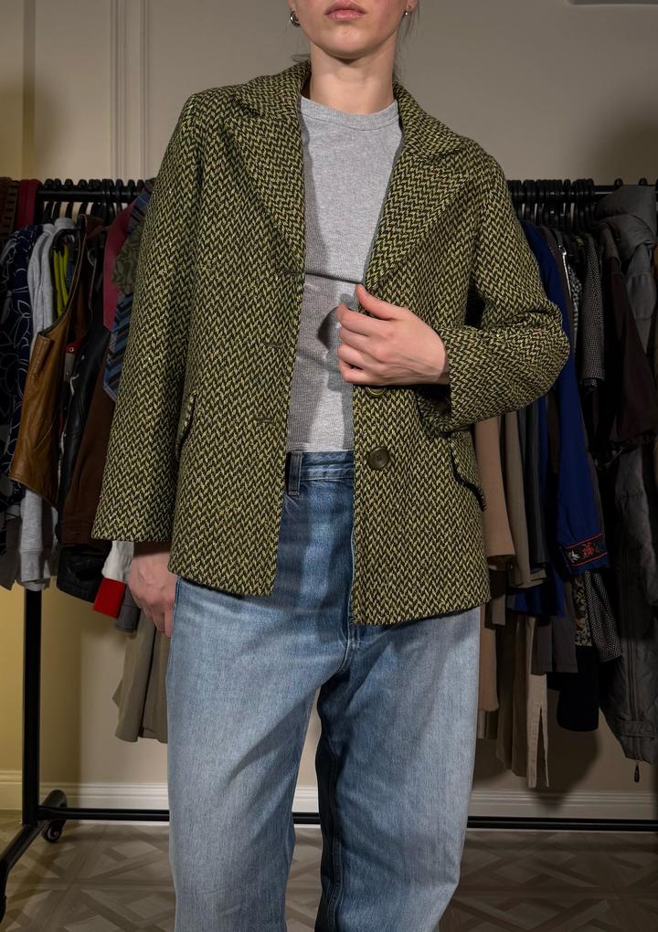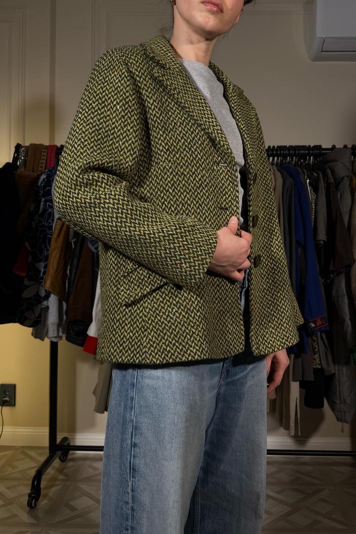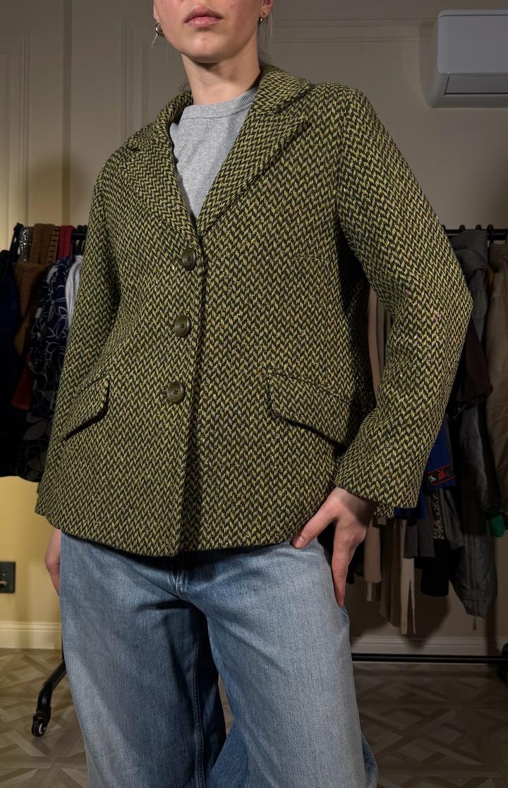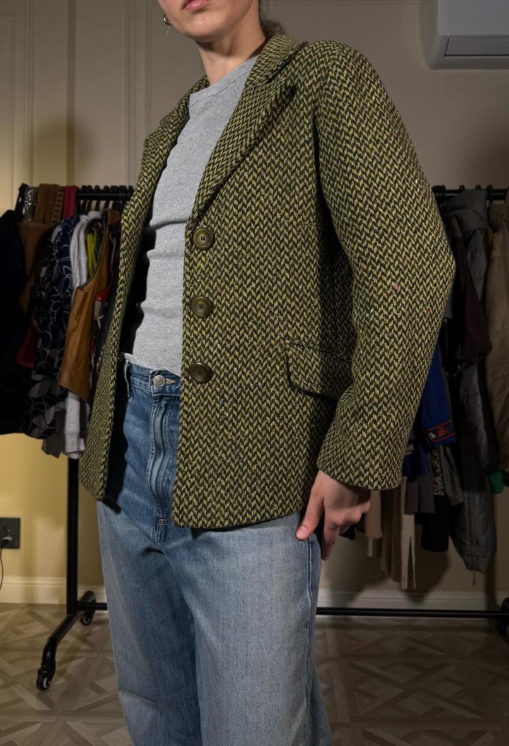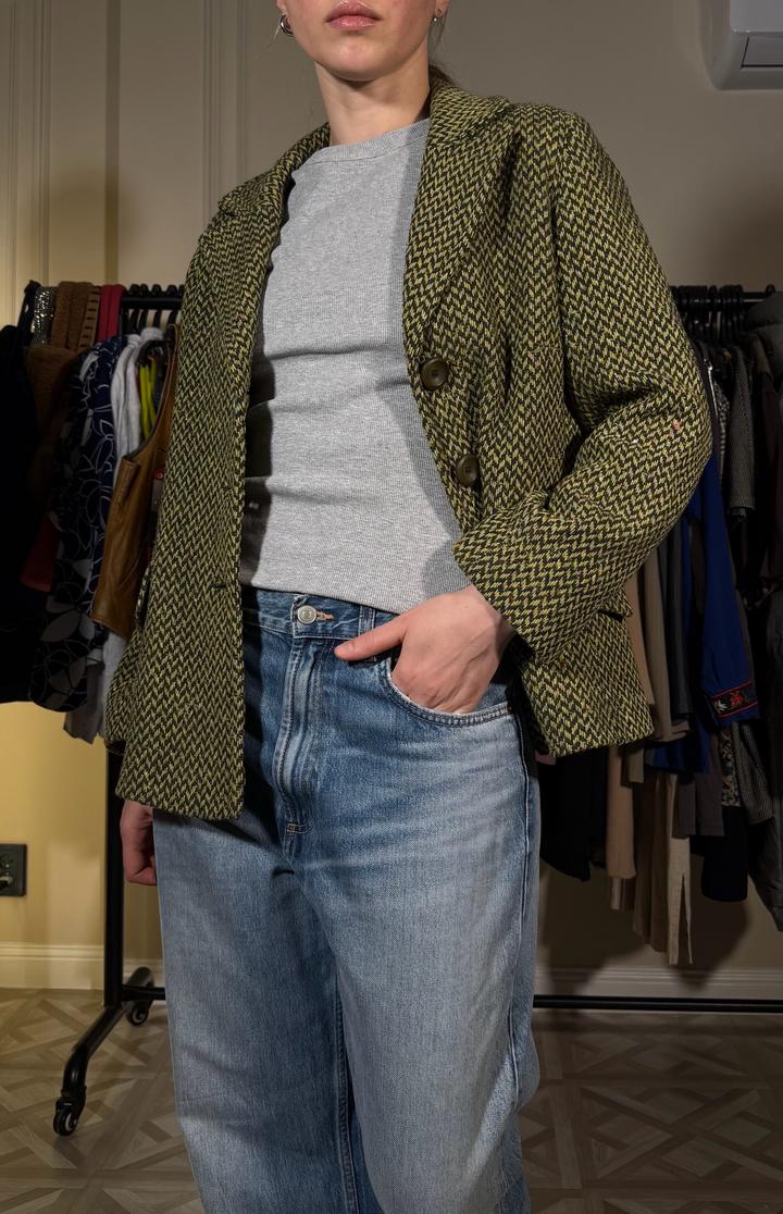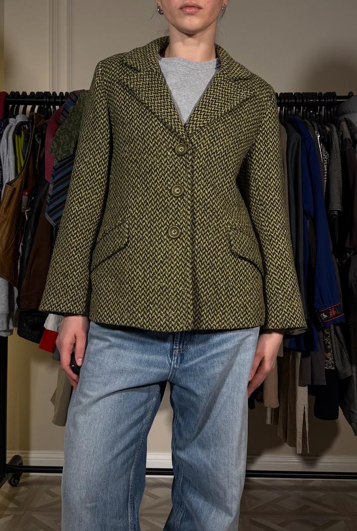 Размер: M Состав: 55% акрил/ 30% шерсть Блейзер из твида зелёного цвета с узором «ёлочка» с мелкими разноцветными вкраплениями. Силуэт приталенный, с акцентом на талию, слегка расклешённый к низу. Воротник классический, с красивыми лацканами. Внутри имеется подклад цвета хаки. Артикул: 583741