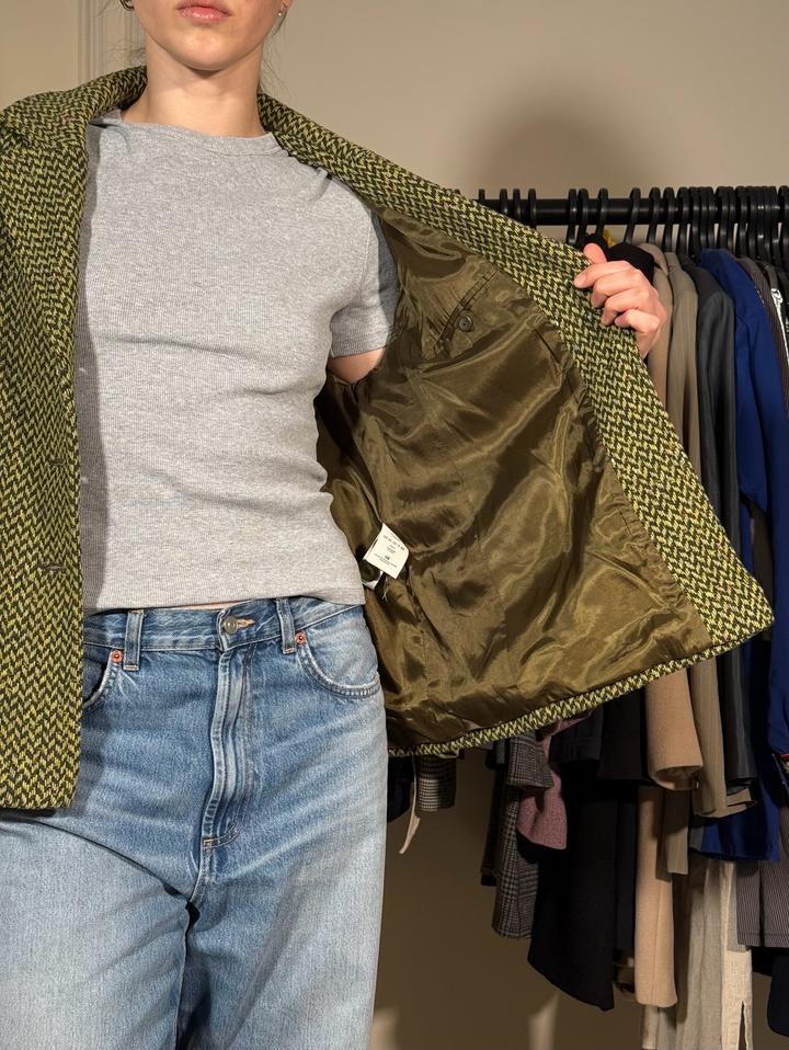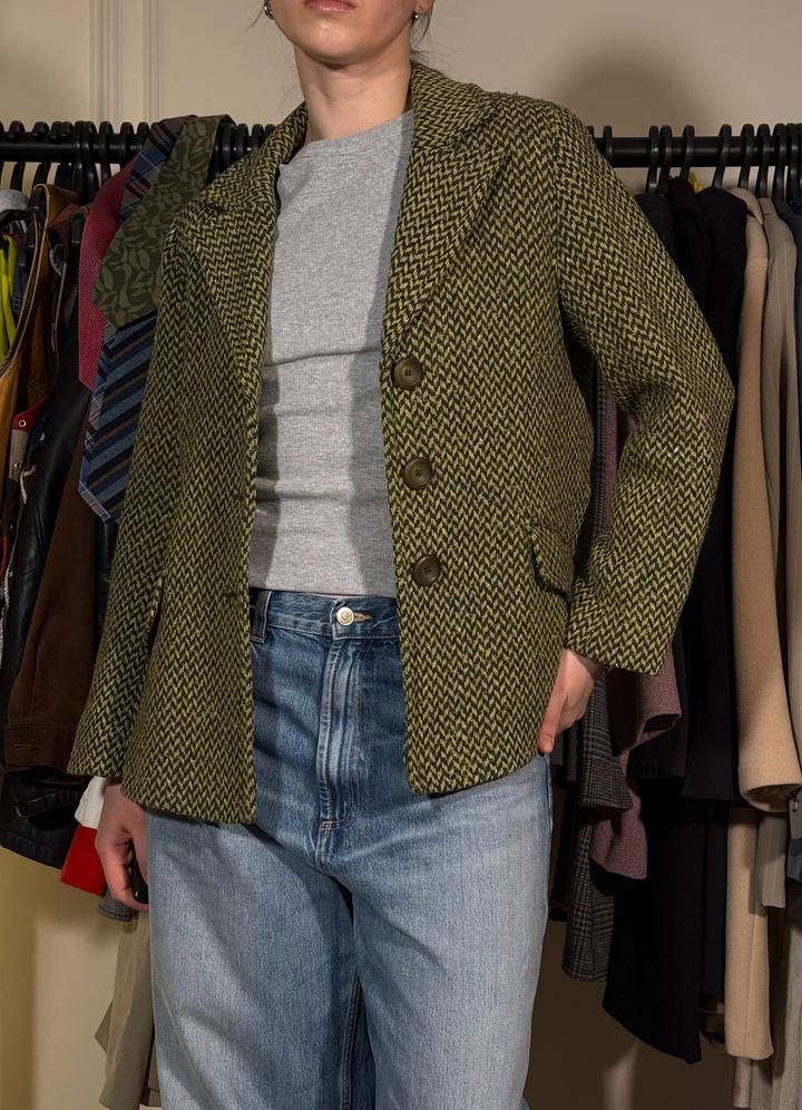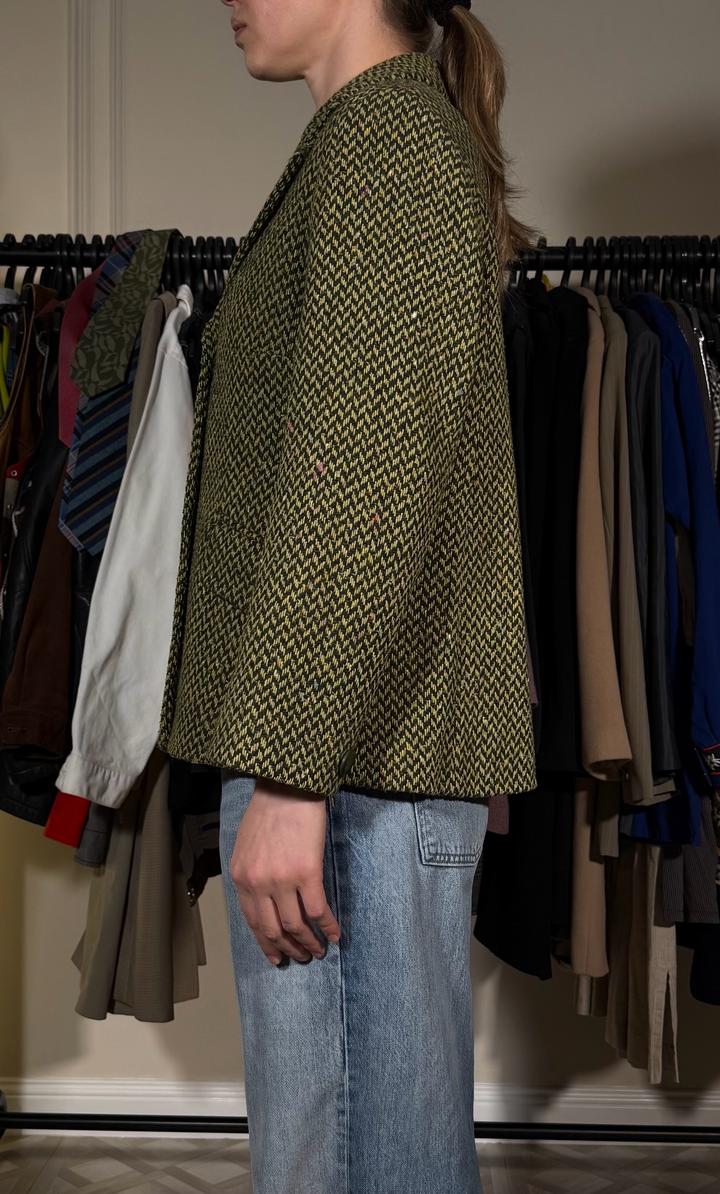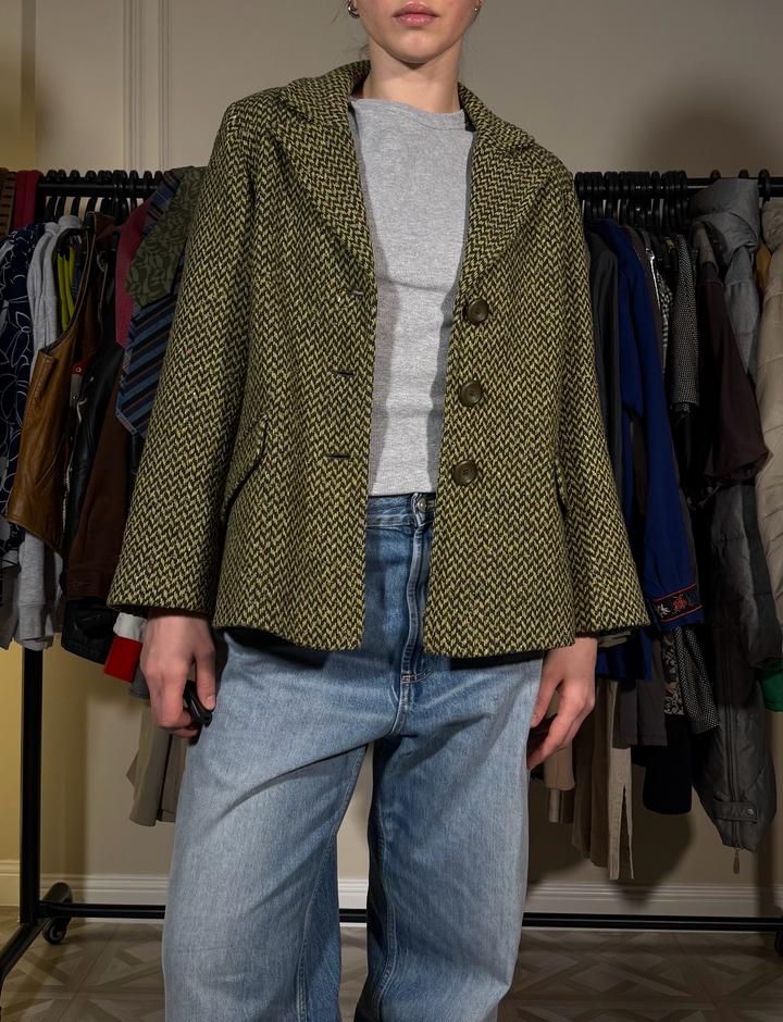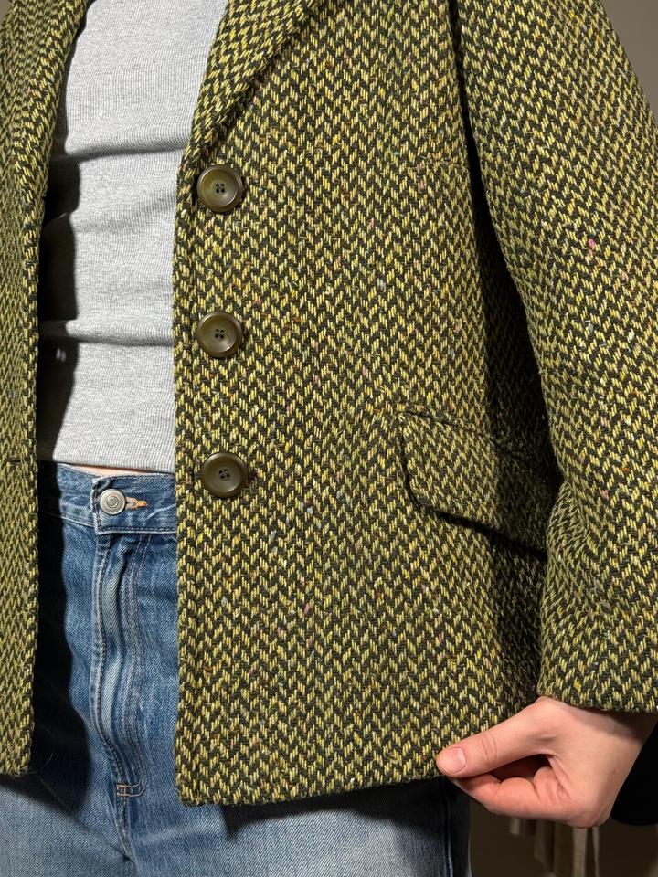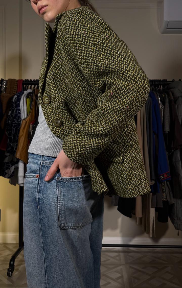Размер: M Состав: 55% акрил/ 30% шерсть Блейзер из твида зелёного цвета с узором «ёлочка» с мелкими разноцветными вкраплениями. Силуэт приталенный, с акцентом на талию, слегка расклешённый к низу. Воротник классический, с красивыми лацканами. Внутри имеется подклад цвета хаки. Артикул: 583741