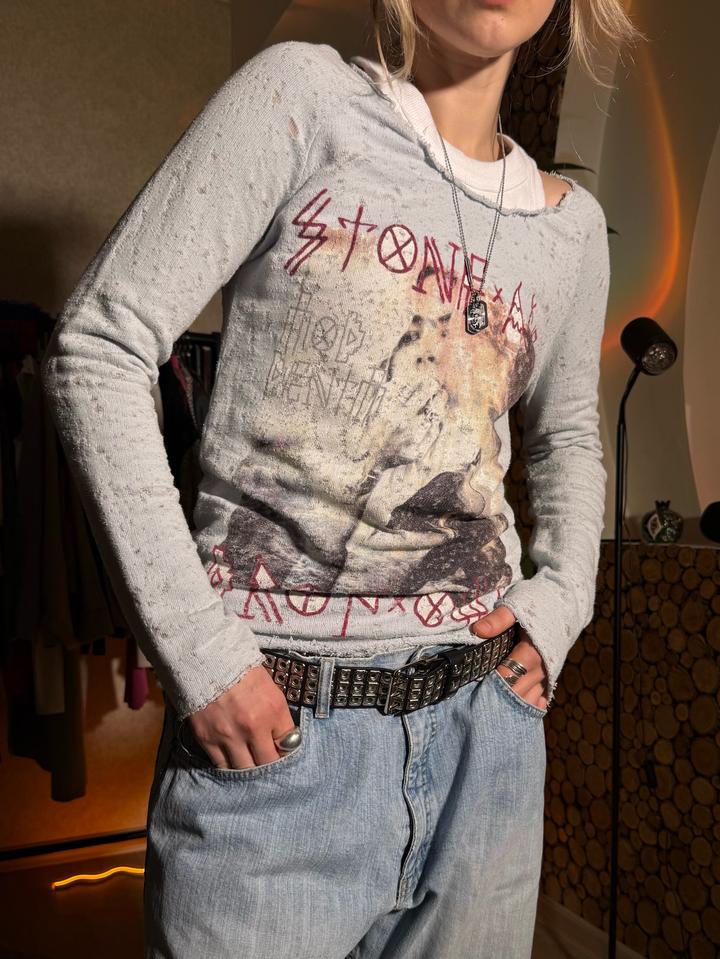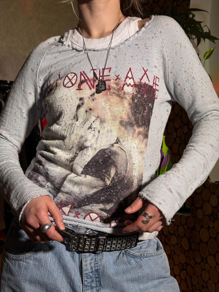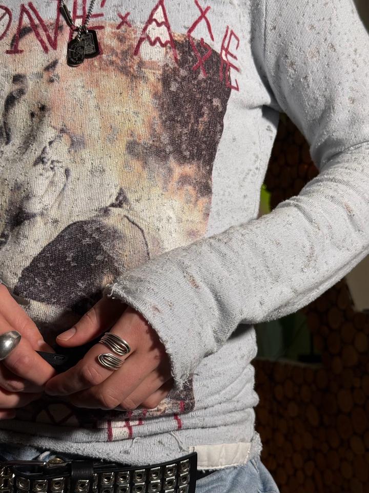 Размер: S-M Состав: 85% хлопок/ 15% полиэстер Гранжевый лонгслив голубого оттенка с крутым принтом 🔥 Материал имеет очень необычную текстуру с потёртостями. Фасон красиво подчеркивает фигуру! Хорошо сядет на размер S. Артикул: 583744
