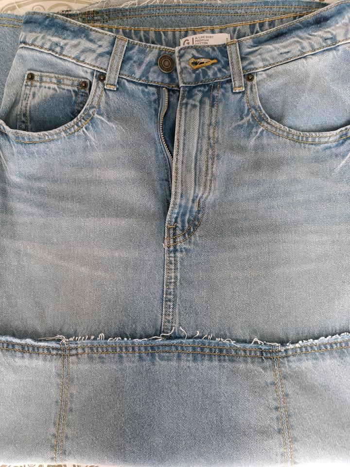Джинсовая юбка ( а силуэт ) в стиле хиппи. Высокая посадка. Сзади присутствует контрастный карман, который создаёт винтажный эффект. Приятный Деним Размер: s Мои параметры и параметры изделия ( последнее фото) . Юбка новая ( без этикетки) Артикул: 583808