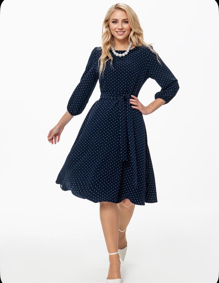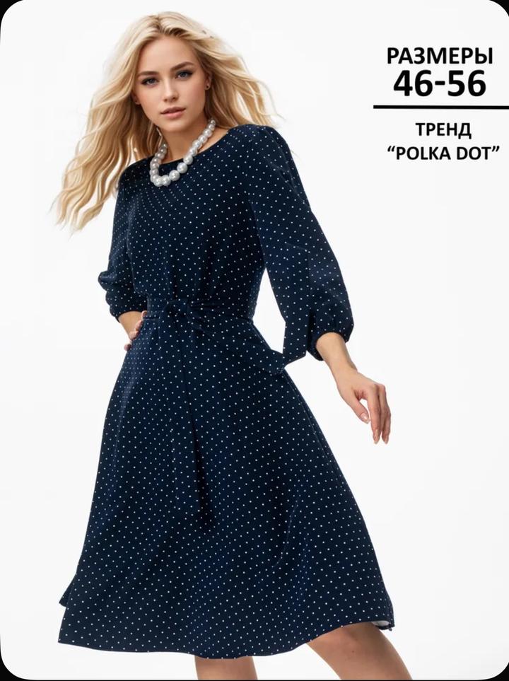 Платье женское больших размеров с не длинным рукавом 3/4 из вискозной ткани с средней плотности. Платье осеннее чуть шелковистое без разреза и отрезное по талии с поясом в комплекте стройнит, вытягивает силуэт и делает образ элегантным и женственным. Платье с рукавами фонариками подойдет для прохладного времени года, включая осень. Платье в горошек выглядит стильно и изящно, может пригодится на протяжении всего года, в том числе на осень и весну. С помощью уникального модного современного дизайн Артикул: 584151