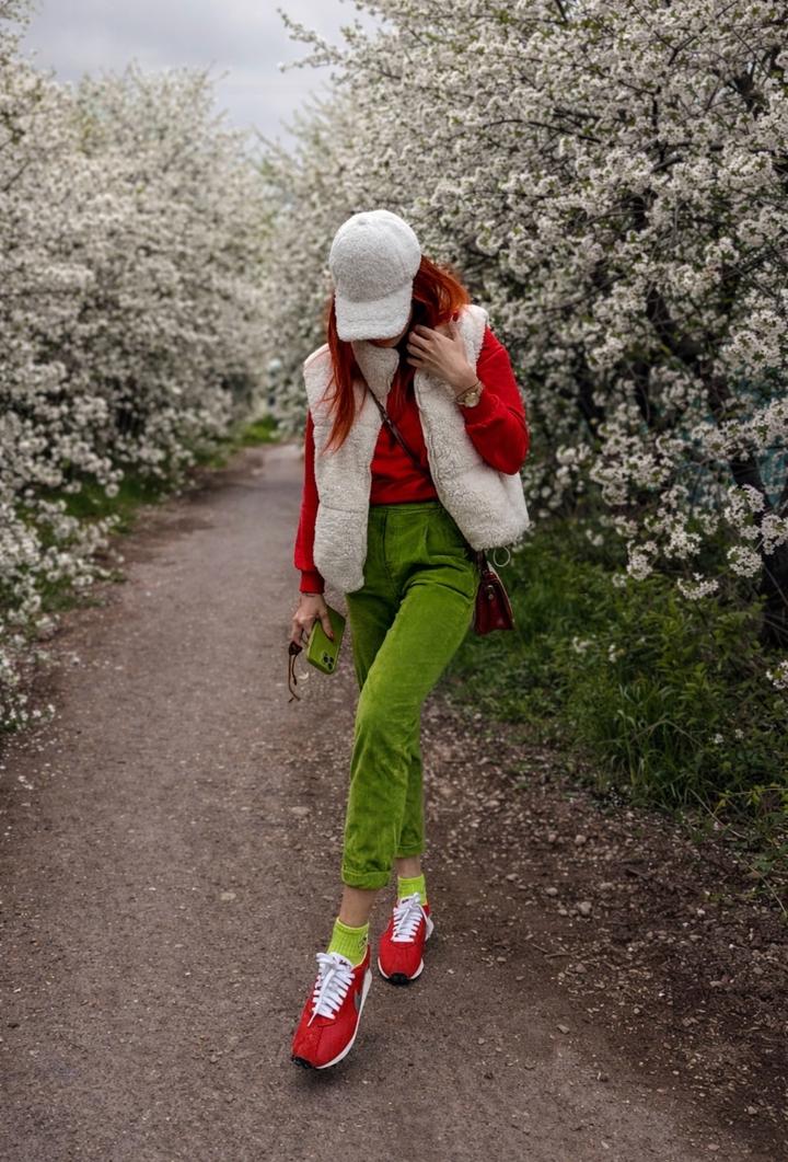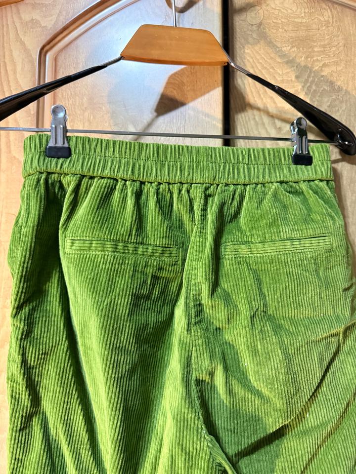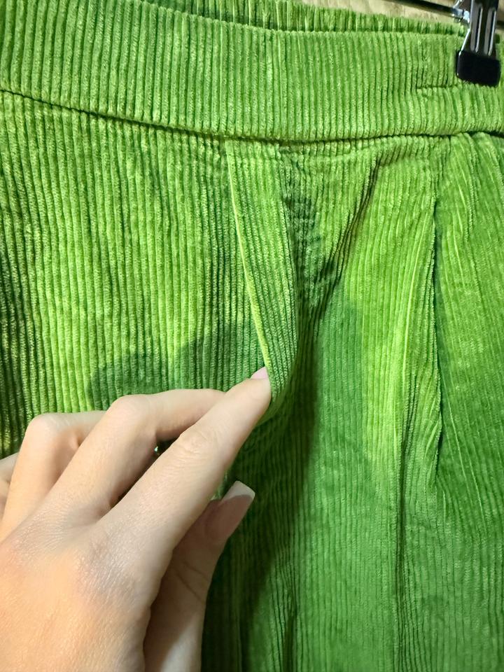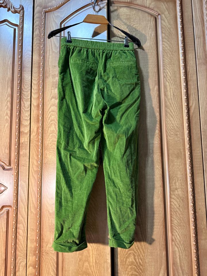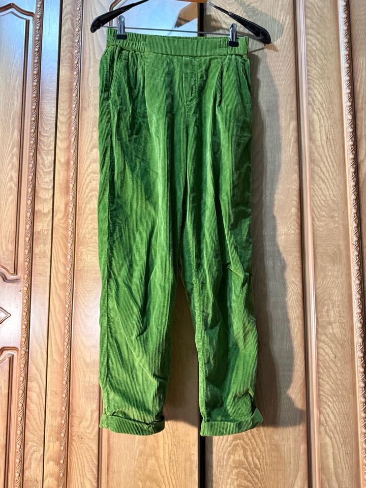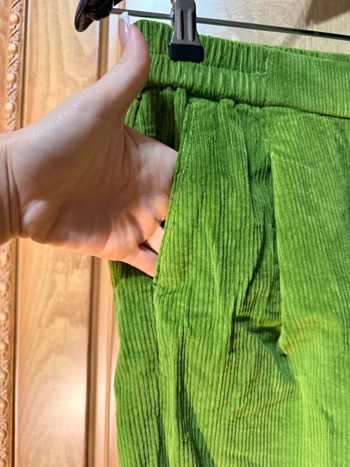 Женские брюки ярко-зелёного цвета из вельветовой ткани (в рубчик). Свободный крой, заужены к низу. Пояс на резинке. Есть боковые карманы. Материал плотный, мягкий, держит форму. Артикул: 584160