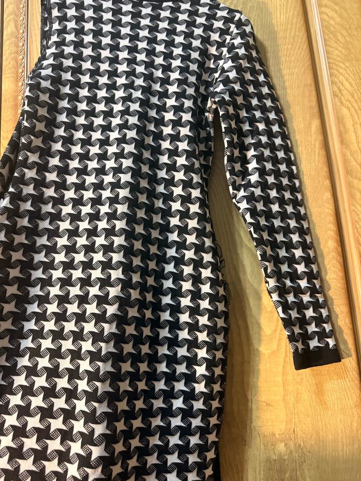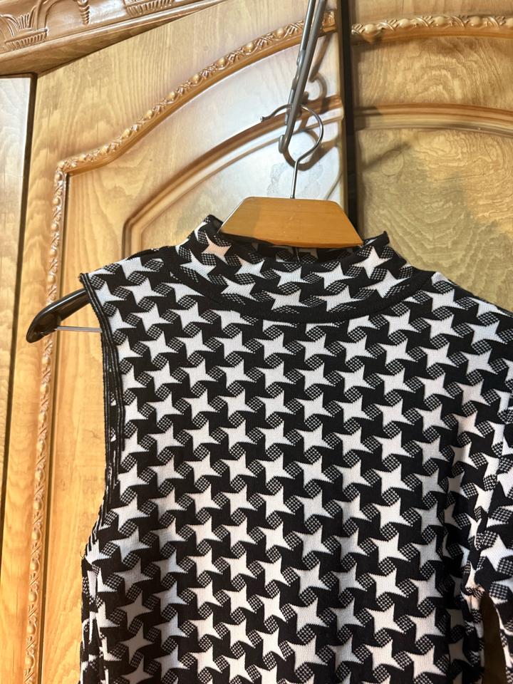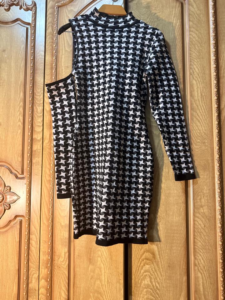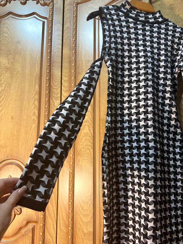 Стильное тёплое платье от ASOS с эффектным геометрическим принтом 🖤🤍 — плотный трикотаж (держит форму, не просвечивает) — необычный асимметричный крой — один рукав + декоративная вставка (пришита, не отдельная) — высокая горловина — идеально садится по фигуре Смотрится очень эффектно за счёт дизайна — не базовое платье, а вещь с характером. Подойдёт: — на выход / ужин — для фото и Instagram — как акцентный образ Легко стилизуется: сапоги, каблуки, пальто — и уже полноценный лук. Артикул: 584246