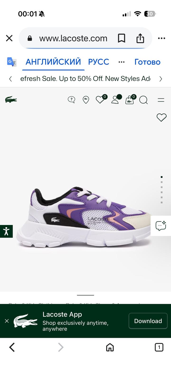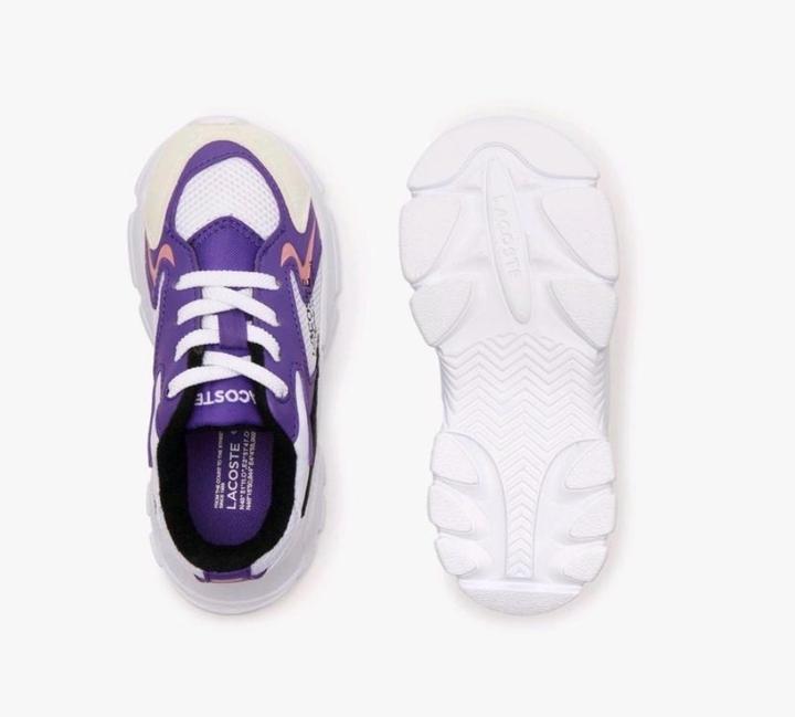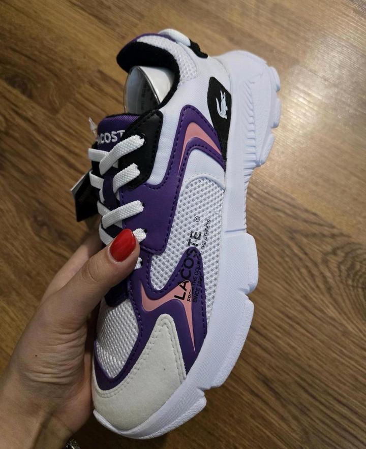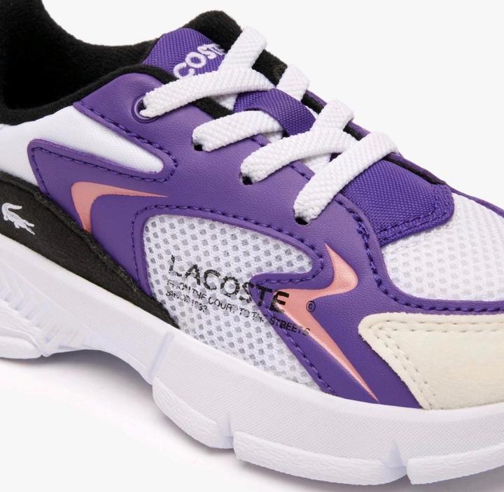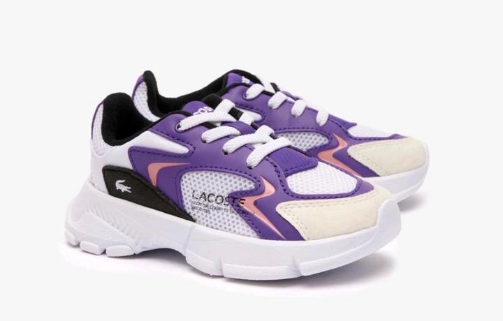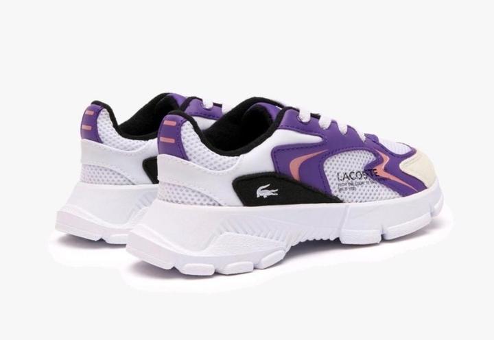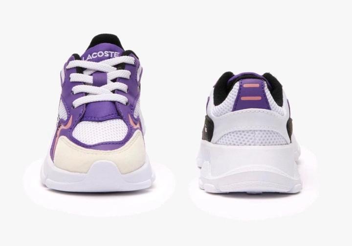 кроссовки Lacoste L003 Neo. Дизайн: Современный силуэт в стиле лайфстайл, сочетающий белый, фиолетовый и черный цвета. Материалы: Верх выполнен из дышащей сетки с накладками из синтетических материалов (ПУ и замша) для дополнительной поддержки. Детали: Фирменный логотип Lacoste в виде крокодила расположен на боковой части и на пятке; массивная подошва обеспечивает хорошую амортизацию и сцепление. Артикул: 584292