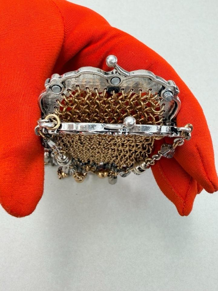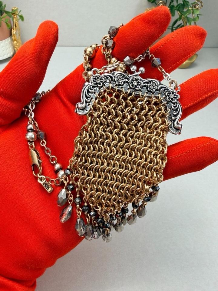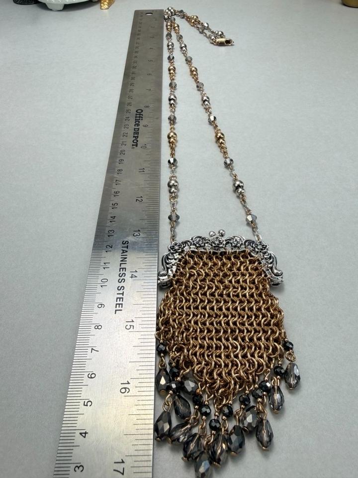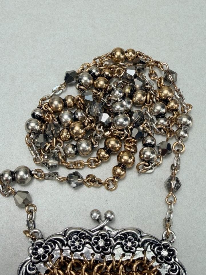 Ожерелье со множеством металлических звеньев и бусин. С подвеской сумочкой из металлических звеньев с контрастными аппликациями из бусин. Застежка-карабин Артикул: 584517