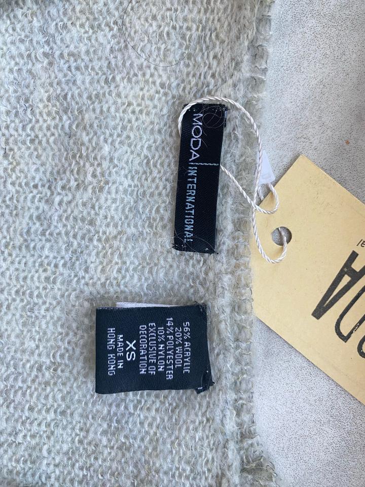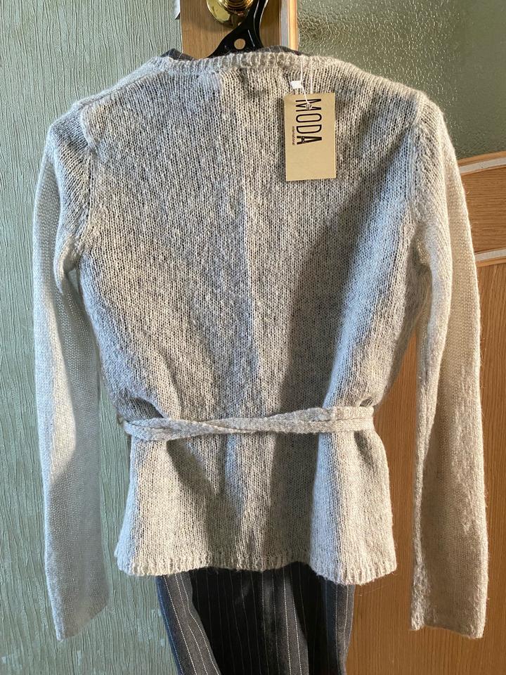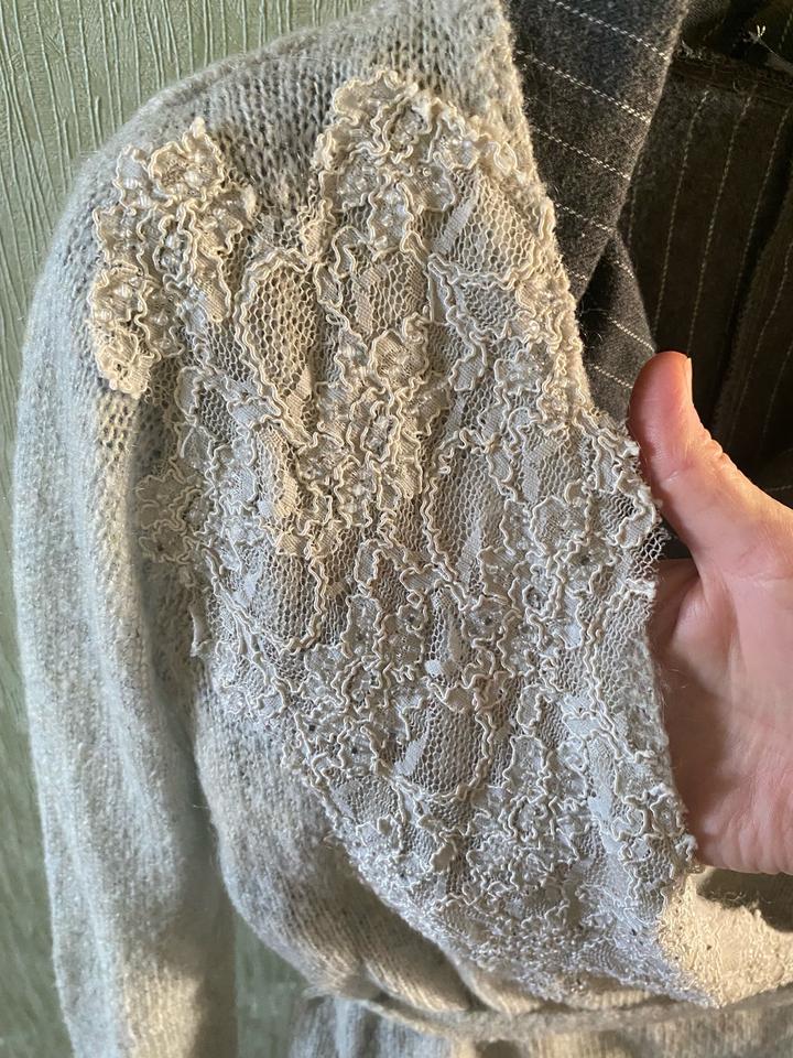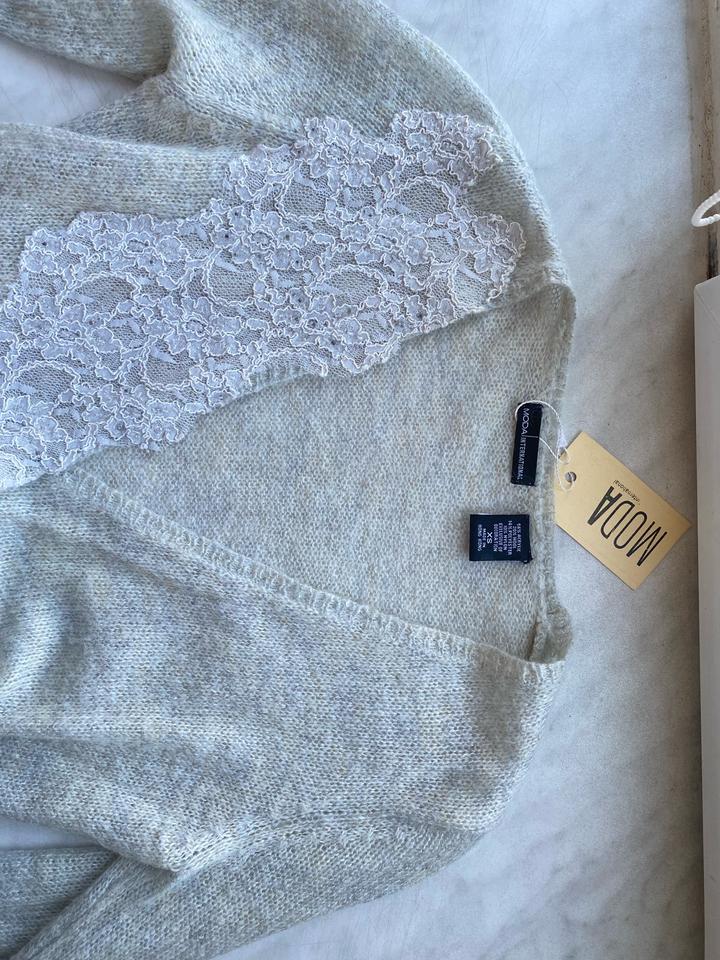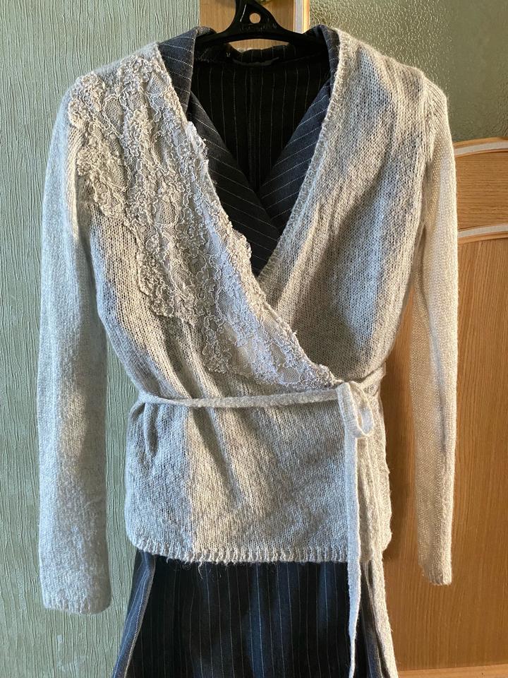 вязаный кардиган с запахом, декорированный кружевом вдоль выреза и на нем же бисер, с поясом-завязкой на талии. отлично для стиля нью лук и незаменимая вещь гардеробе. Тоненький, но теплый, так как в составе есть акрил и шерсть. Цвет светло серый. Брала в Victoria’s Secret. Артикул: 584596