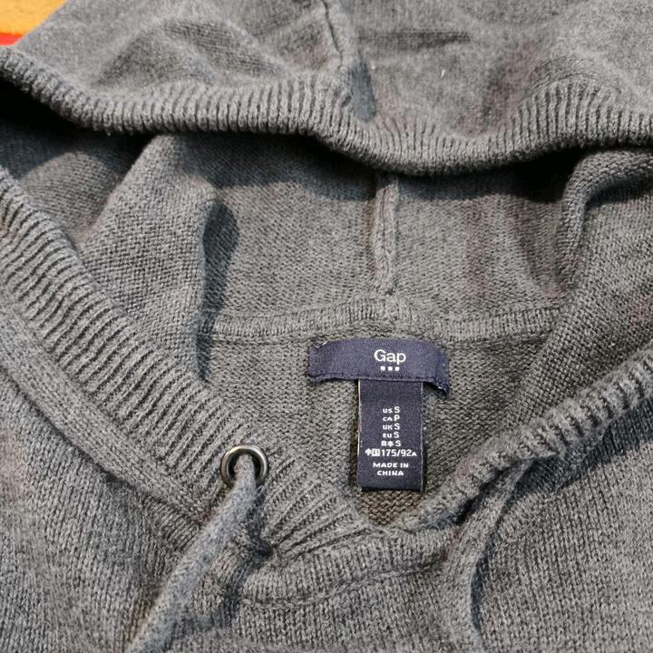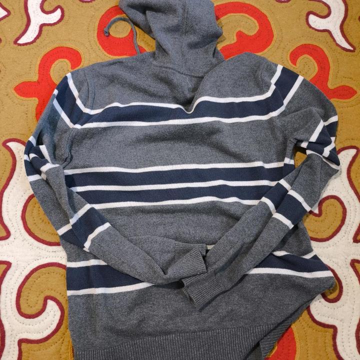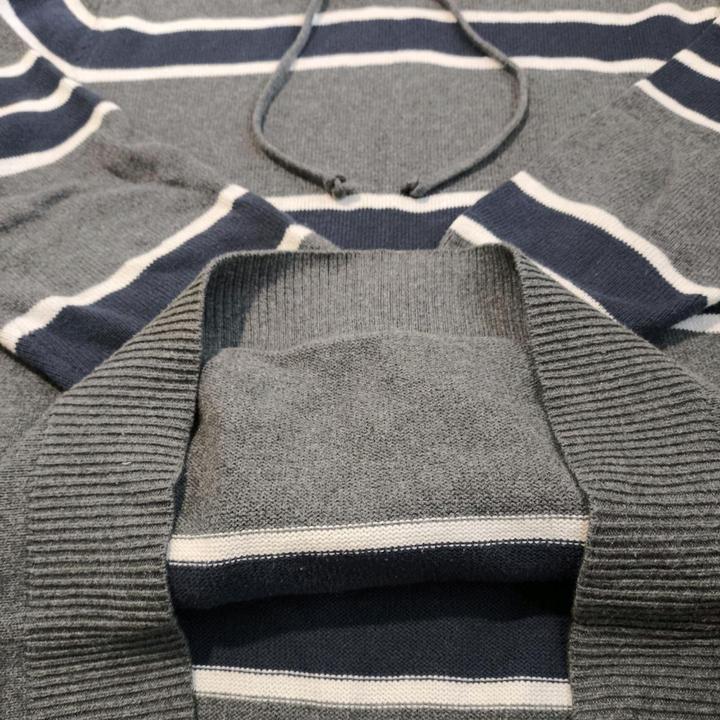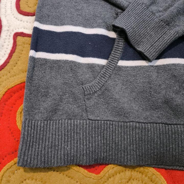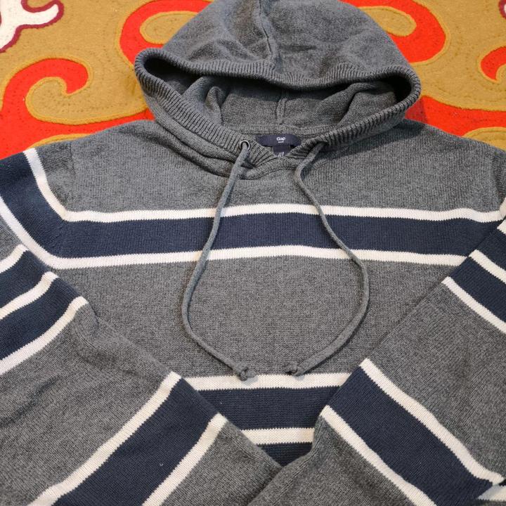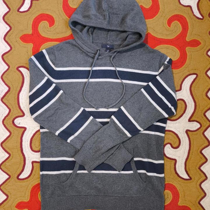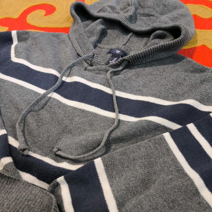Худи от GAP Тип изделия: Вязаный мужской худи от бренда Gap в серую, темно-синюю и белую полоску. Модель выполнена из 100% хлопка и относится к категории трикотажных свитеров с капюшоном (pullover hoodie). Основные характеристики изделия: Бренд: Gap. Материал: Плотный хлопковый трикотаж. Дизайн: Горизонтальные полоски темно-синего и белого цвета на сером фоне; капюшон на завязках-кулисках и накладной карман-кенгуру спереди Артикул: 586060