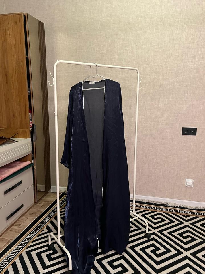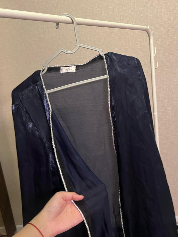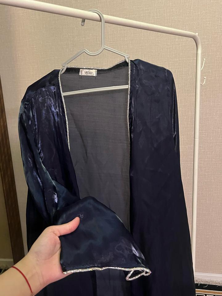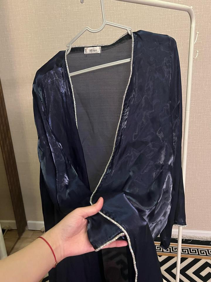 Абайка из органзы темно синего цвета, носила один раз потом покрылась и не смогла стилизовать из за чего он полу прозрачный. Под солнцем очень красиво цветит, Размер С но подходит на М и Л Артикул: 586091