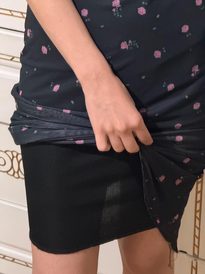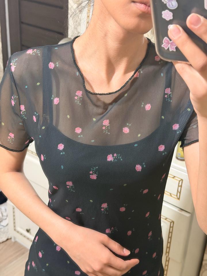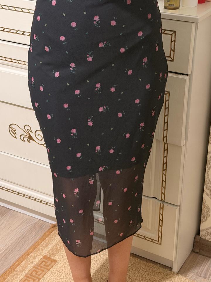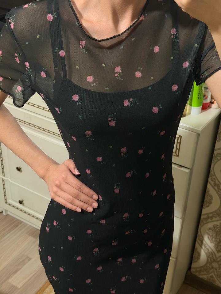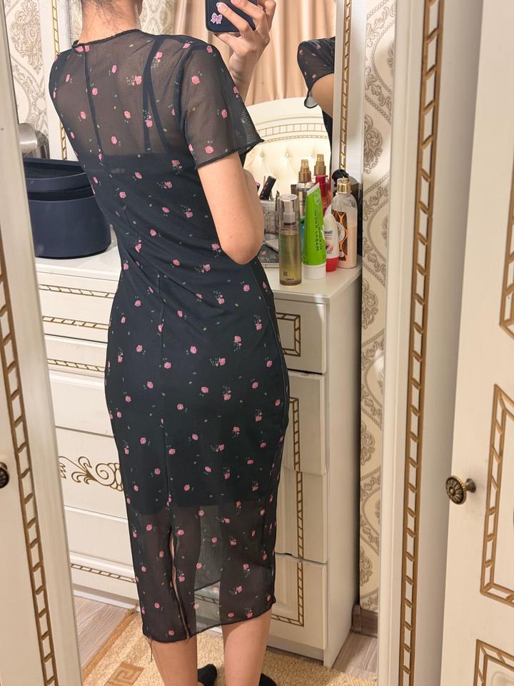 темносинее приталенное платье миди с нежным цветочным принтом,сверху-полупрозрачная сетка с коротким рукавом, внутри - плотная подкладка.(отдельно) красиво подчеркивает фигуру, есть разрез сзади. легкое, женственное платье. Артикул: 586160