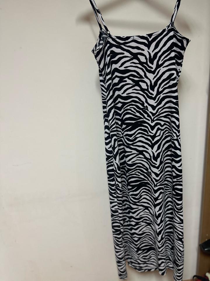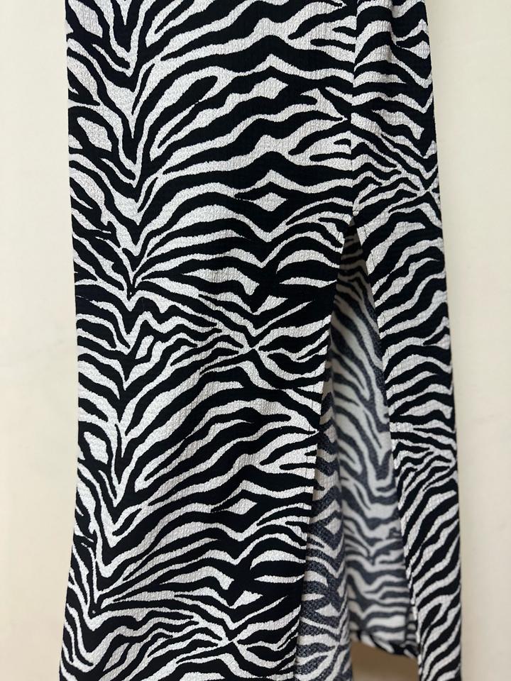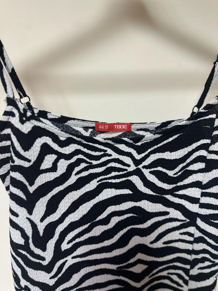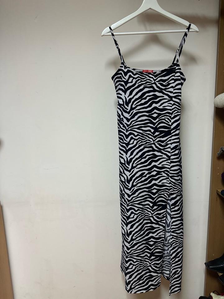 Платье в зебровом принте с тонкими бретелями и аккуратным разрезом. Лаконичный крой подчёркивает фигуру, создавая вытянутый силуэт. Лёгкая фактура ткани добавляет интереса. Универсальный вариант: носить с кедами днём или с каблуками вечером. Артикул: 586189