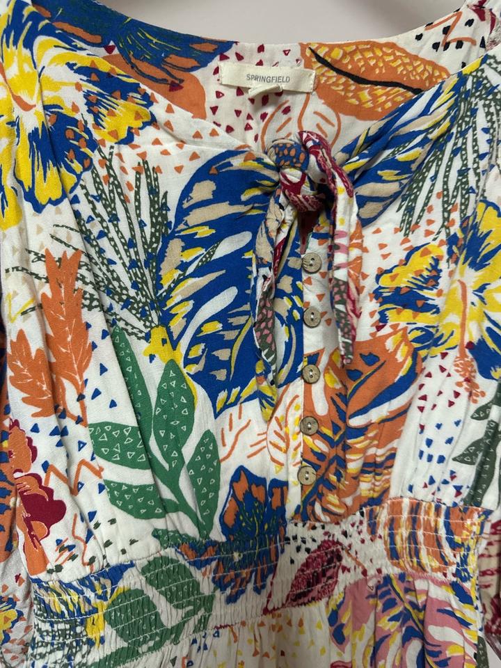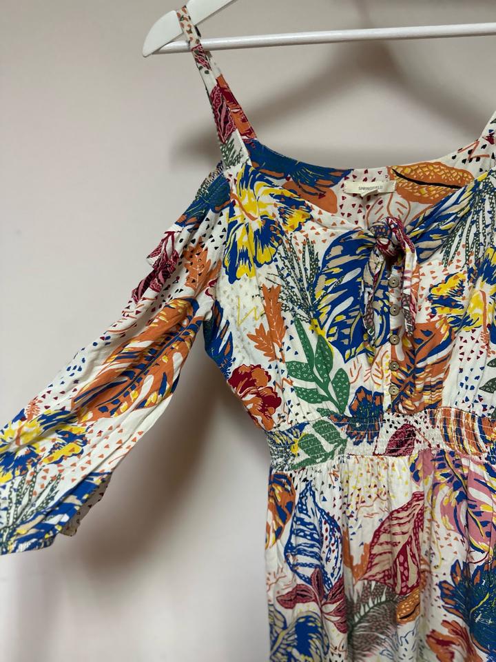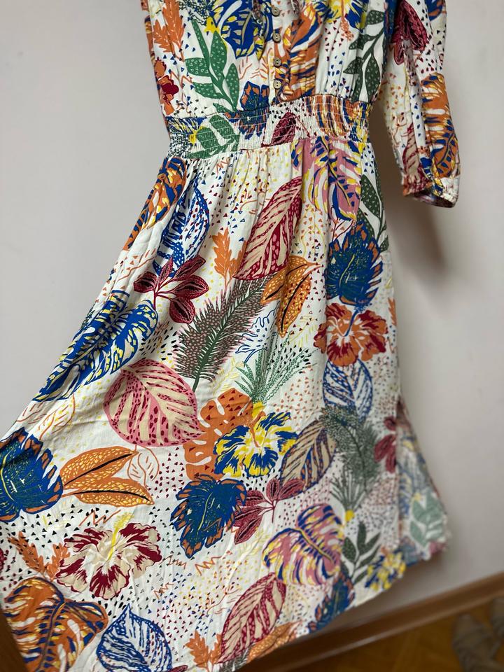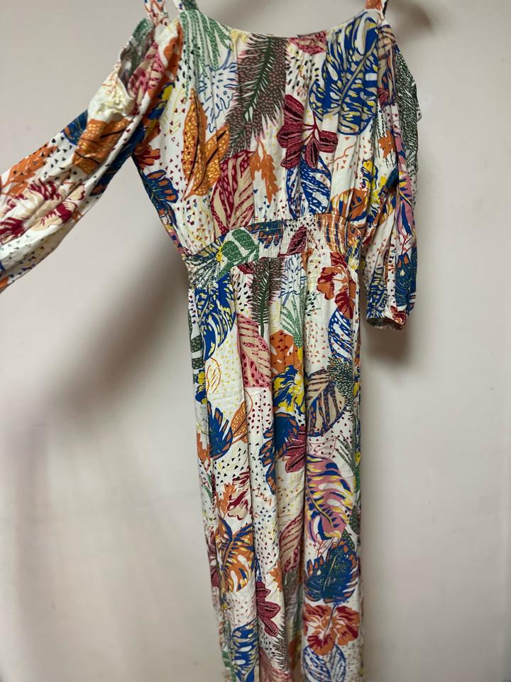 Платье с ярким тропическим принтом, открытыми плечами и завязкой на груди. Лёгкая вискоза, комфортная посадка, акцент на талии за счёт резинки. Свободный рукав добавляет объёма. Отлично для лета и отпускных образов. На размер XS-S Артикул: 586198