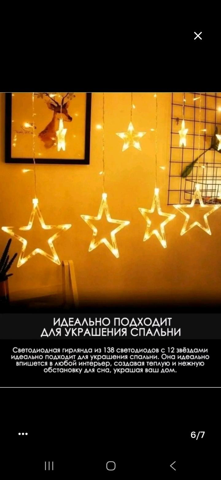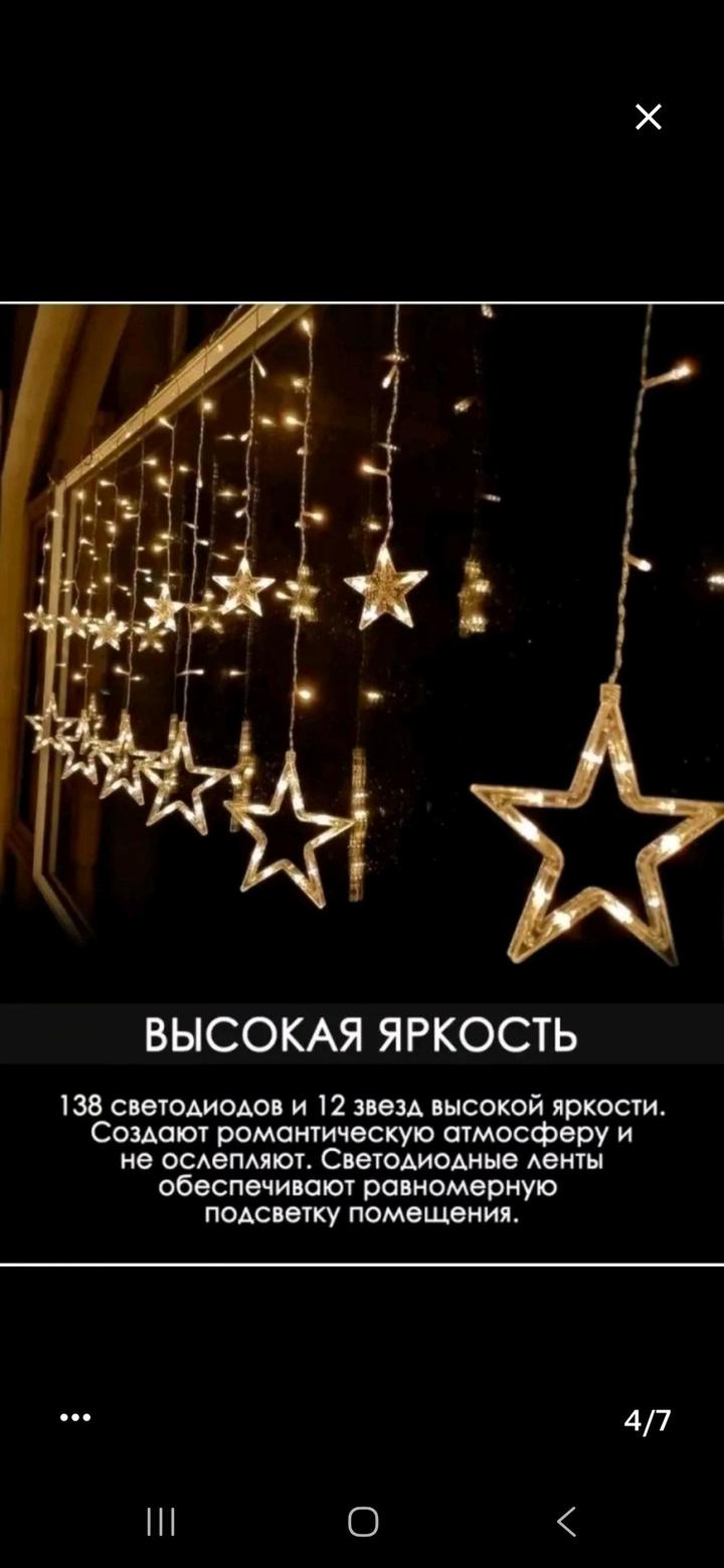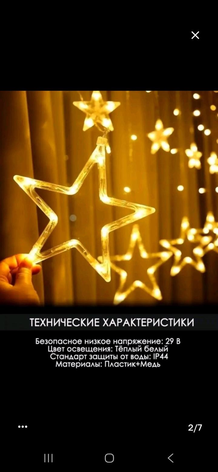 2 гирлянды по цене одной. Выполнены в виде звезд и колоколов 3 метра×1 метр в высоту. Идеальное освещение, создают уют и волшебность. Продаю в связи с переездом. Работают на ура 🙌 Артикул: 586352