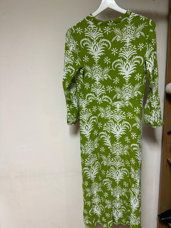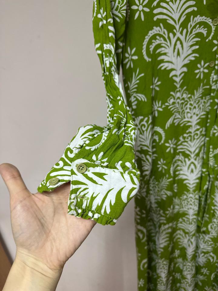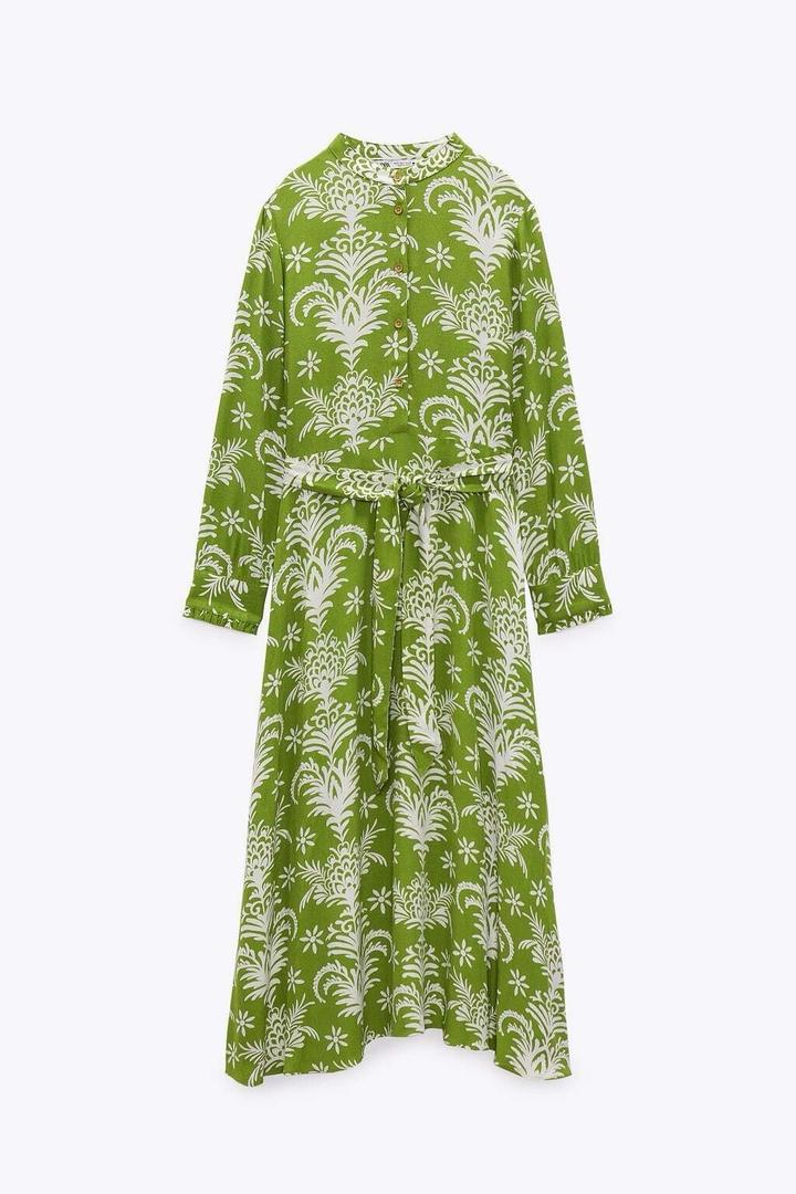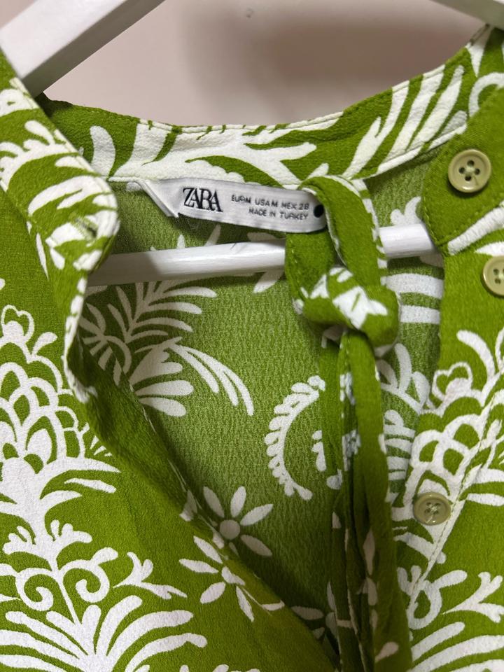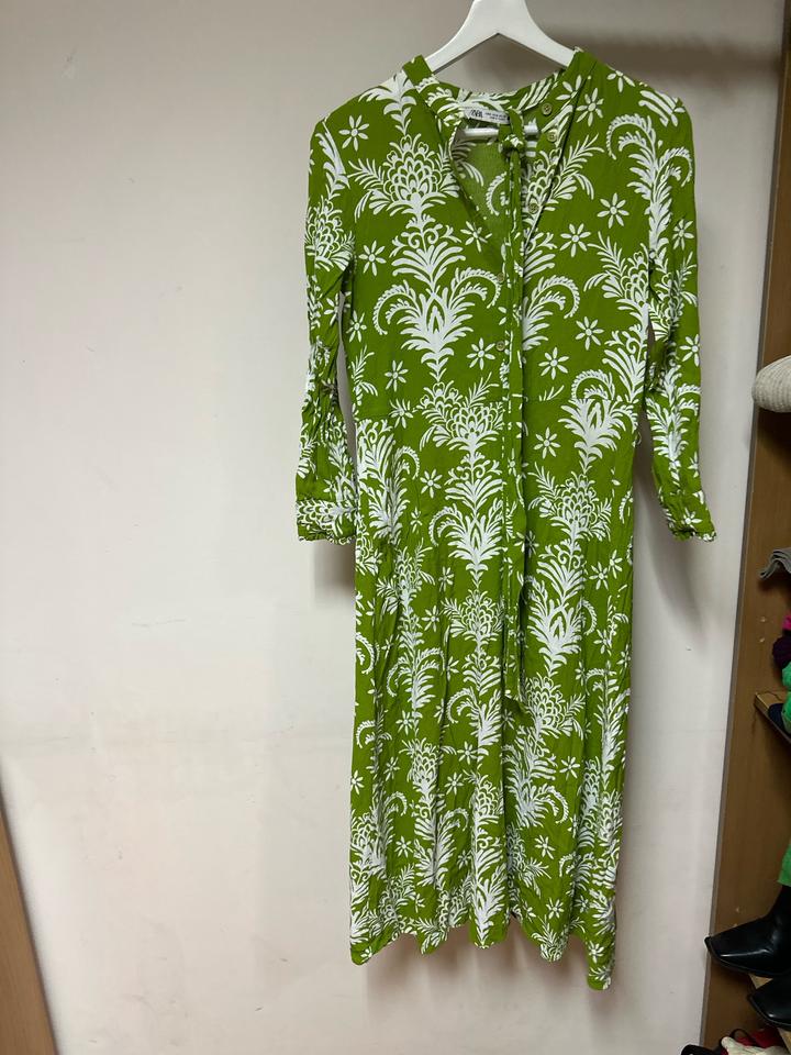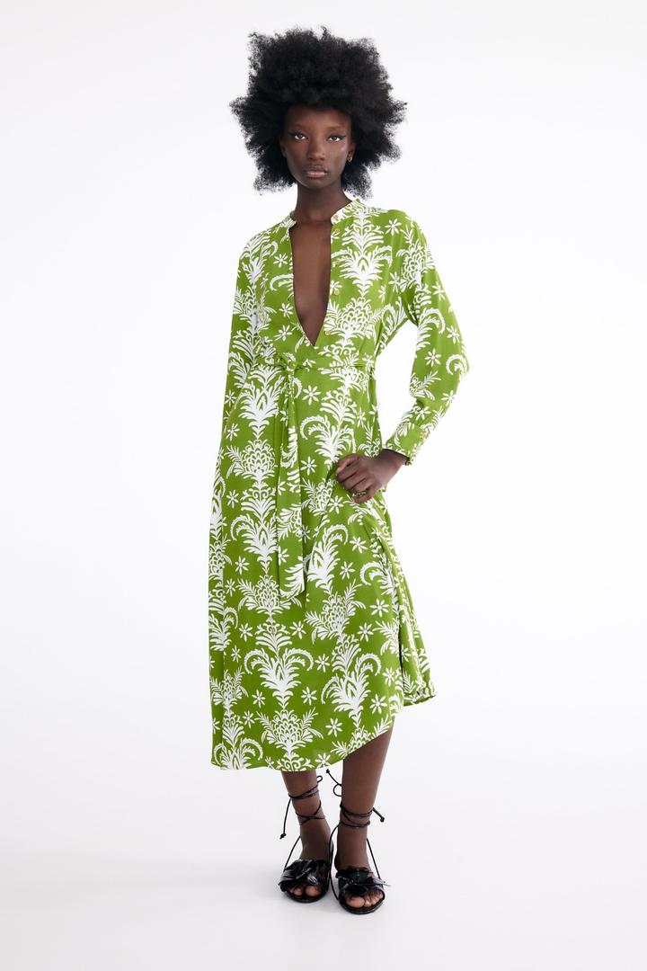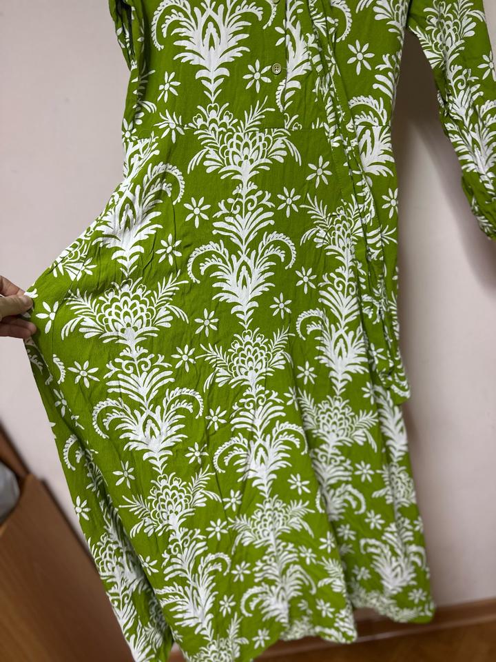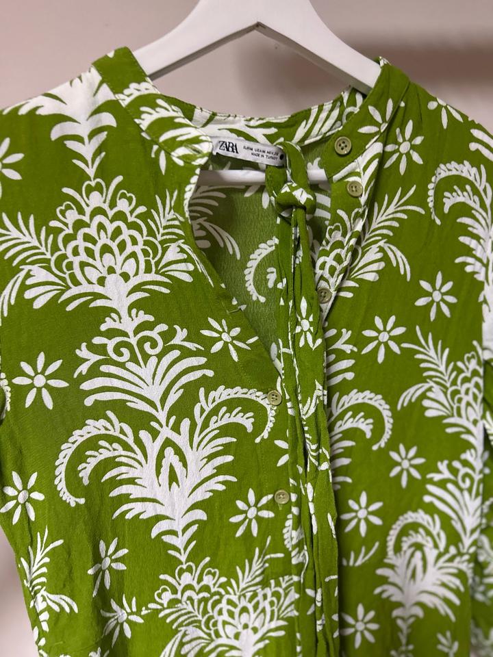 Зелёное платье Zara с белым орнаментом — свежий и заметный вариант на каждый день. Лёгкая ткань вискоза красиво струится, создавая мягкий силуэт. Модель с V-вырезом, завязками и пуговицами спереди. Длина миди, посадка свободная, комфортная. Отлично смотрится с сандалиями или кедами. Поясок в комплекте Артикул: 586389