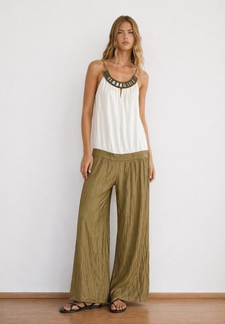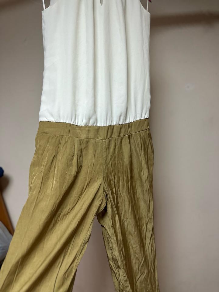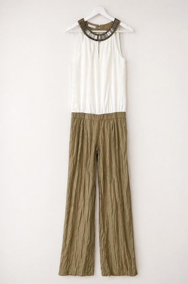 Комбинезон Promod в стиле effortless chic 🤍 Лёгкий струящийся верх молочного оттенка с эффектным декорированным воротом, низ — прямые брюки в бежево-оливковом цвете с красивой фактурой. Смотрится дорого и необычно, идеально на выход или летние мероприятия. Артикул: 586406