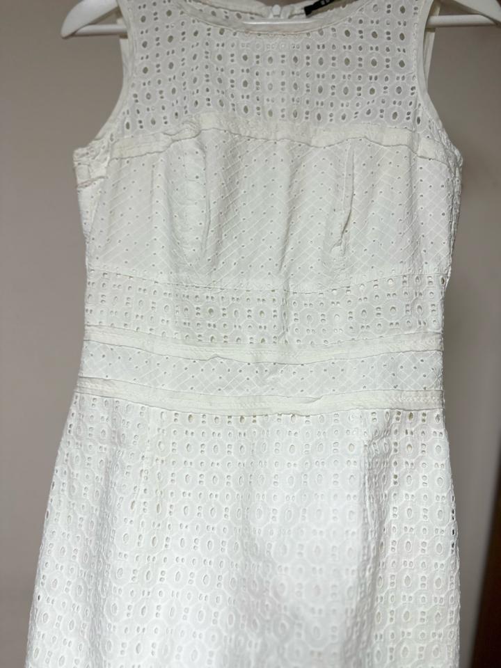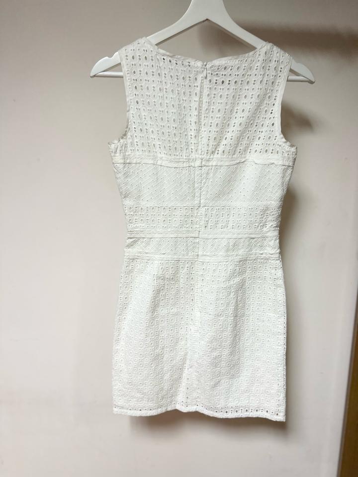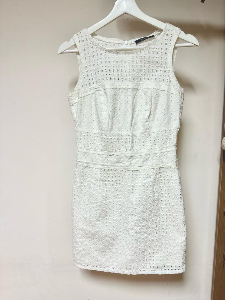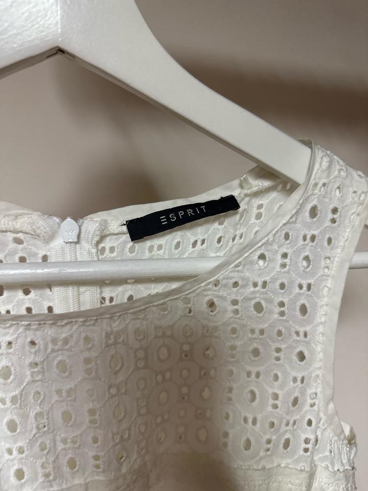 Белое платье Esprit. Приталенный силуэт, длина мини. Выполнено из хлопкового кружева (шитьё), смотрится нежно и аккуратно. Без рукавов, с подкладом, застёжка на молнии сзади. Идеально на лето или на выход. На разсер XS-S Артикул: 586446