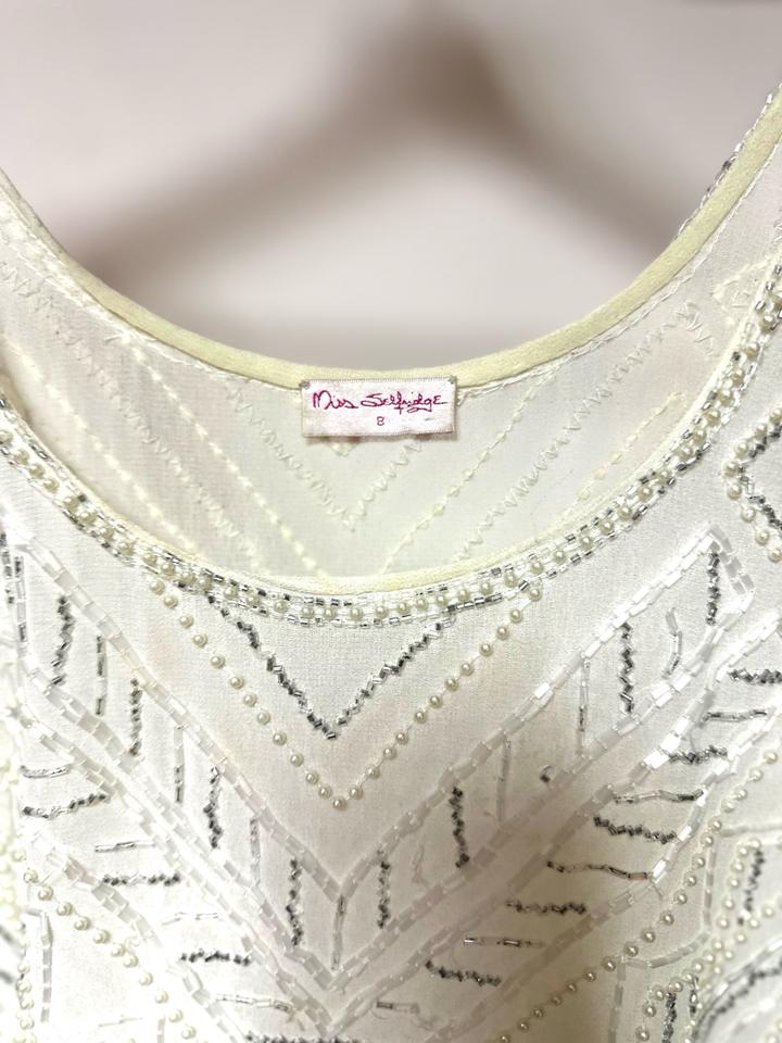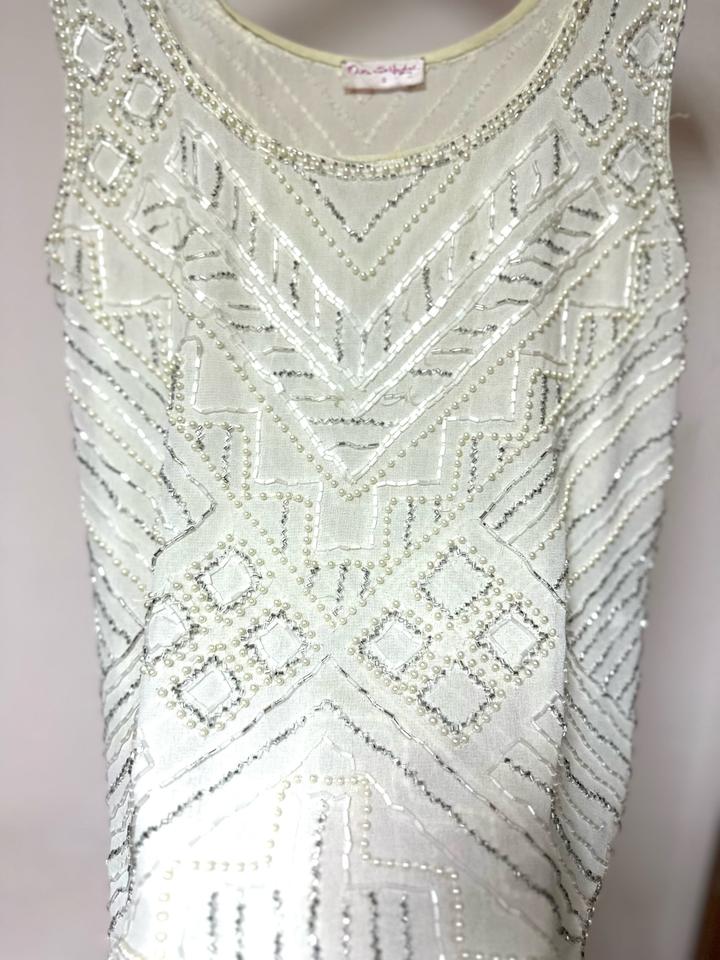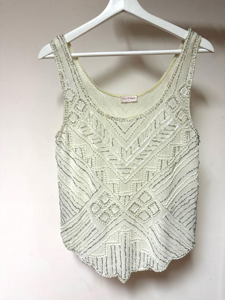 Эффектный топ в стиле винтаж / ретро с богатой ручной отделкой. Полностью расшит бисером и стеклярусом в геометрическом узоре — выглядит очень дорого и атмосферно, в духе 20-х (арт-деко). Молочный оттенок, аккуратный вырез, слегка укороченный силуэт. Идеально для вечерних образов, фотосессий или как акцентная вещь в гардеробе. ✨ Вещь с характером — сразу делает образ “не как у всех» Артикул: 586573