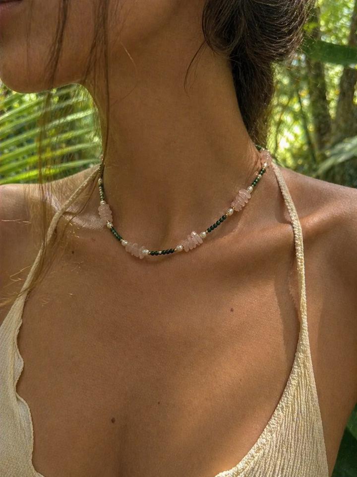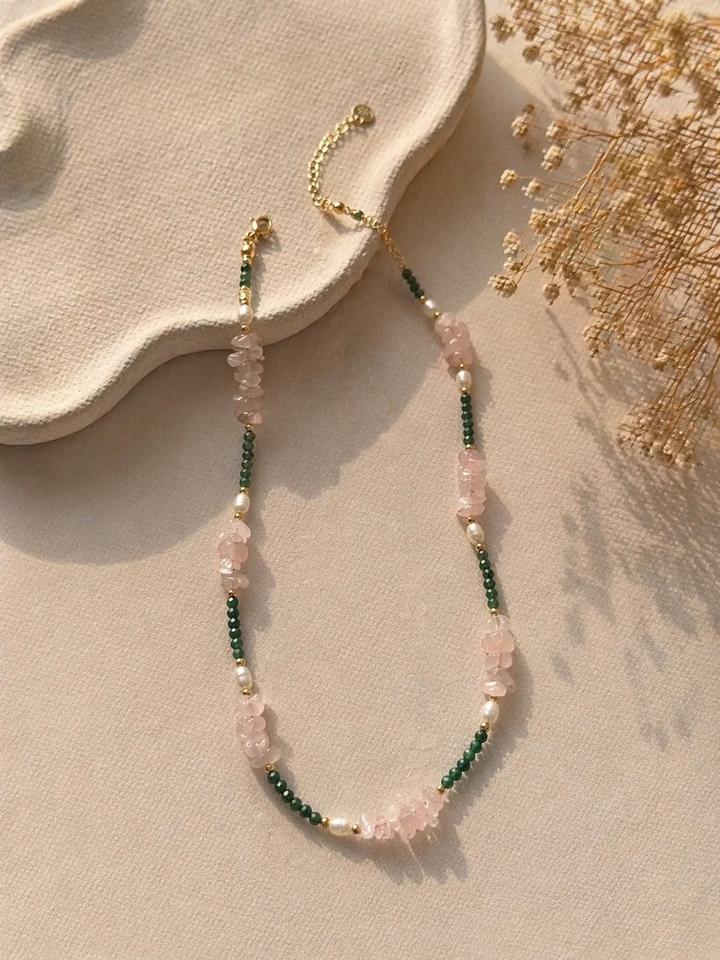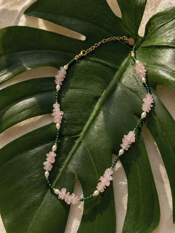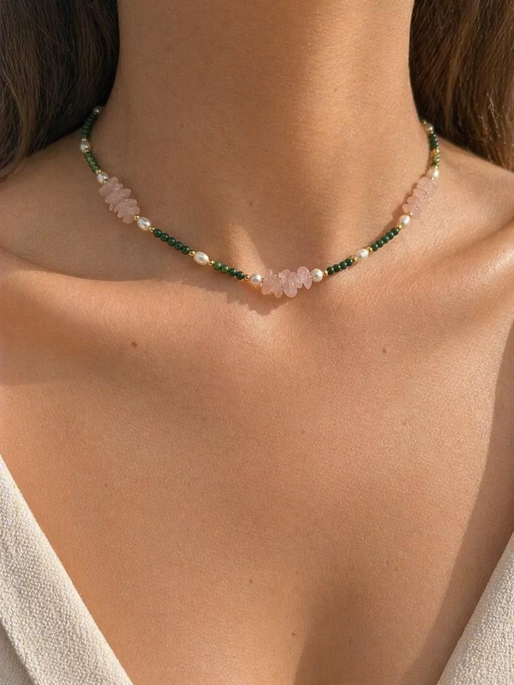 Розовый кварц, зелёный турмалин и натуральный жемчуг — сочетание, в котором есть мягкость, глубина и баланс. Каждый камень живой, с естественной фактурой и лёгким сиянием. Нежный розовый оттенок добавляет образу женственности, зелёный — спокойствия и внутренней силы. Жемчуг и позолоченная фурнитура создают тёплый, деликатный блеск. Чокер аккуратно ложится по шее, подчёркивая линию ключиц и делая образ завершённым — без лишнего. Собран вручную. В одном экземпляре. Артикул: 586592