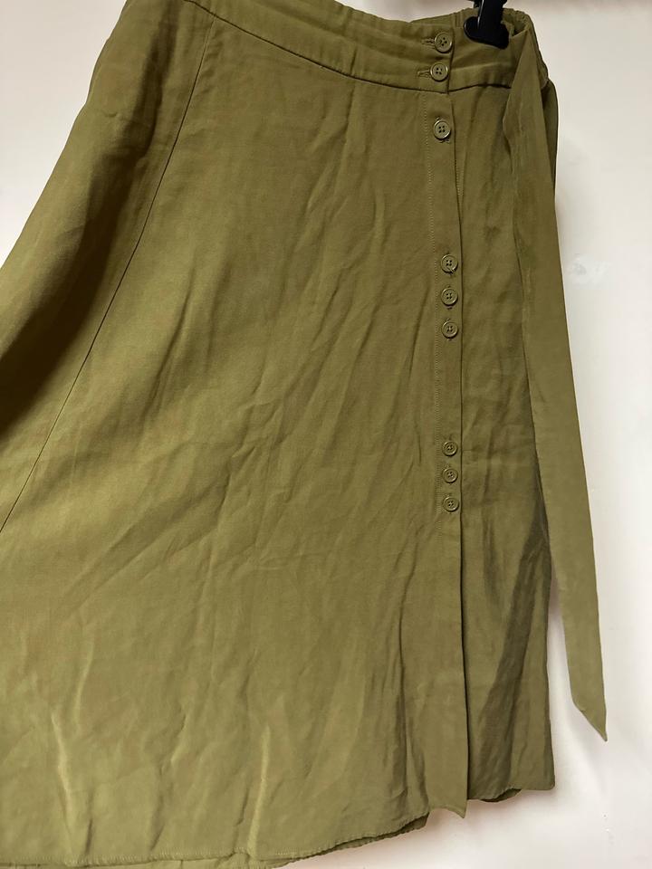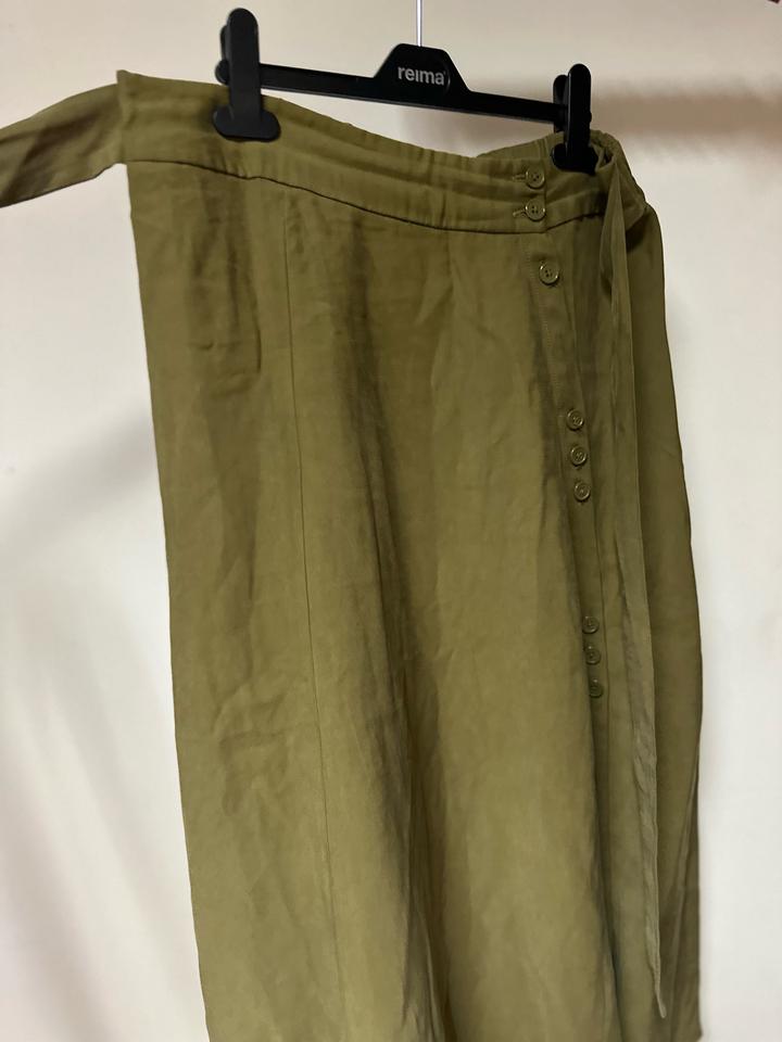 Лёгкая струящаяся юбка с эффектом запаха и декоративными пуговицами из смеси льна и хлопка. Универсальный оттенок хаки делает её идеальной базой под любой гардероб — от кэжуал до более собранных образов. Красиво движется при ходьбе, подчёркивает талию и добавляет образу лёгкости. Идеальна с топами, рубашками и базовыми футболками. Артикул: 586602