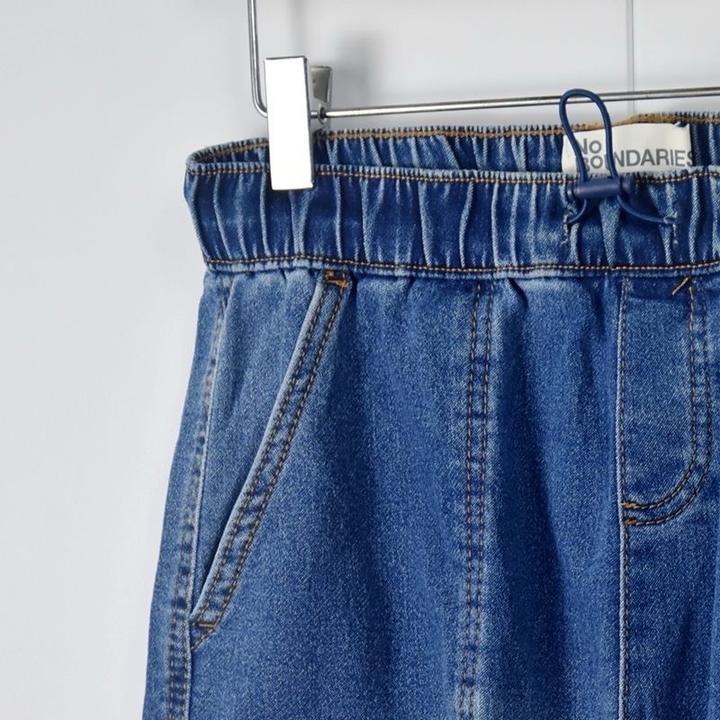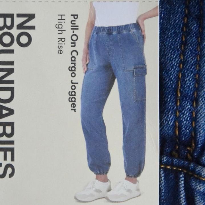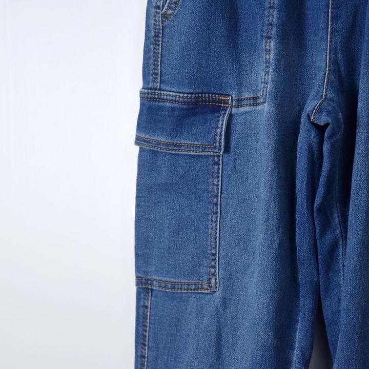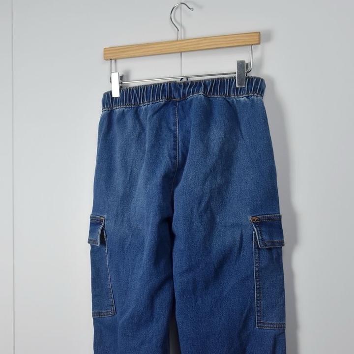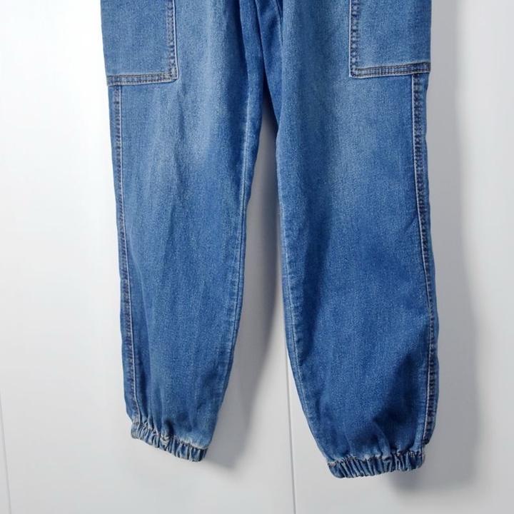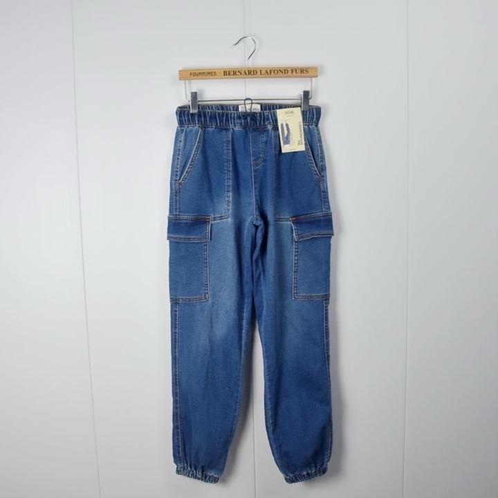 джинсовые брюки-карго (джоггеры) синего цвета с эластичным поясом. Модель дополнена накладными карманами по бокам и резинками на манжетах штанин. Артикул: 586607